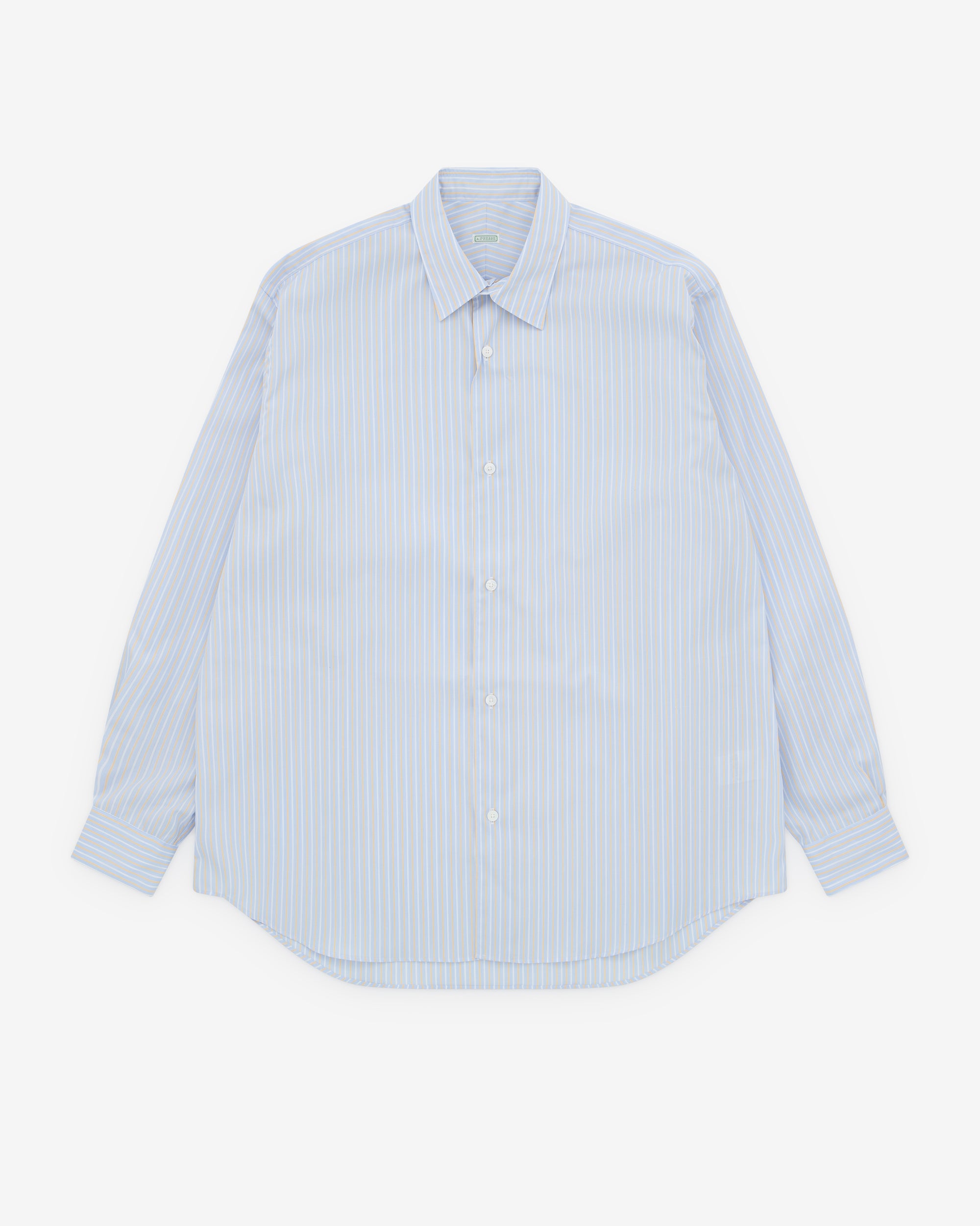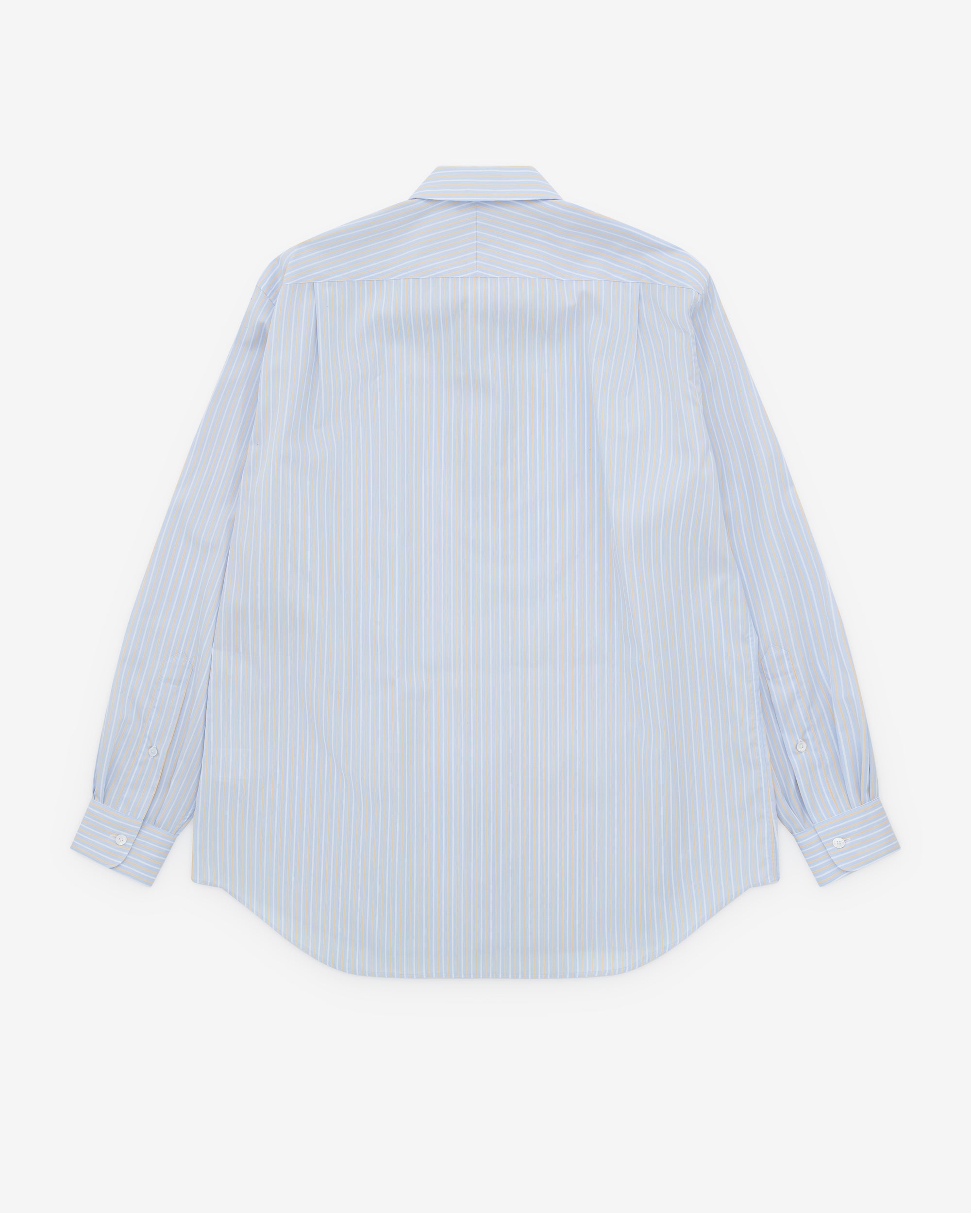 Poplin striped fabricPoint collarFront button closureCurved, shirttail hemButton close cuffsDarted pleats at back