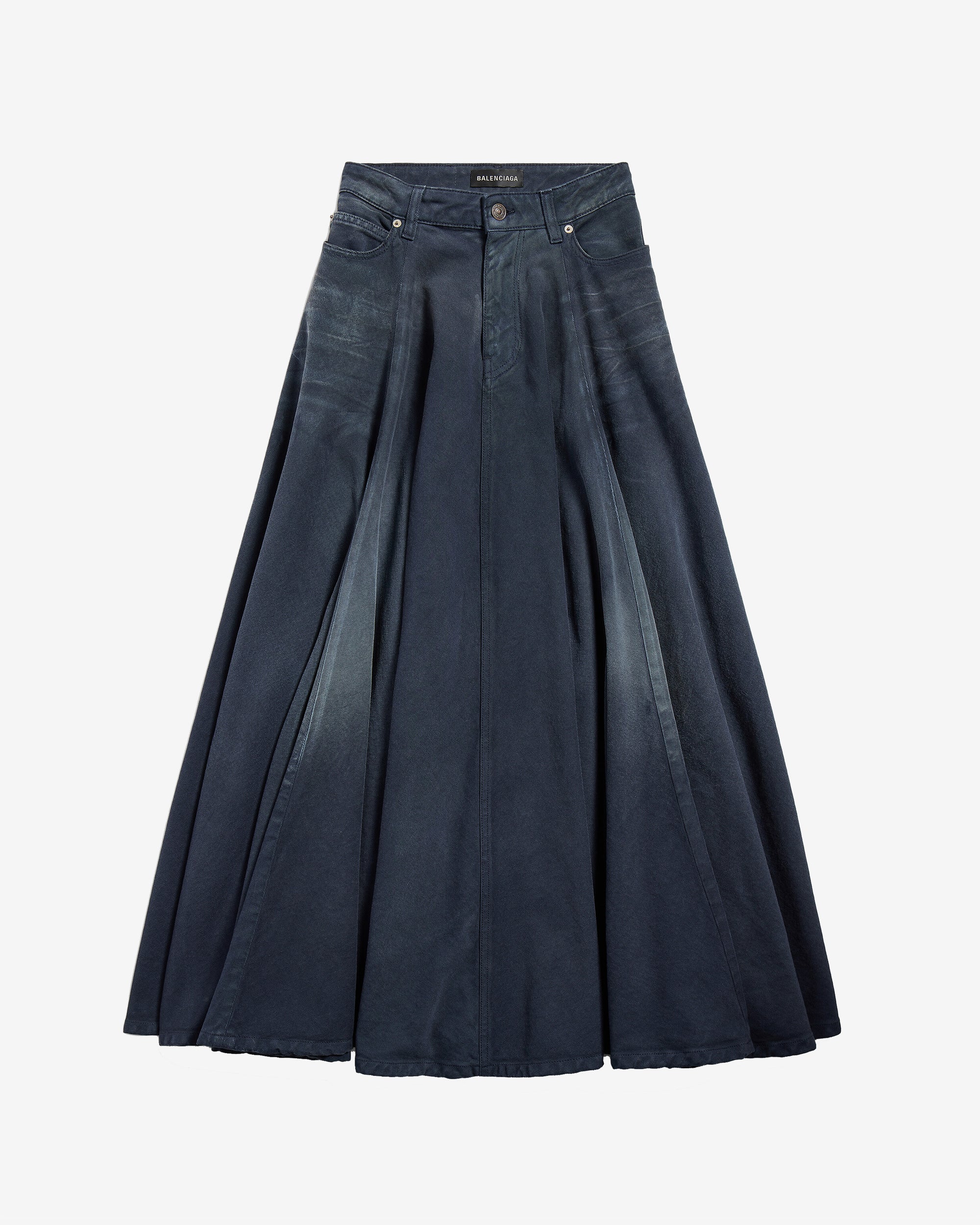 Cotton denimWashed and worn-out effectMid-waistCovered zip fly5 belt loops5 pocketsBalenciaga Jeans patch at backGodet shaped bottom100% CottonMade in Japan