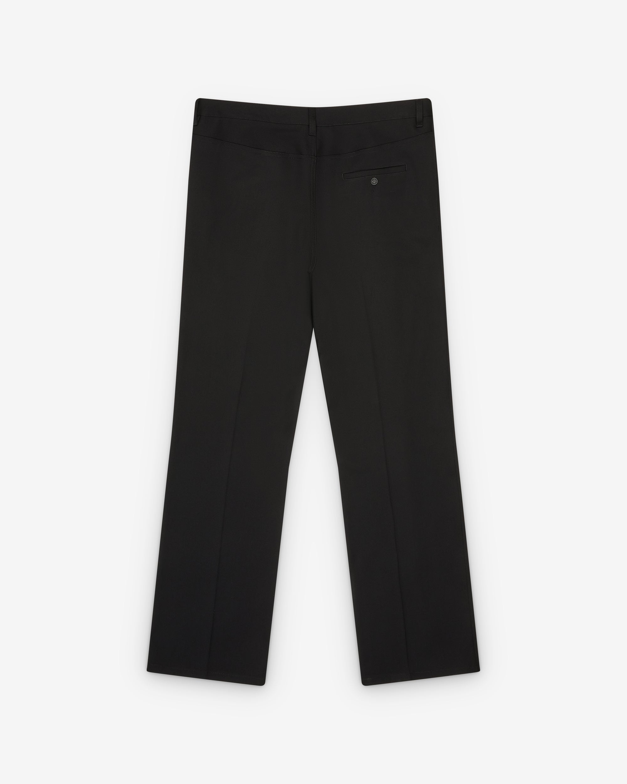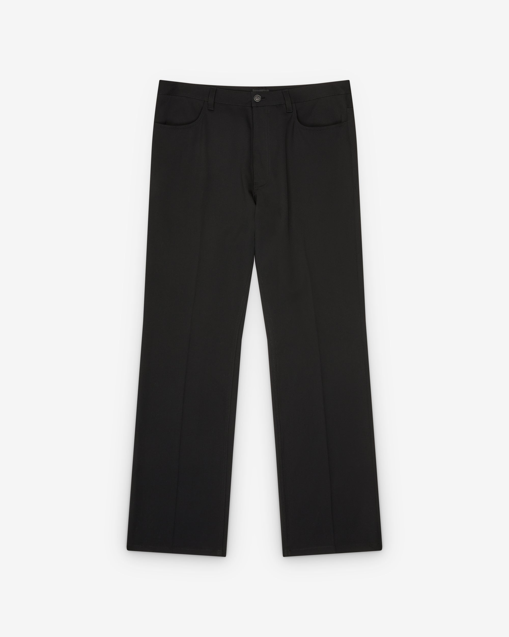 Stretch wool twillMid-waistCovered zip fly5 belt loops2 slash pockets at front1 buttoned pocket at backCreased leg98% Wool, 2% ElastaneMade in Italy