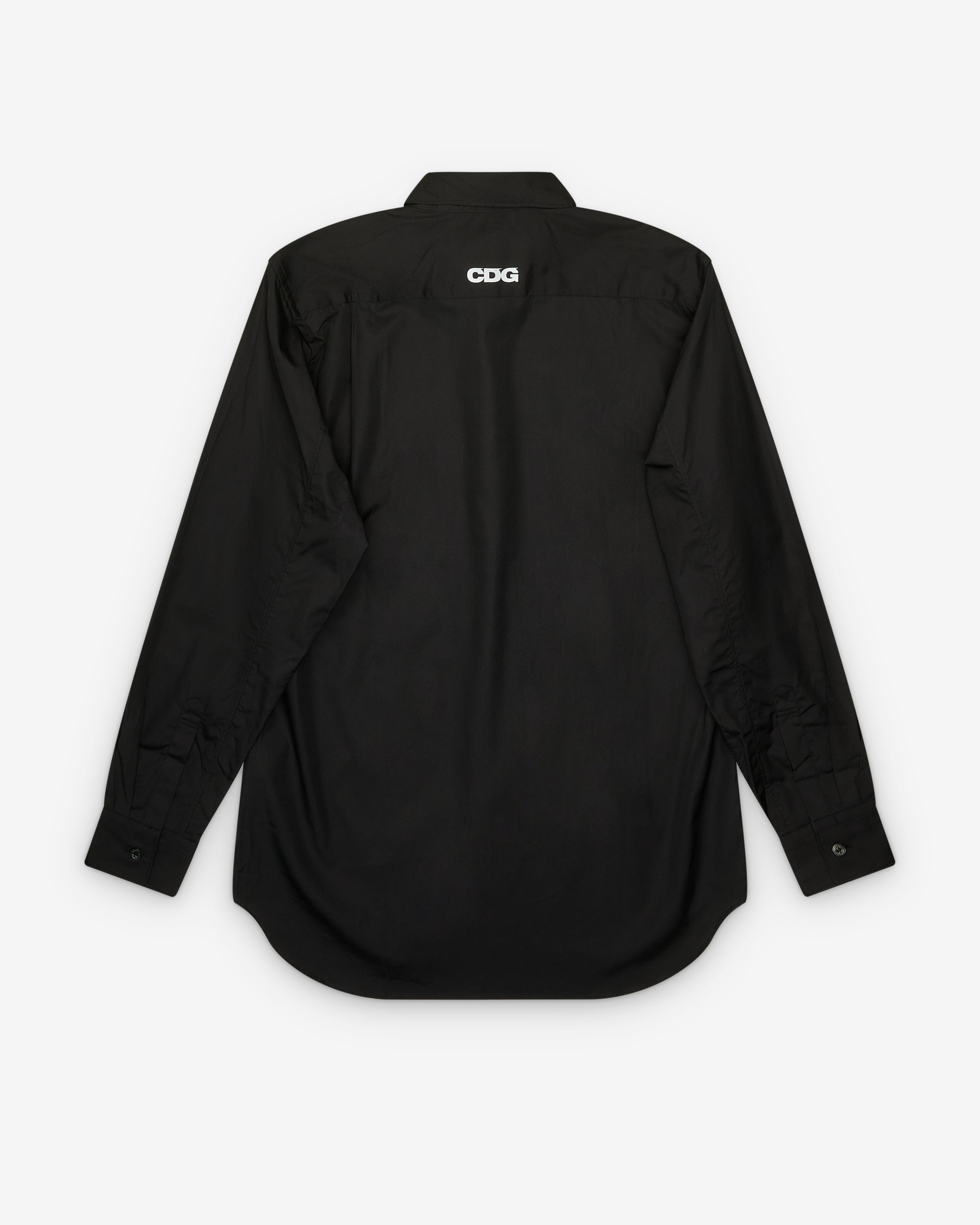 Point collarButton closureCurved hemButton cuffsPrinted logo at nape