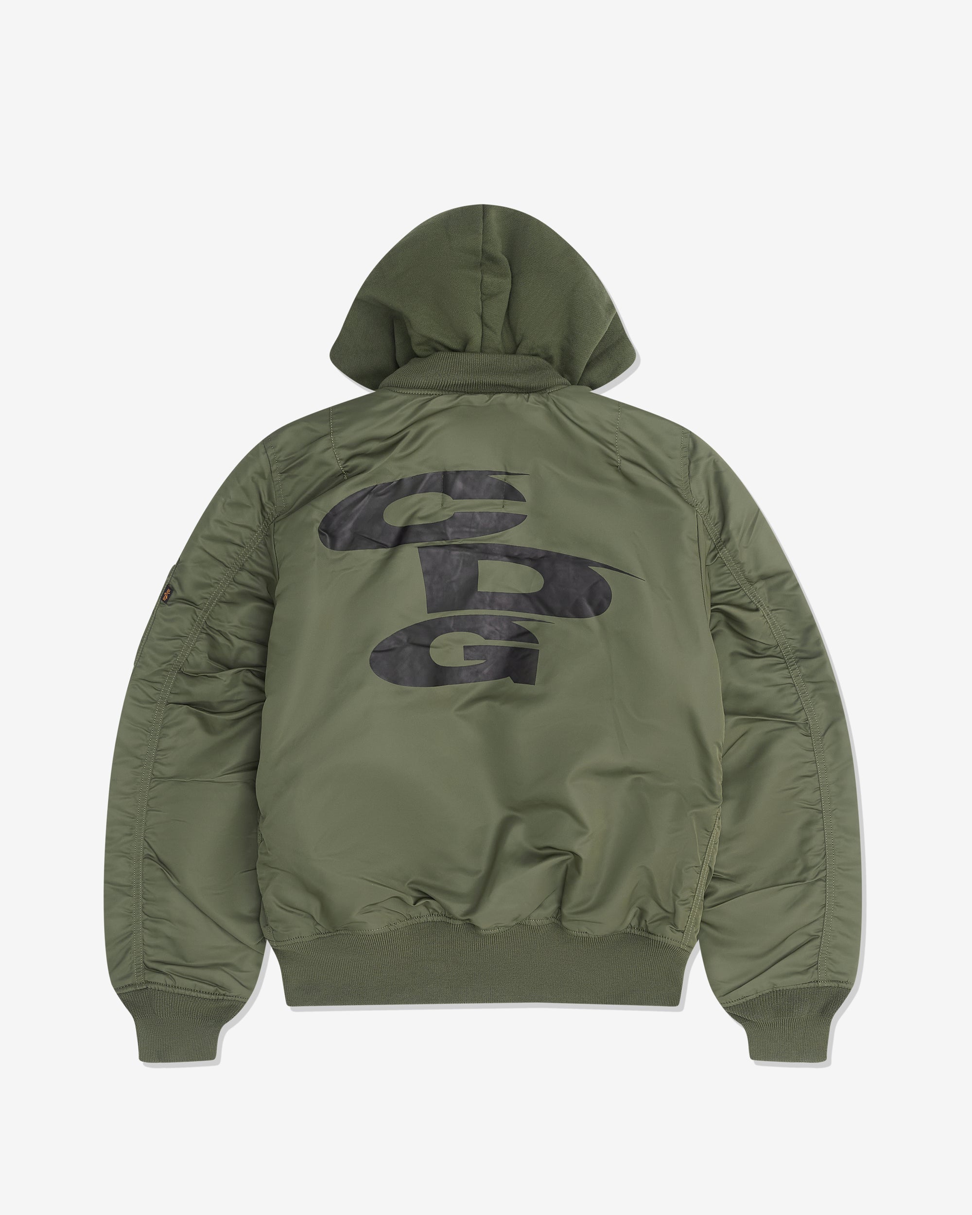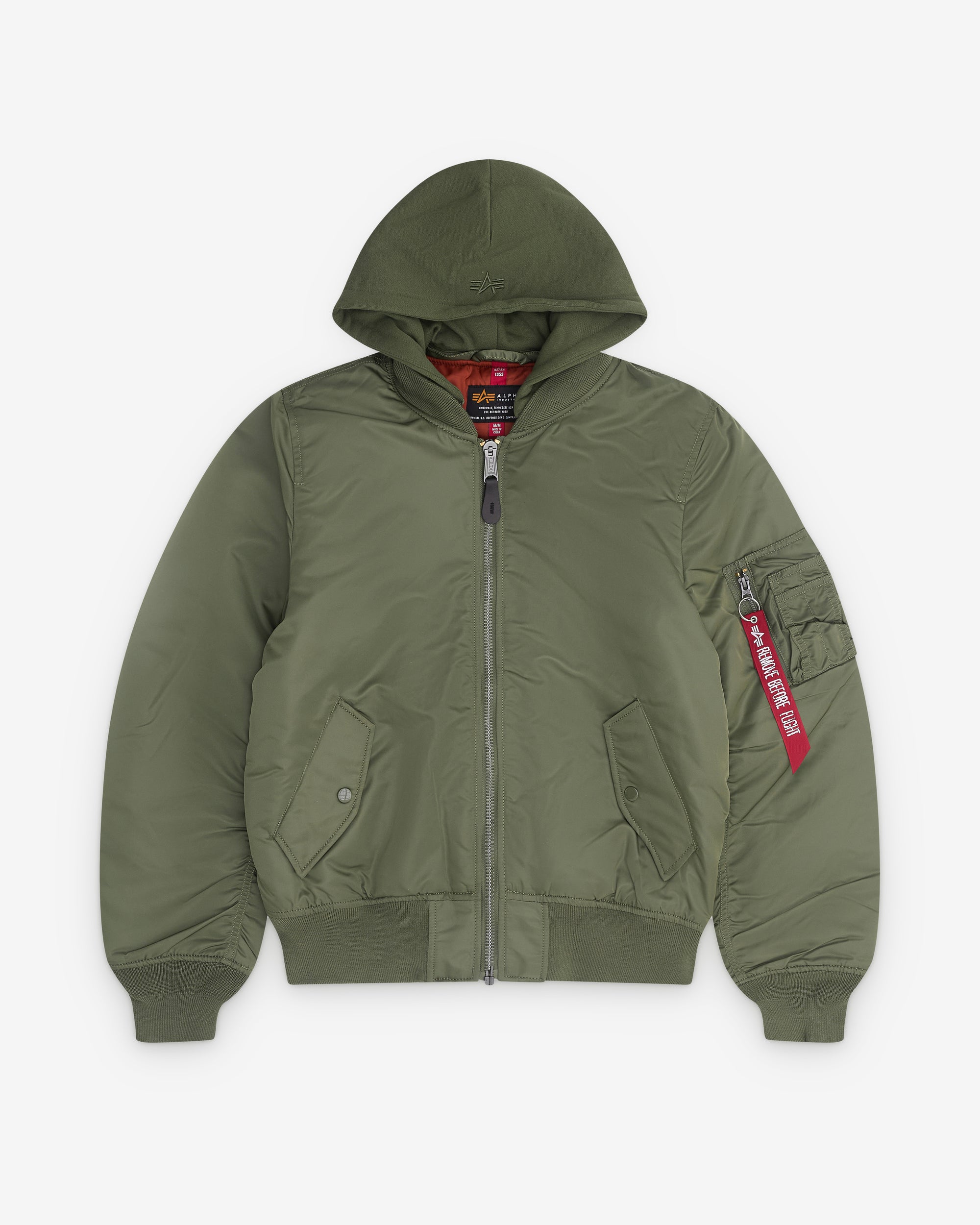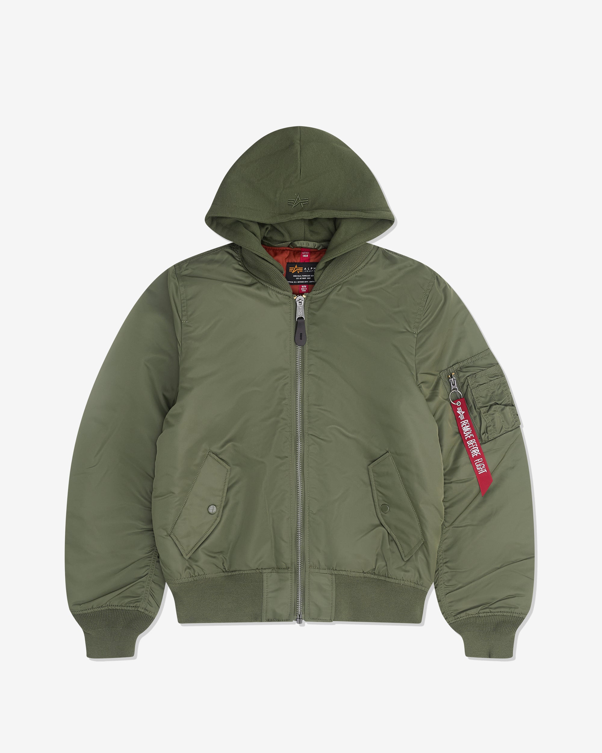 HoodedButton flap front pocketsRib knit trimsZip fasteningContrast liningRear printed graphics