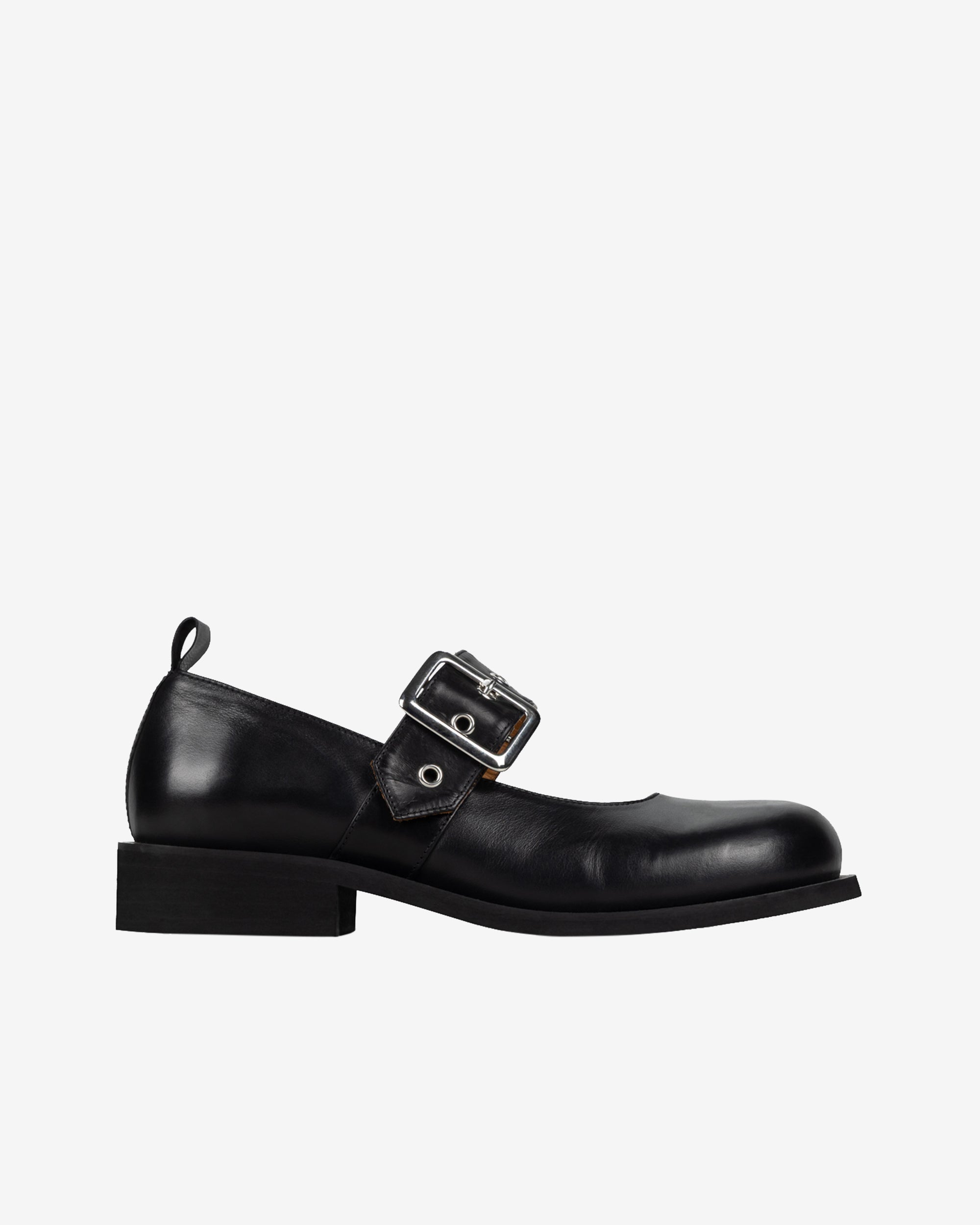 Mary Jane silhouetteSilver buckle and grommet detailsSmall heel100% LeatherMade in Italy