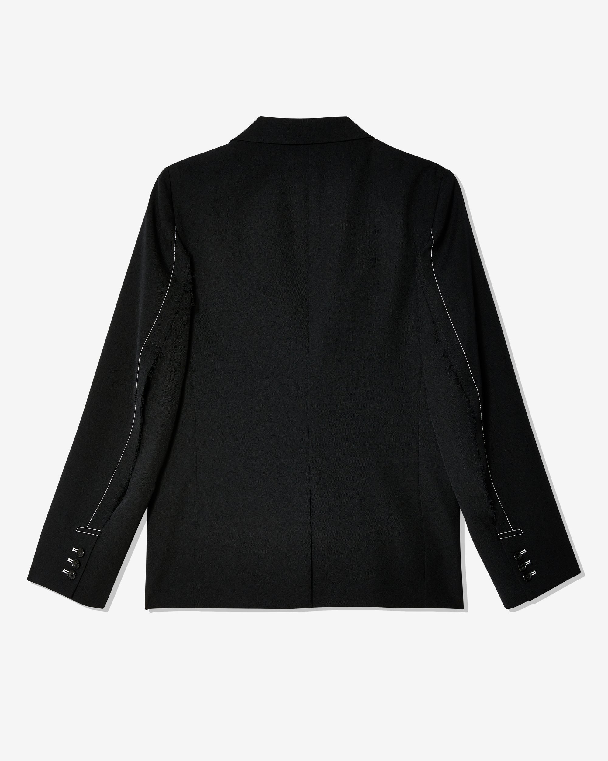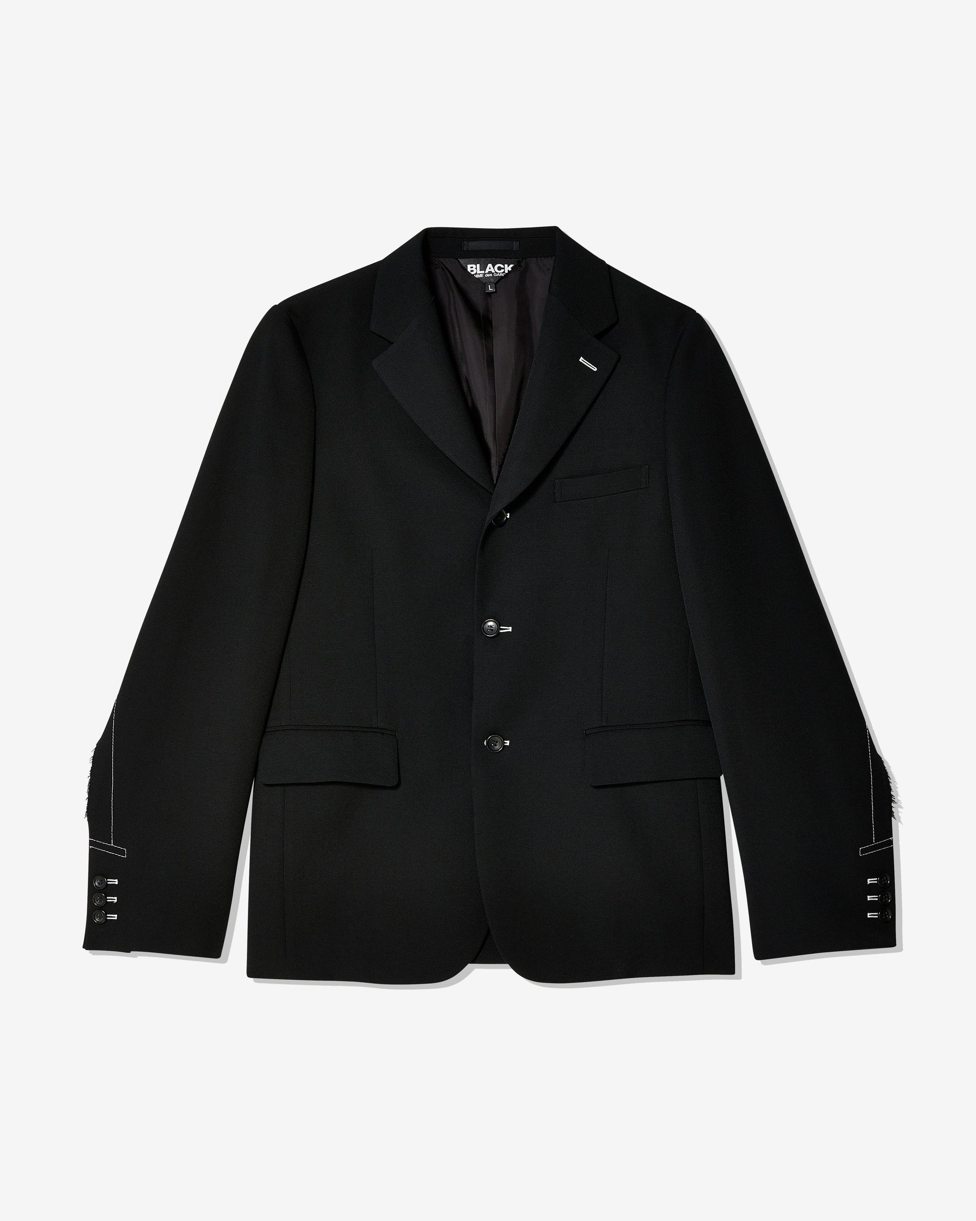 Notched lapelChest welt pocketsDarted frontTwo side pocketsThree button fasteningContrast white stitching