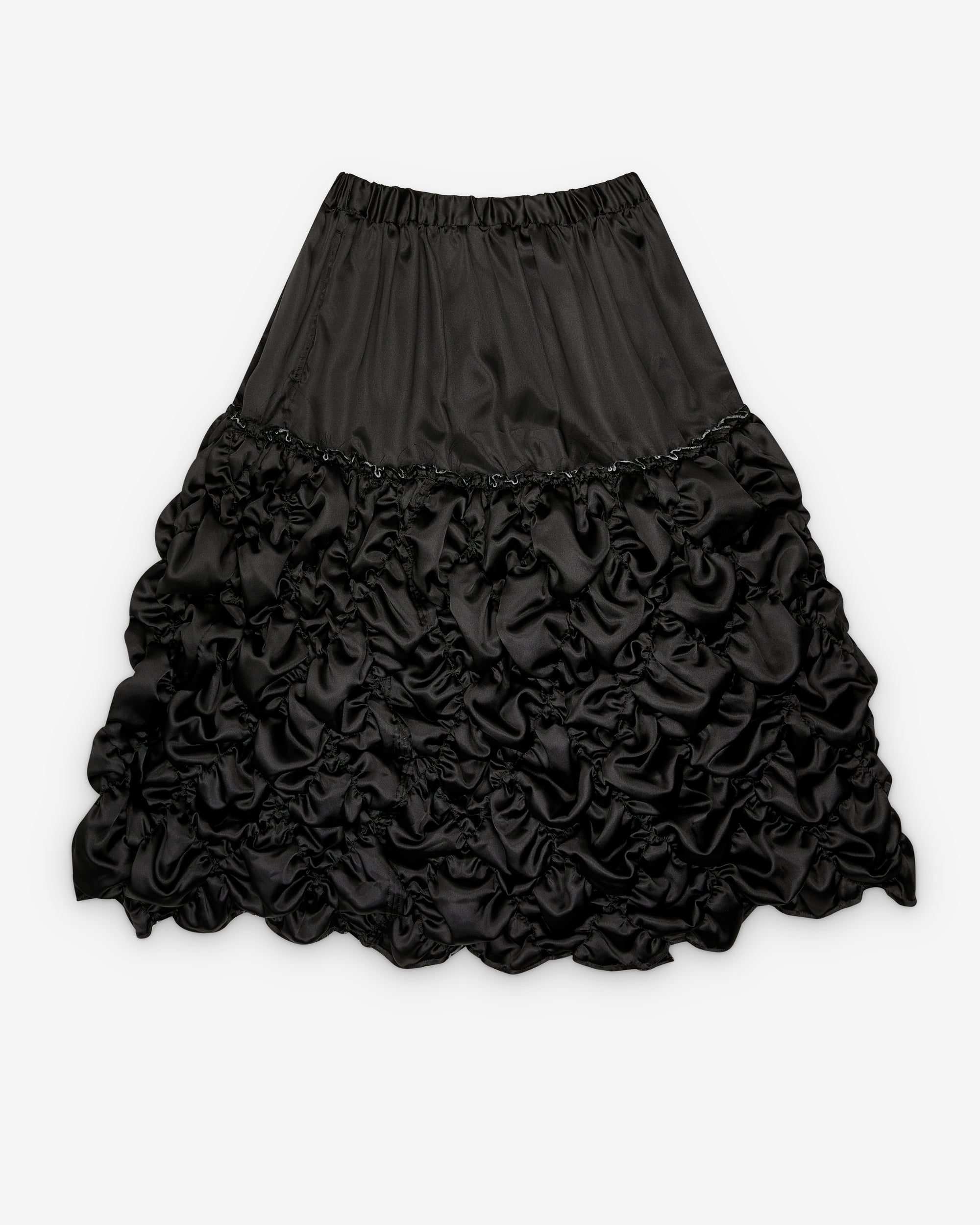 Elasticated waistSide seam pocketsMid-lengthGathered PanelRaw edge detail