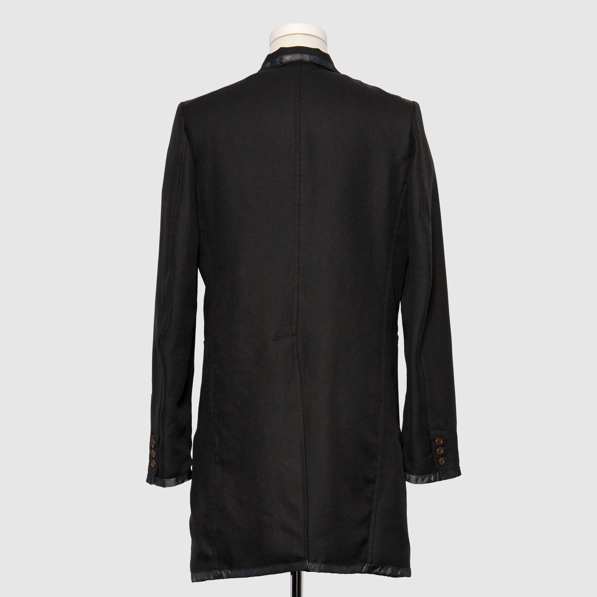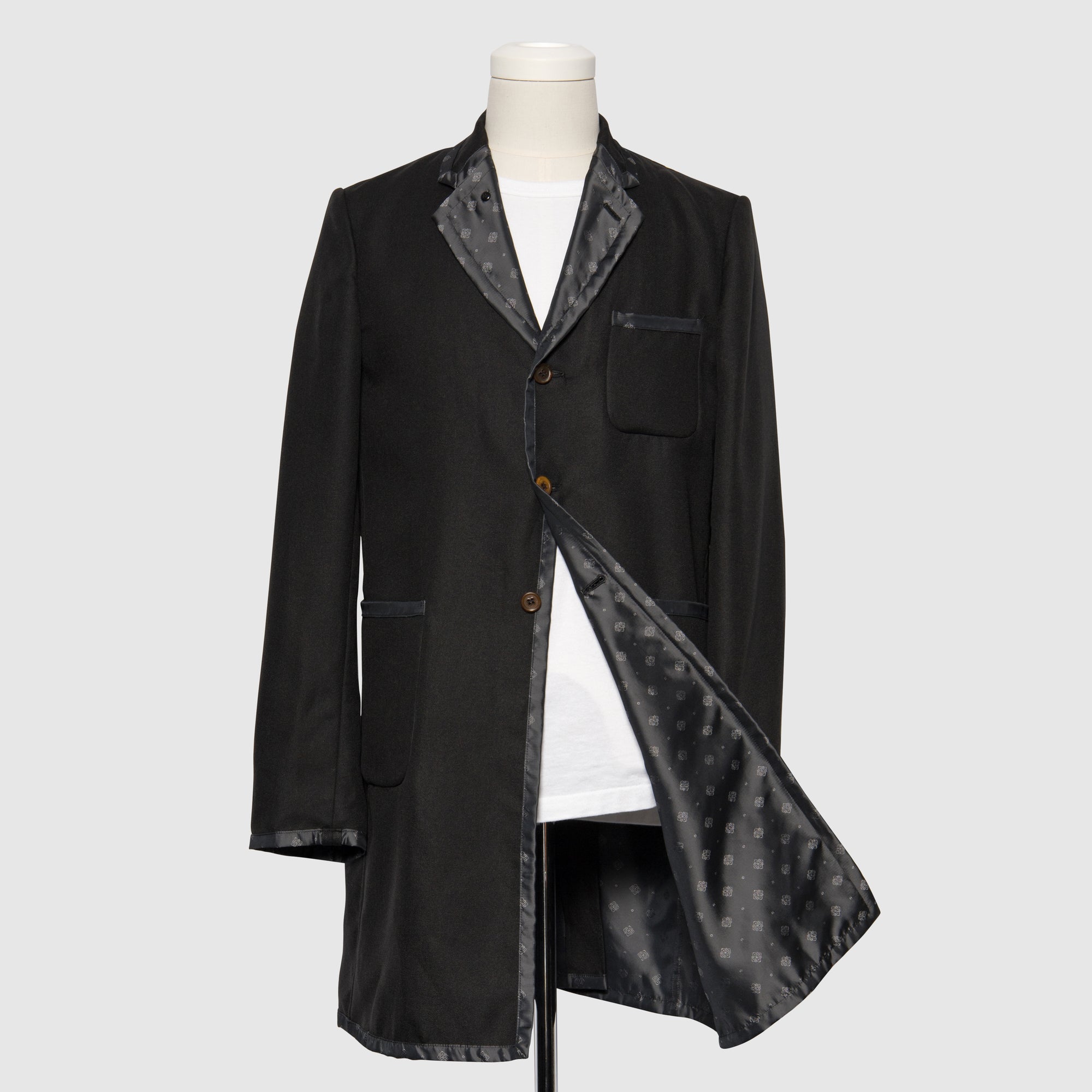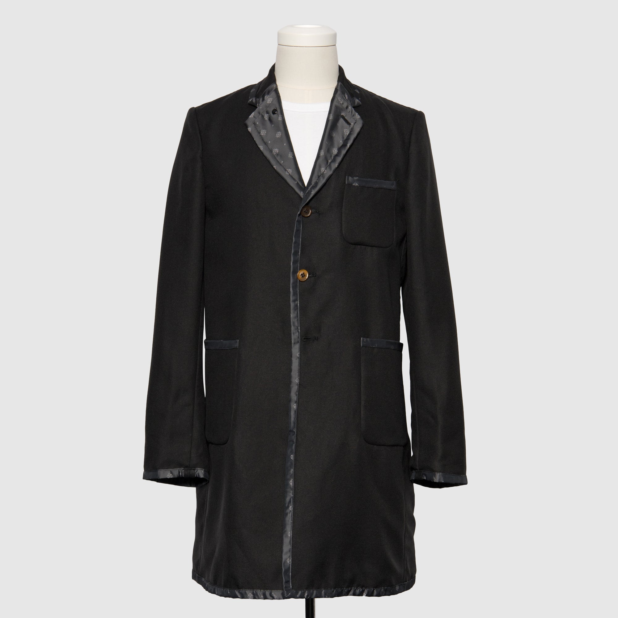 BLACK Comme des Garçons single breasted long jacket with silky cupro lining, classic collar, buttoned up close and cuffs, two pockets on the side, one chest pocket and single vent at the back.