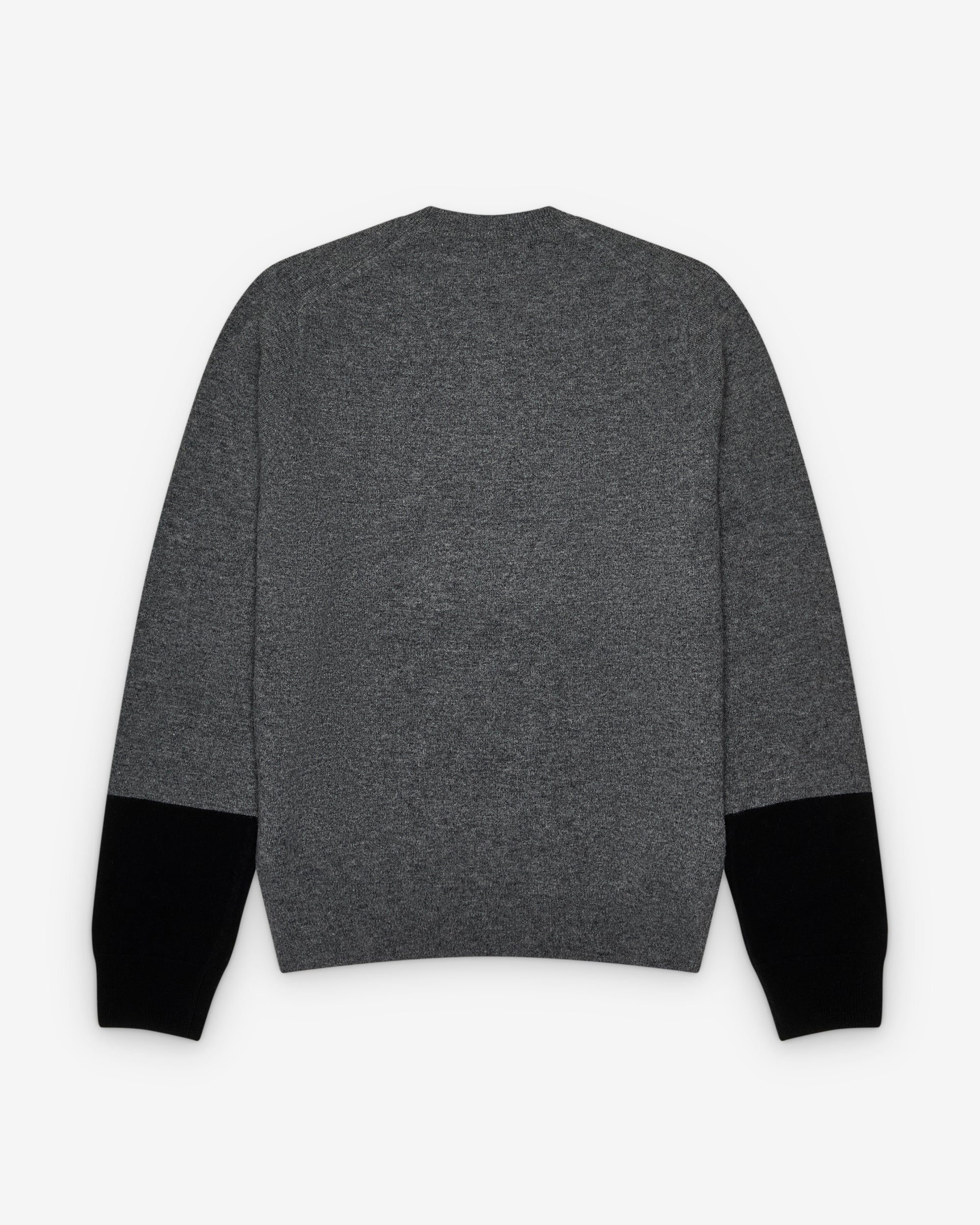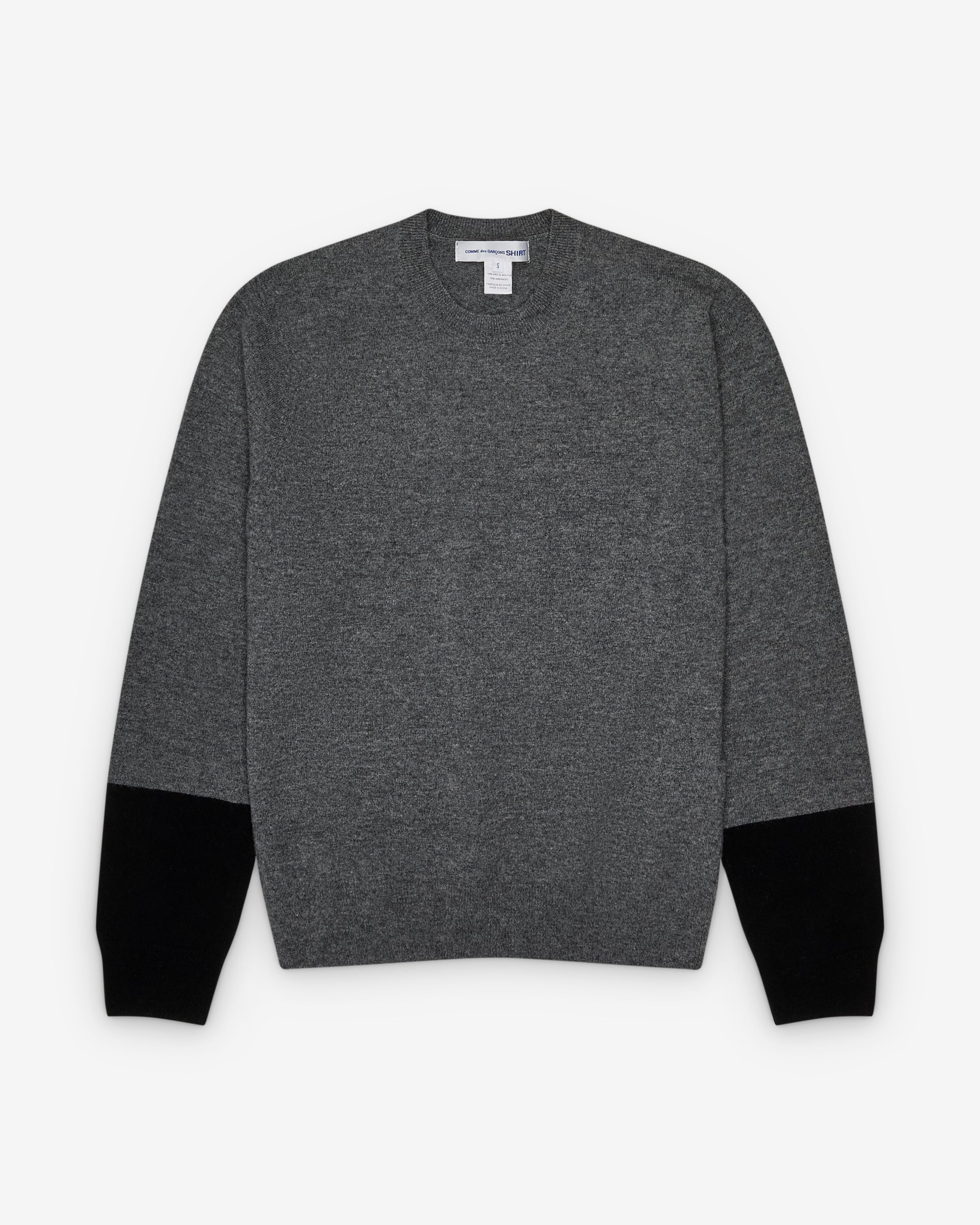 Fully fashioned knit pullover jumperRound-neckRibbed collar, cuffs, hemContrast lower sleeves100% LambswoolMade in France