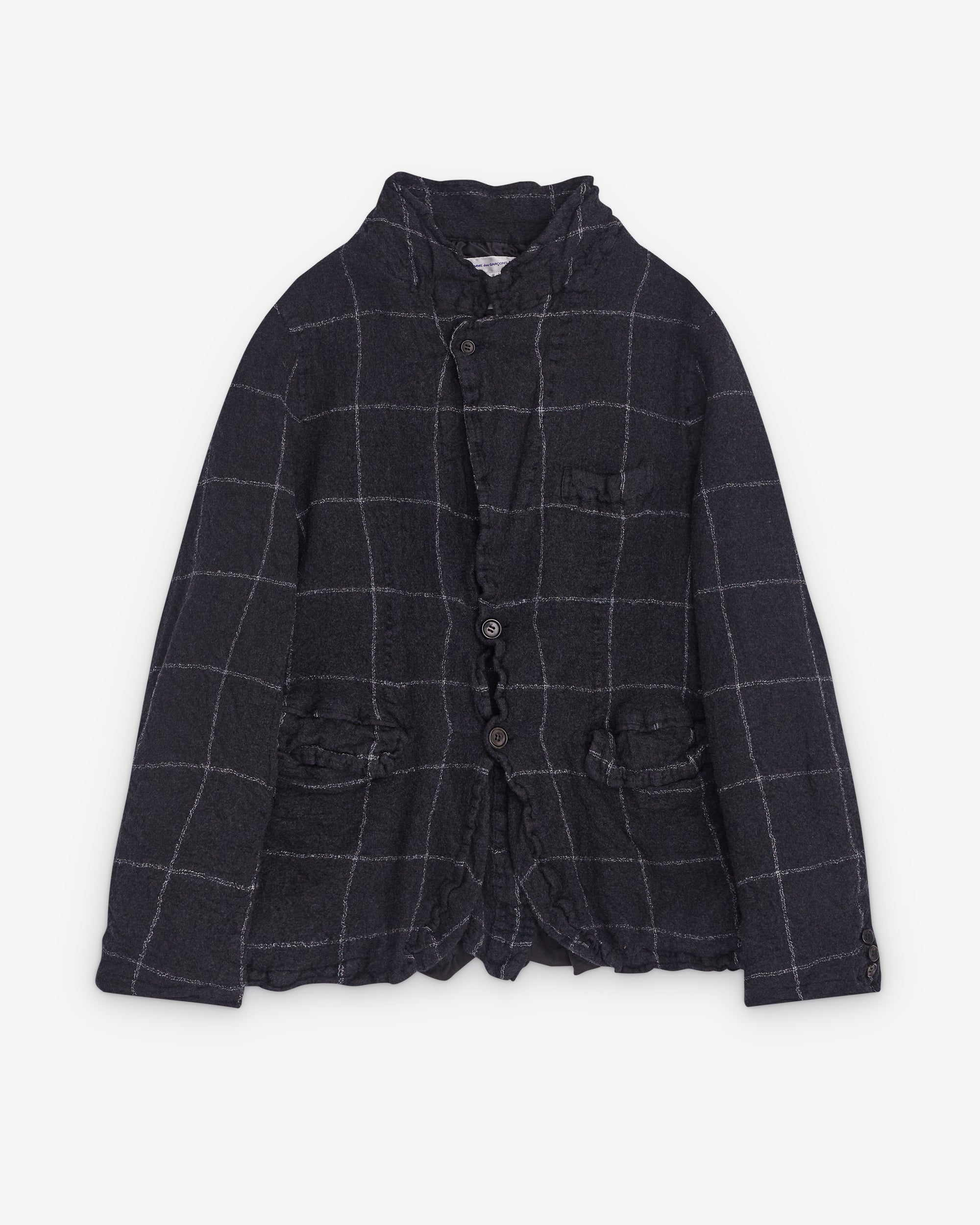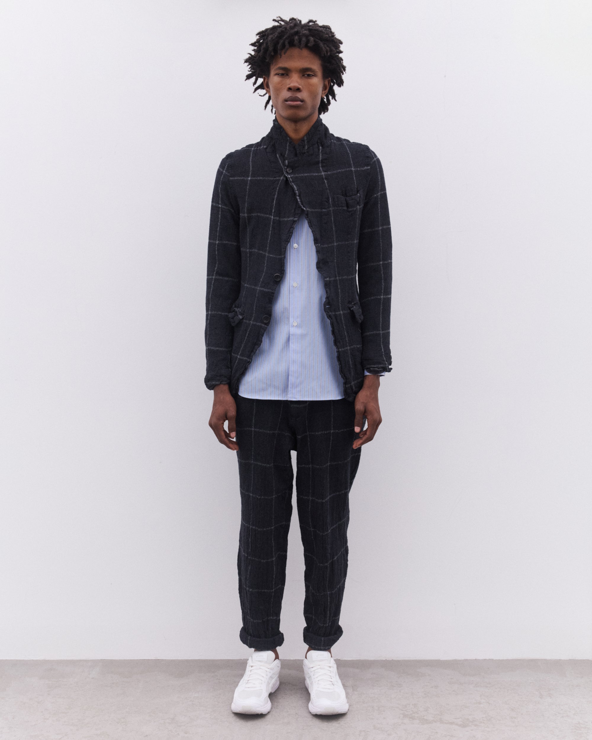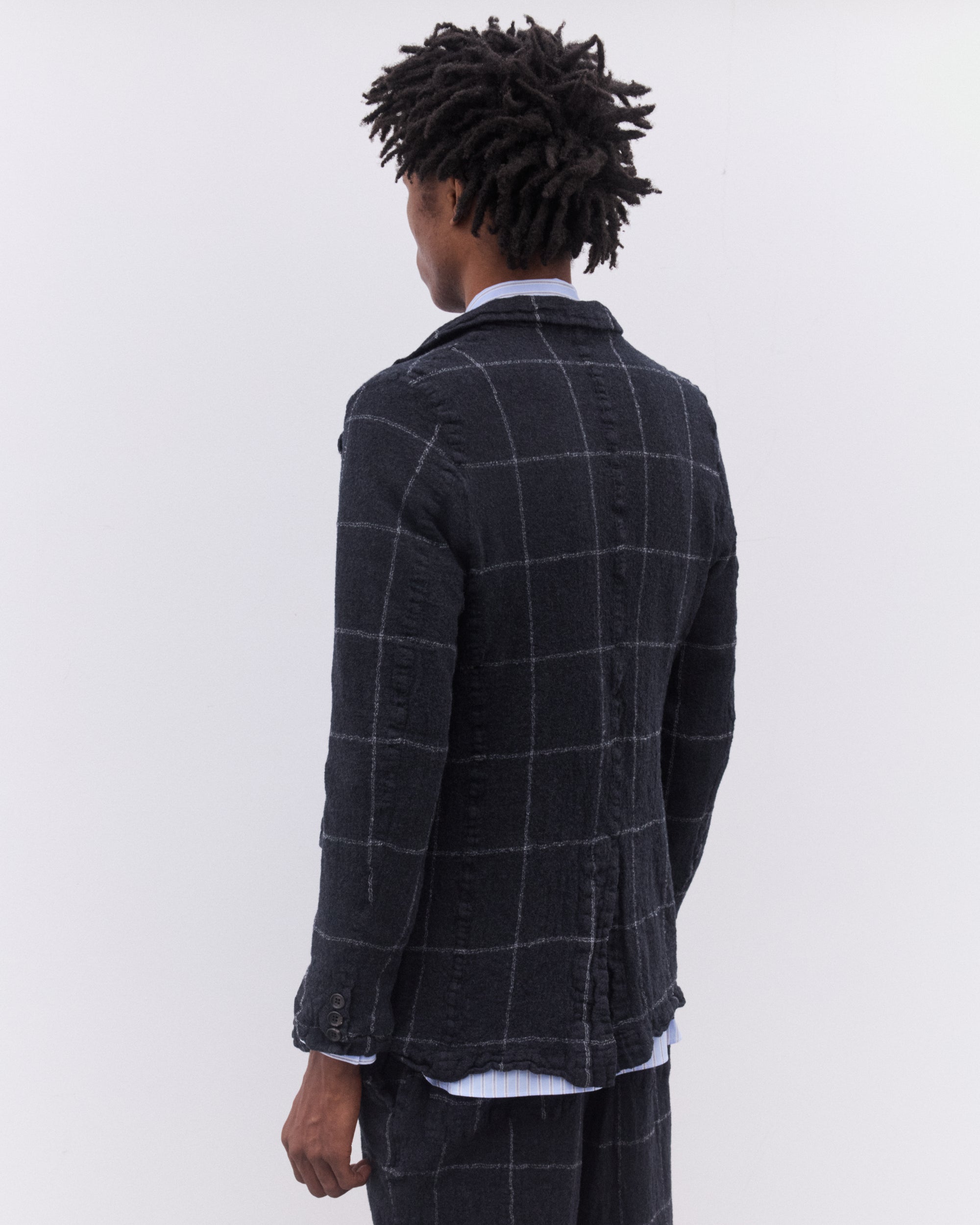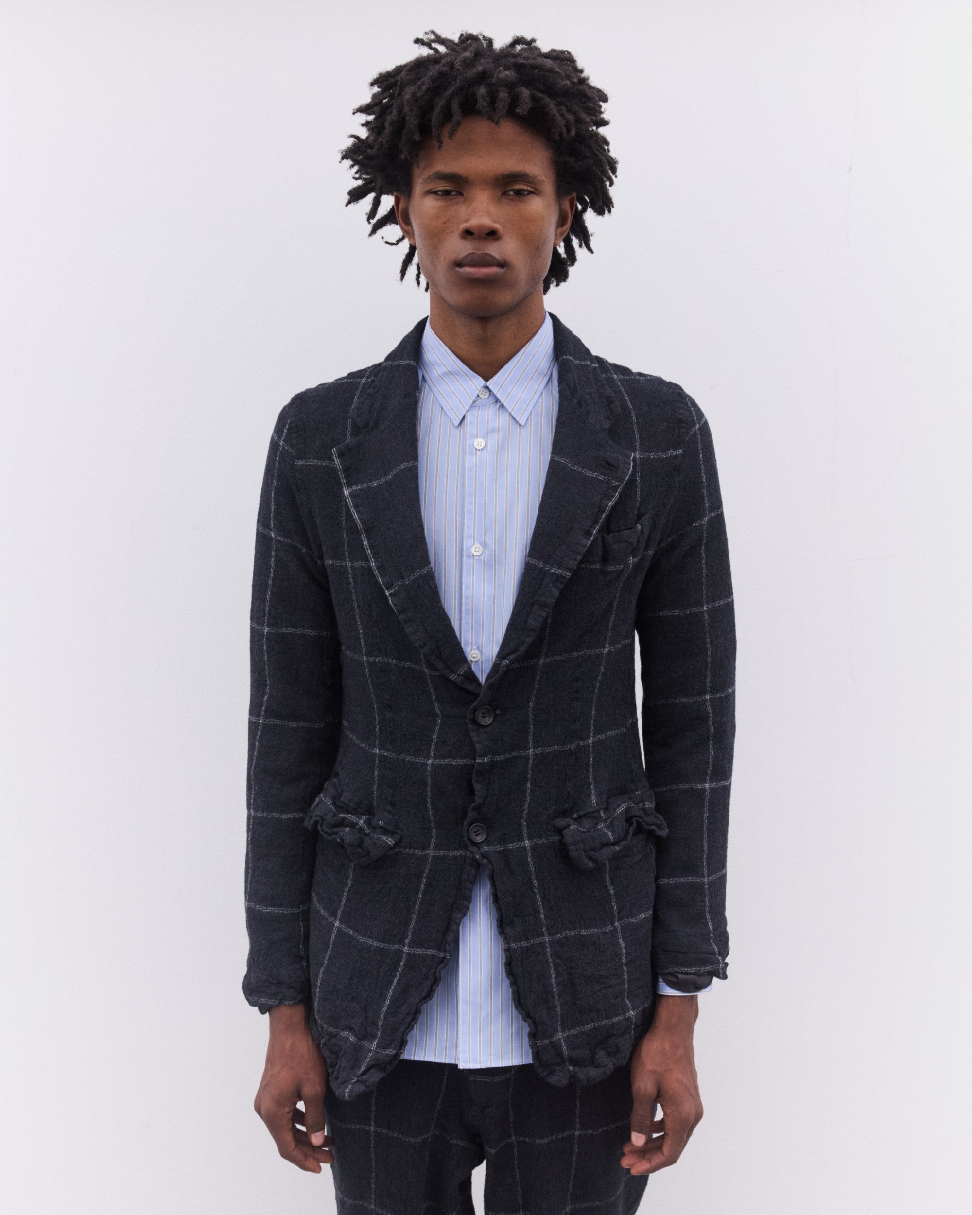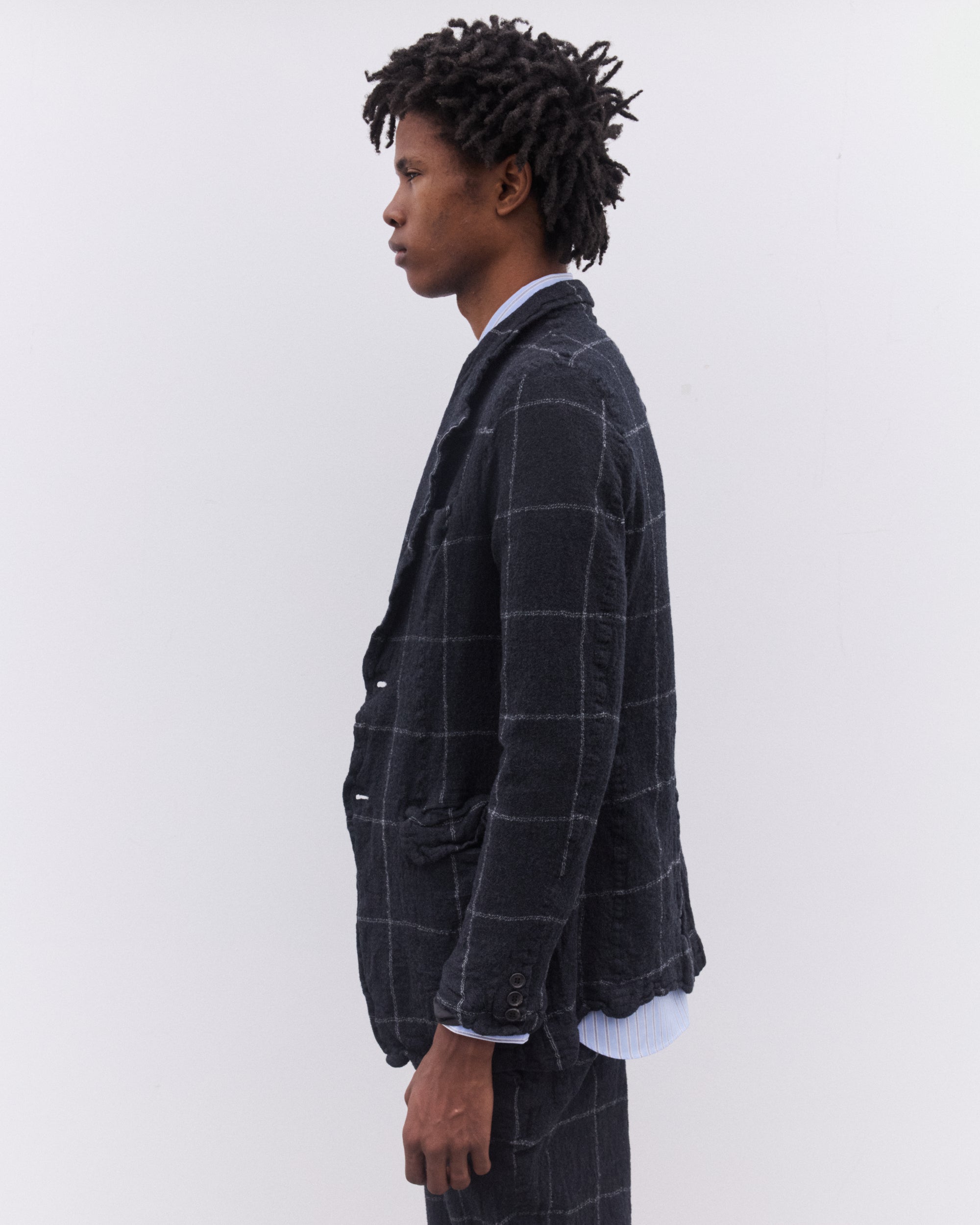 Notch lapelsButton closureFlap pocketChest welt pocketGarment treated fabricationUnlinedWashed finish100% WoolMade in Japan