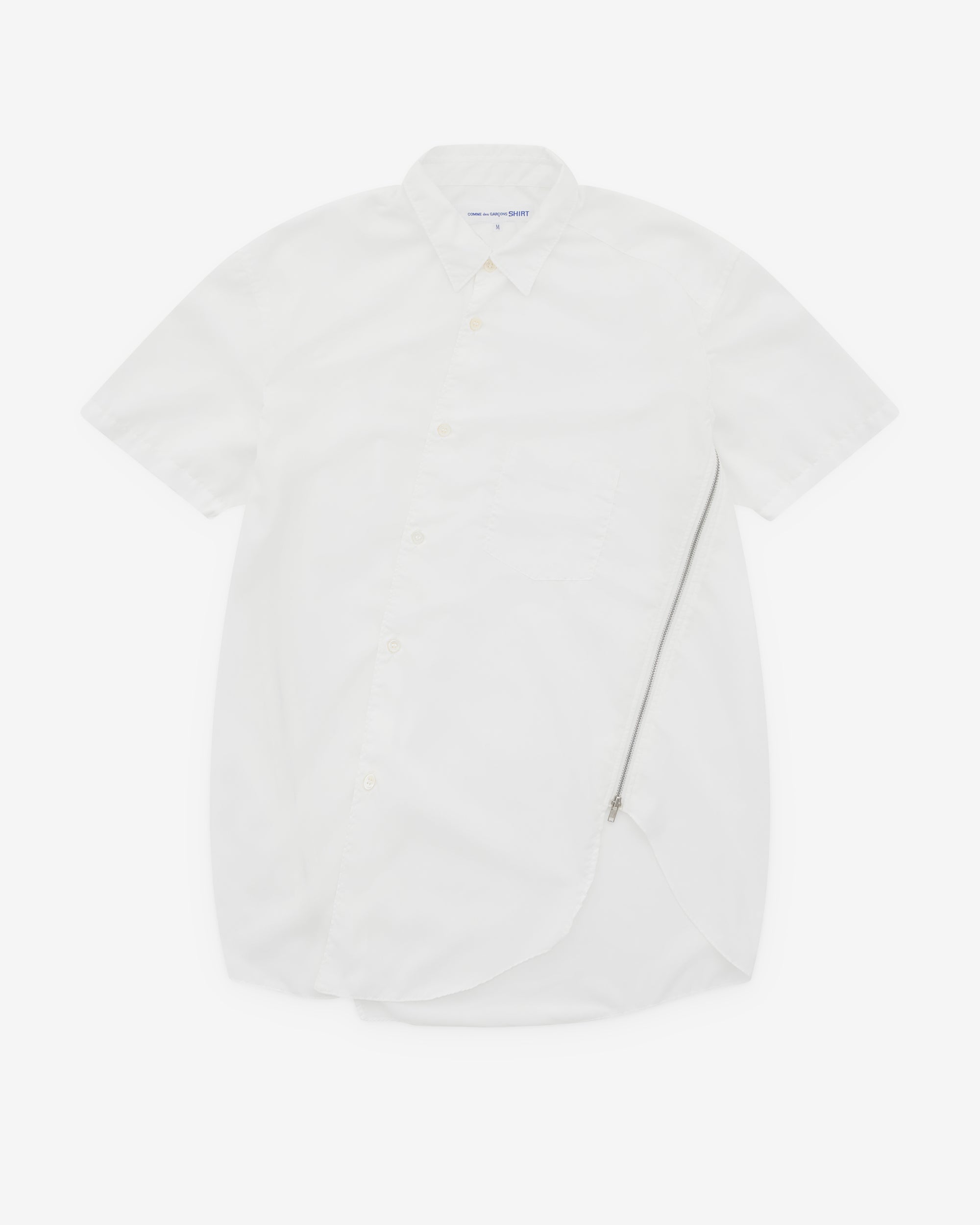 Point collarAsymmetric button placketShort sleevesAdjustable side zipCurved hem