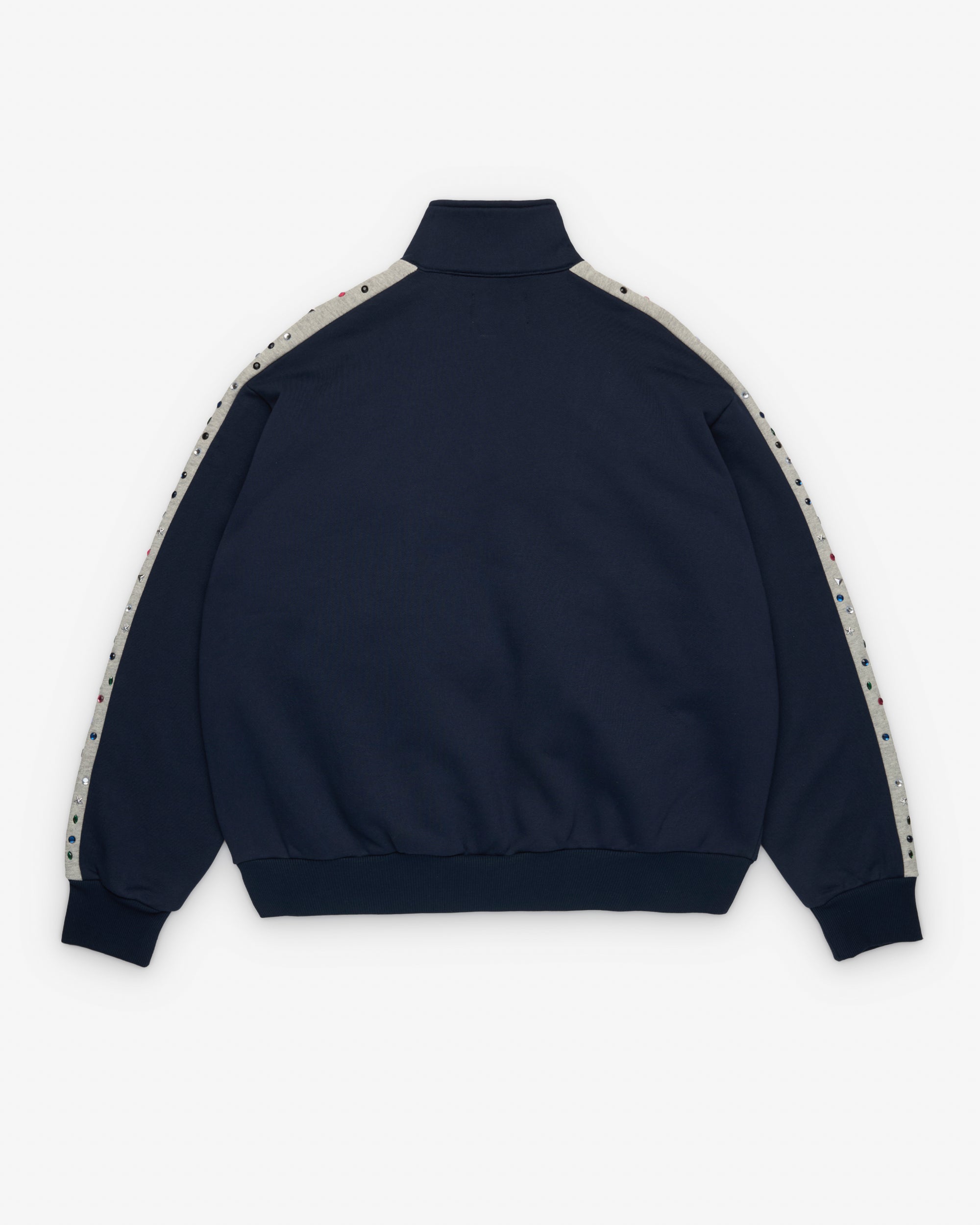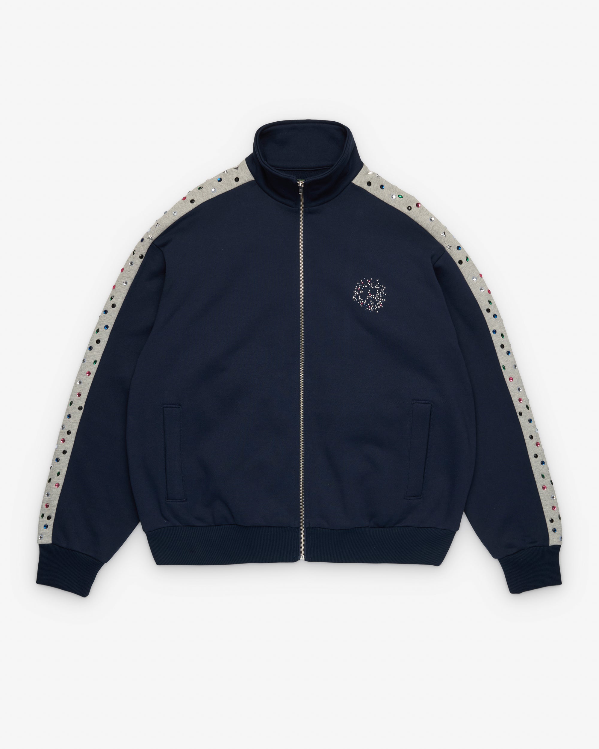 Diamantes on chest and sleeveZip front closureClassic funnel neckRibbed hem and cuffs