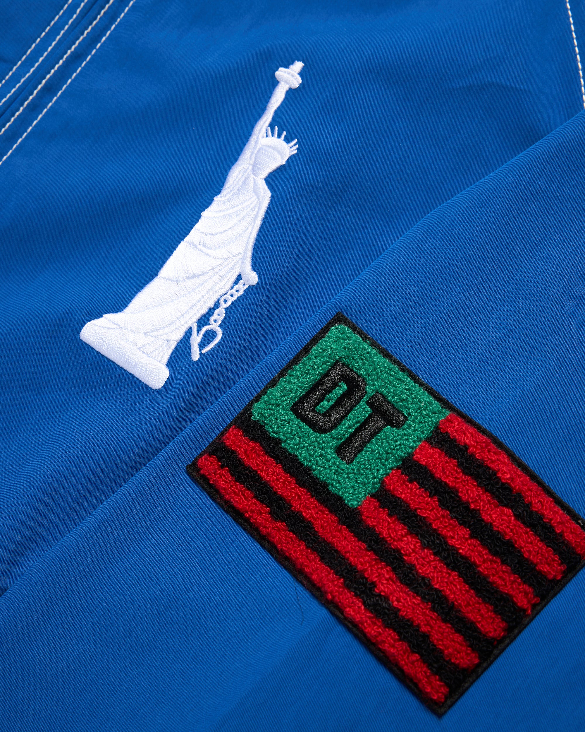 Drawstring hoodFront zip closureAngled front welt pocketsEmbroidered chest logoApplied sleeve patchPrinted sleeve numberingContrast topstitching100% CottonMade in China