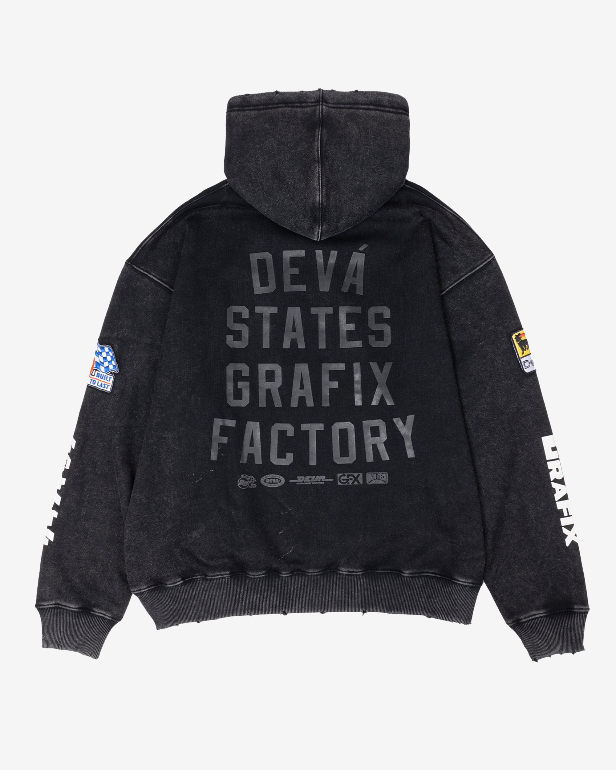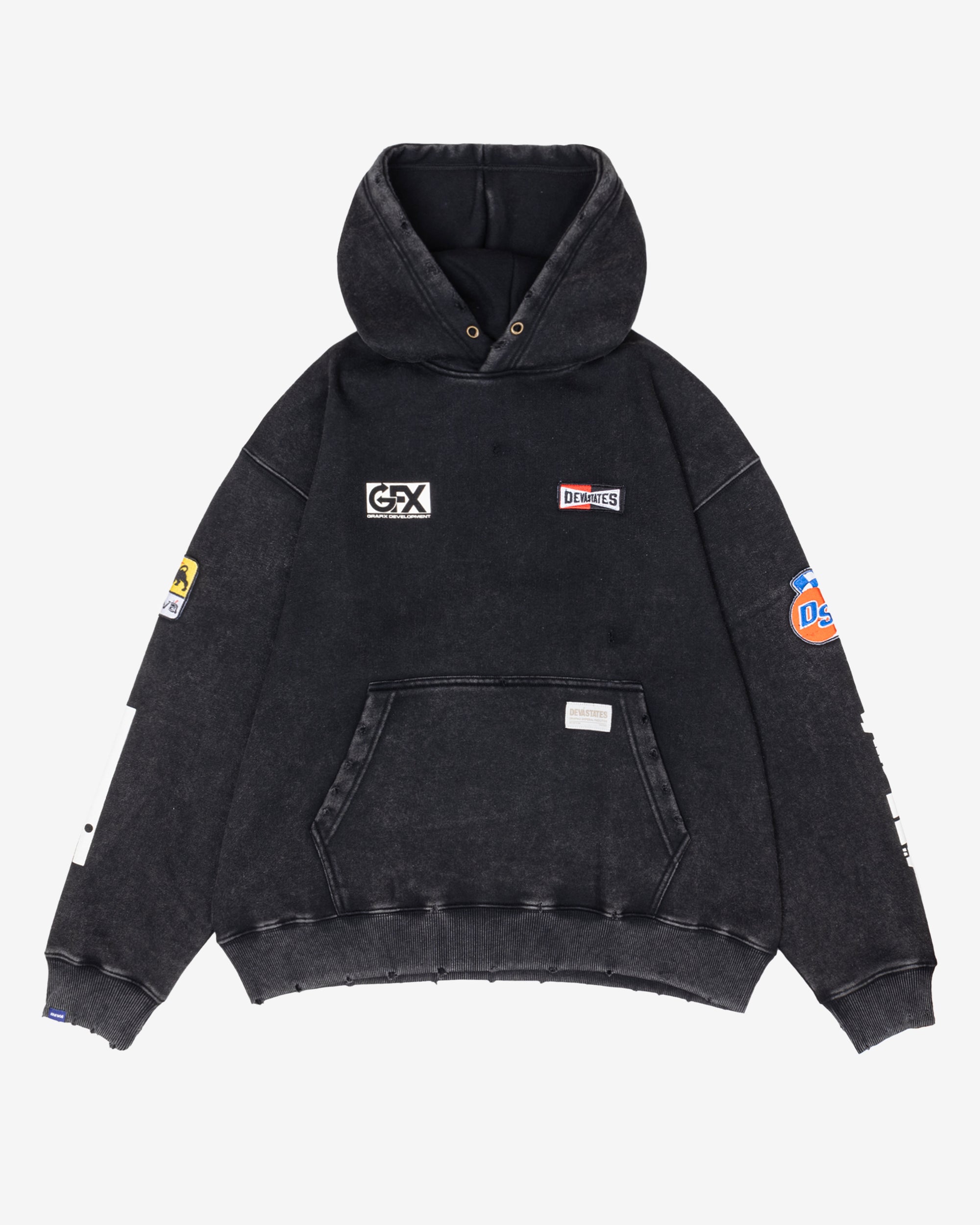 Boxy, drop shoulder fitPre-shrunk to minimize shrinkageFull zip closureDistressed effect throughoutScreen printed graphic patches with unfinished stitchings