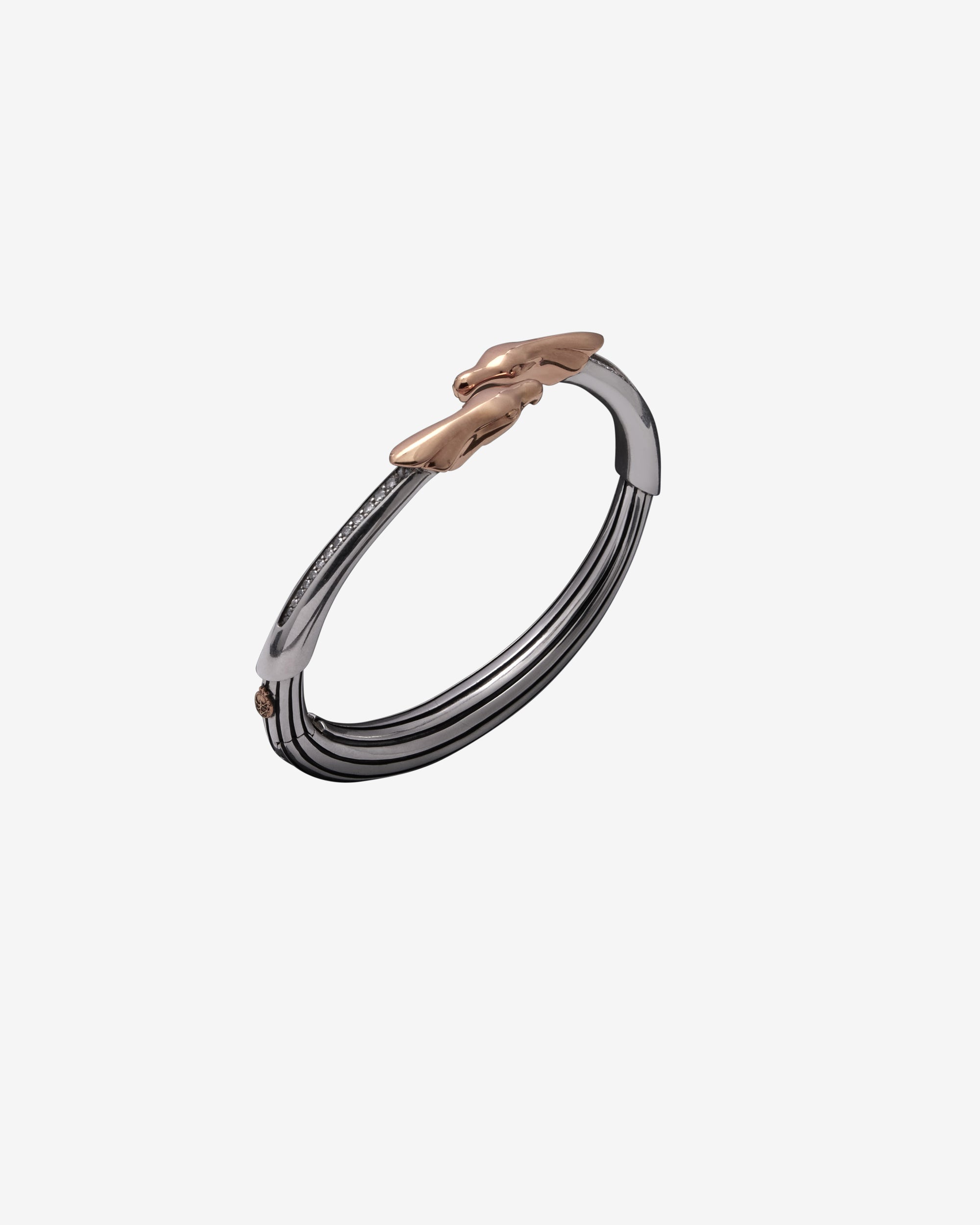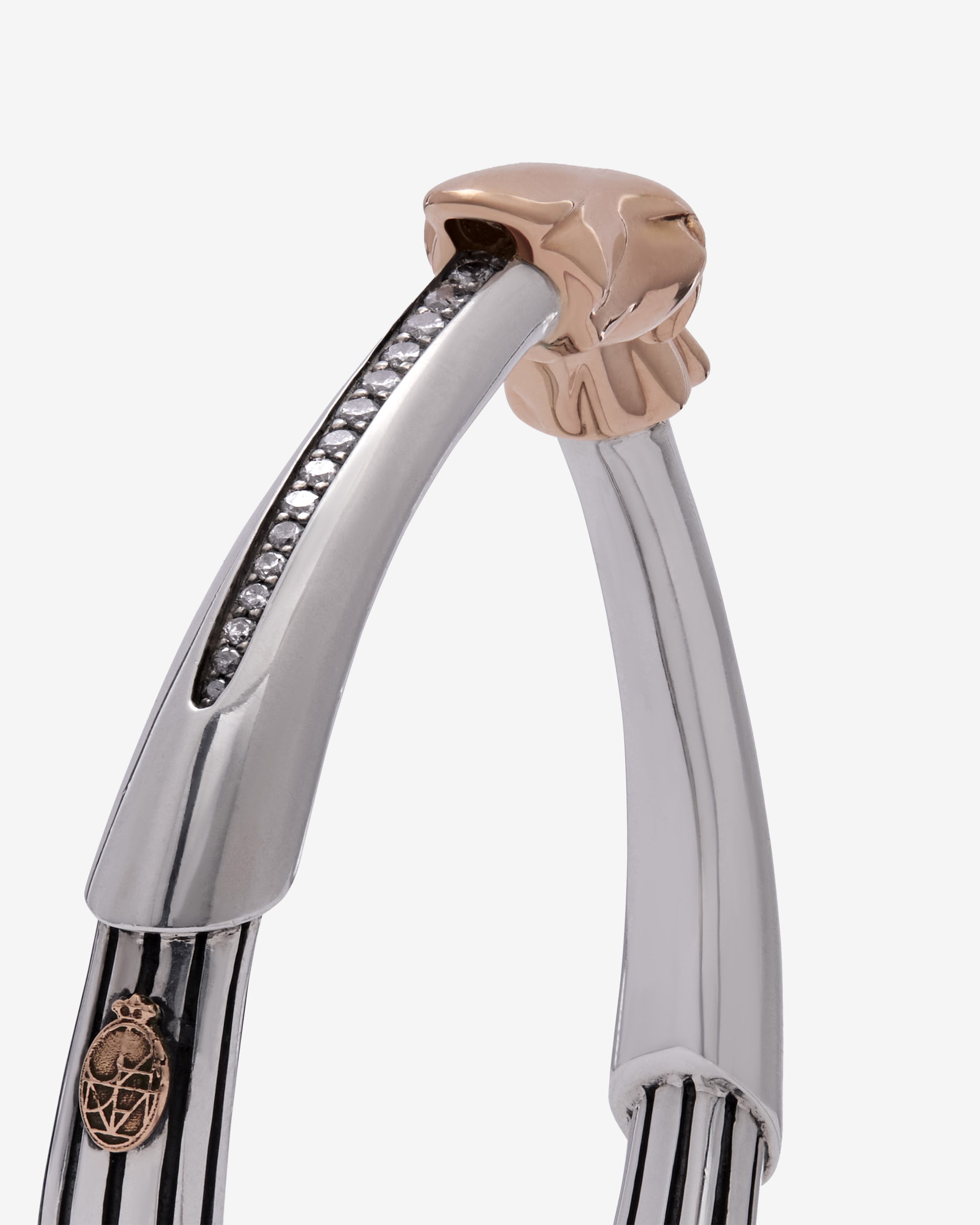 Polished silver .925 cuff18k rose gold tipsGrey pave diamonds 0.6 caratsSilver engraved brand crestMade in USA
