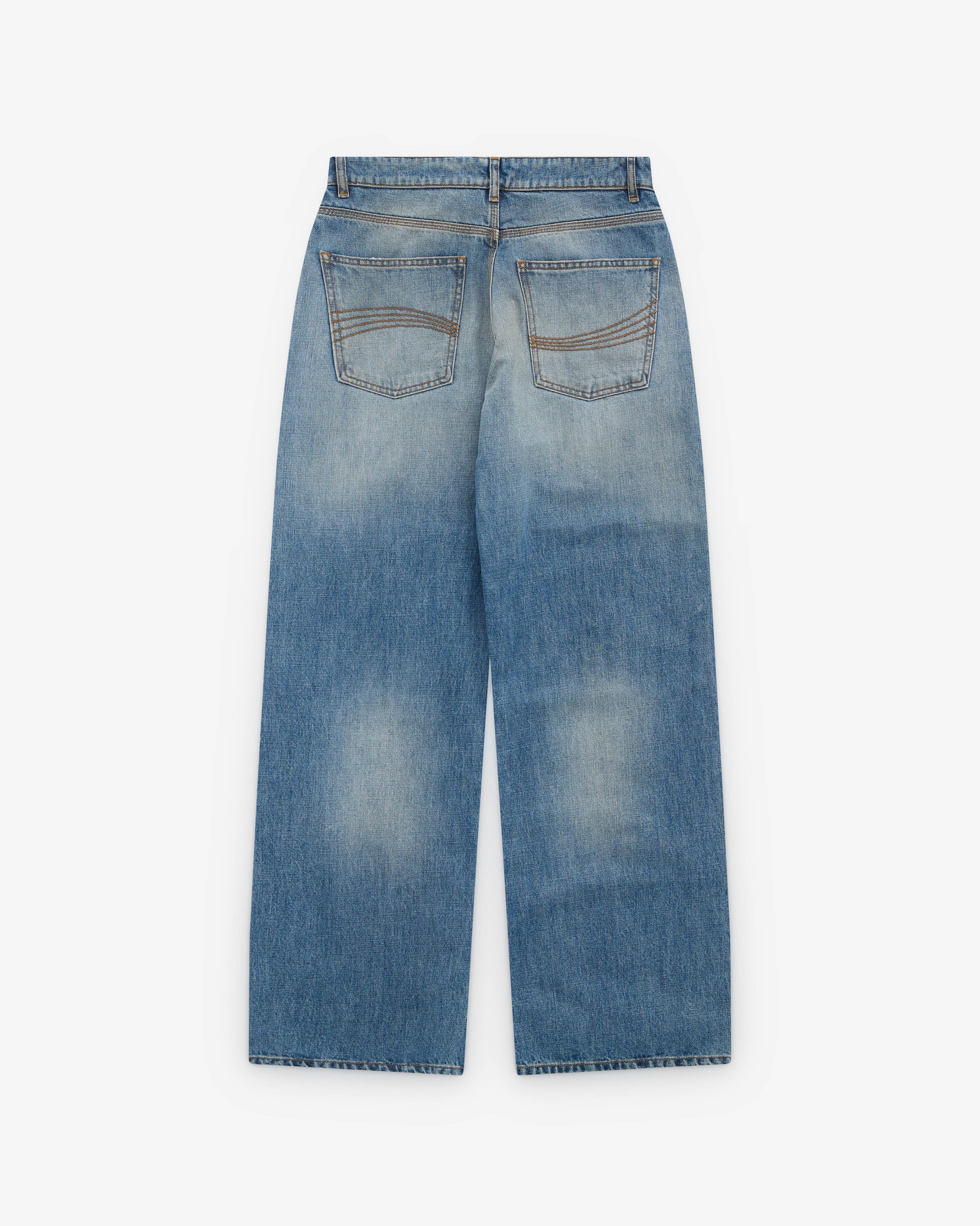 Straight legFaded wash5 pocket constructionButton and fly fastening Belt loops