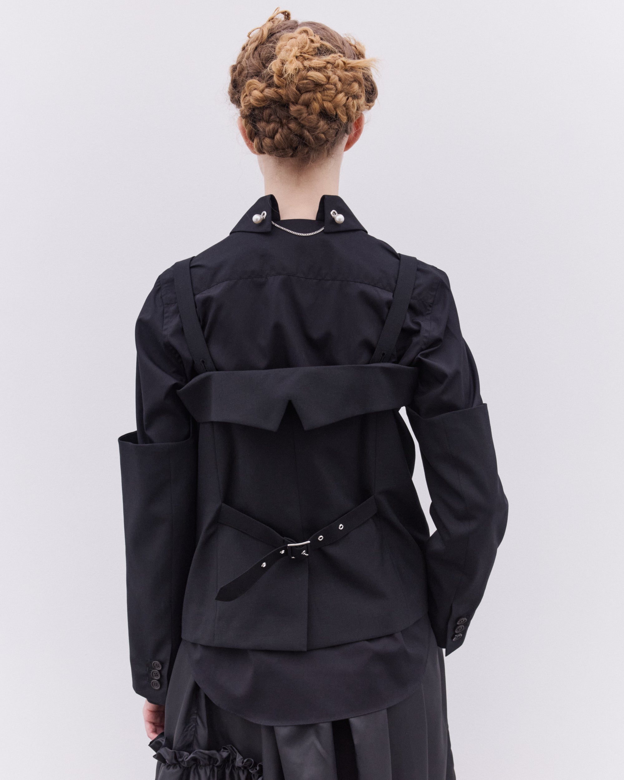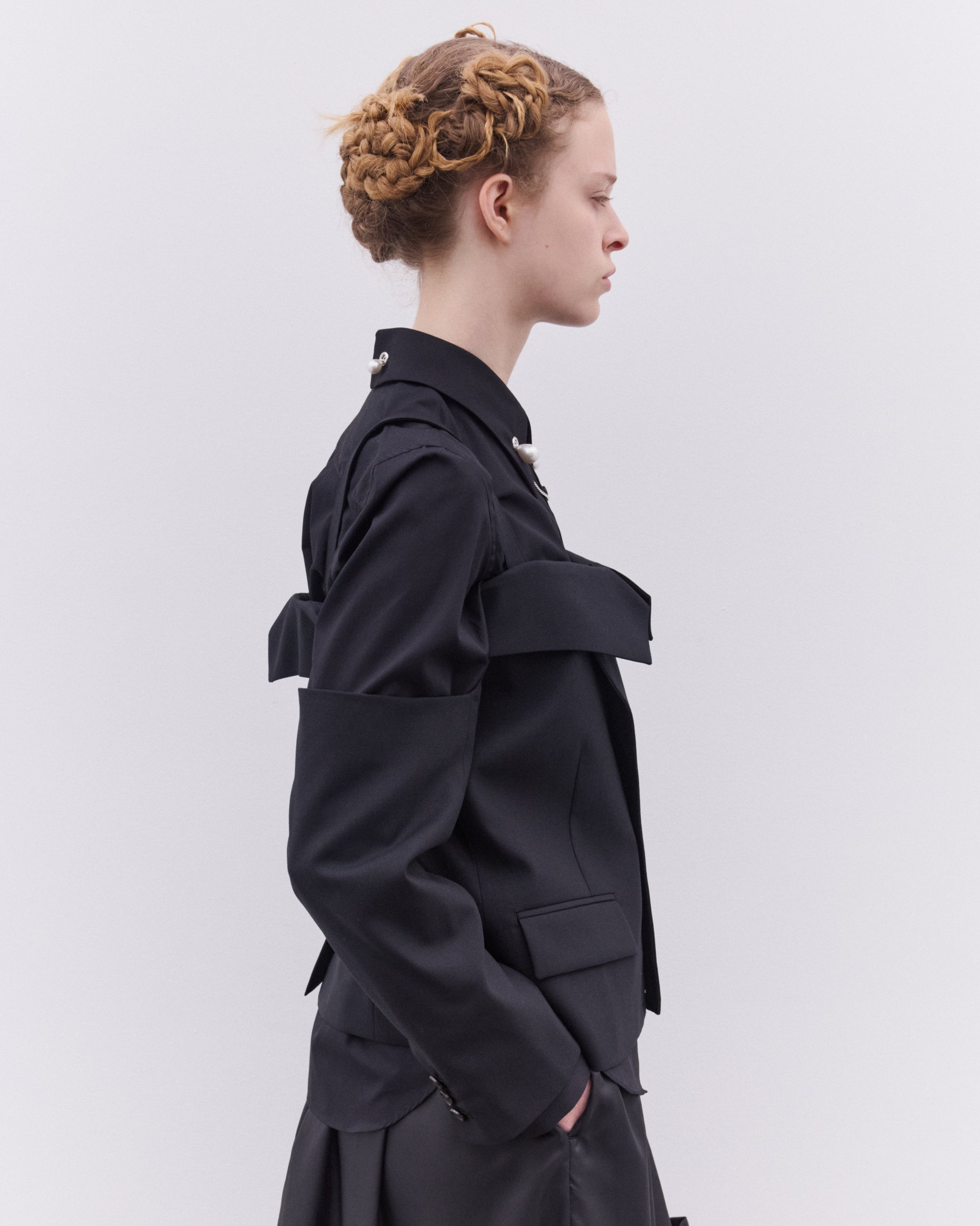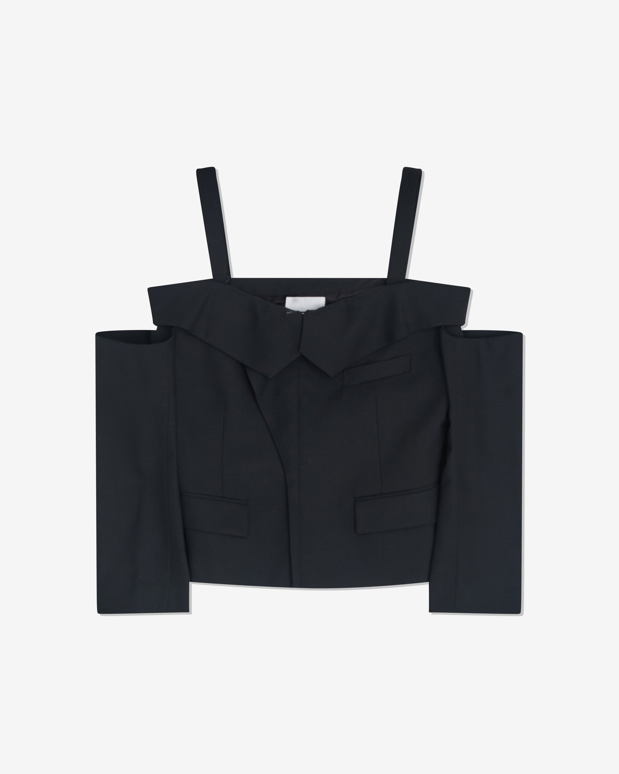 Off shoulder silhouetteAdjustable shoulder strapsHook and eye fasteningCroppedFully linedWelt pocket at chestFront flap pocketsRear adjustable belt100% WoolMade in Japan