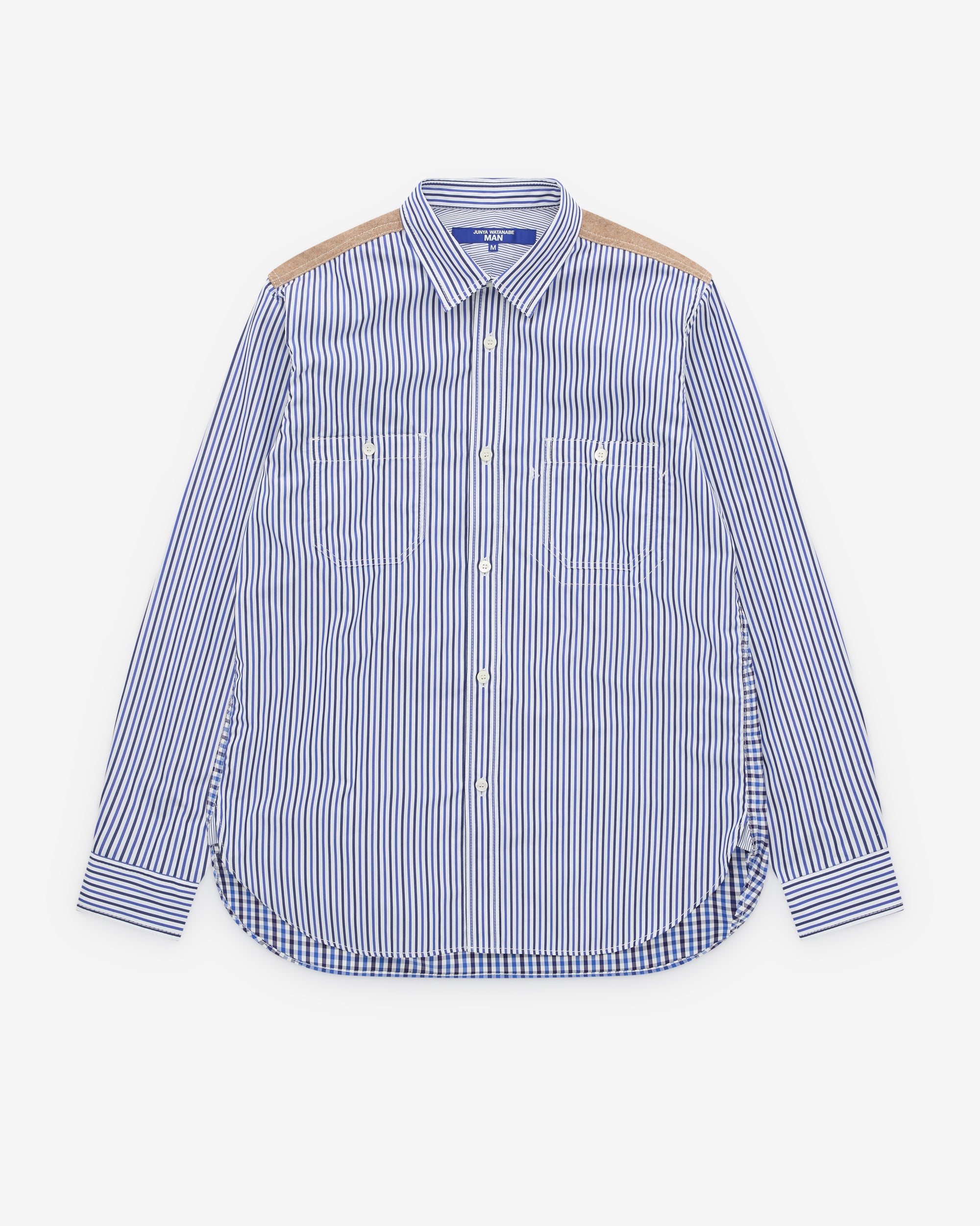 Point collarPatch pockets at chestButton placketContrast yoke and elbow patchesBrushed cotton rear panelCurved hem