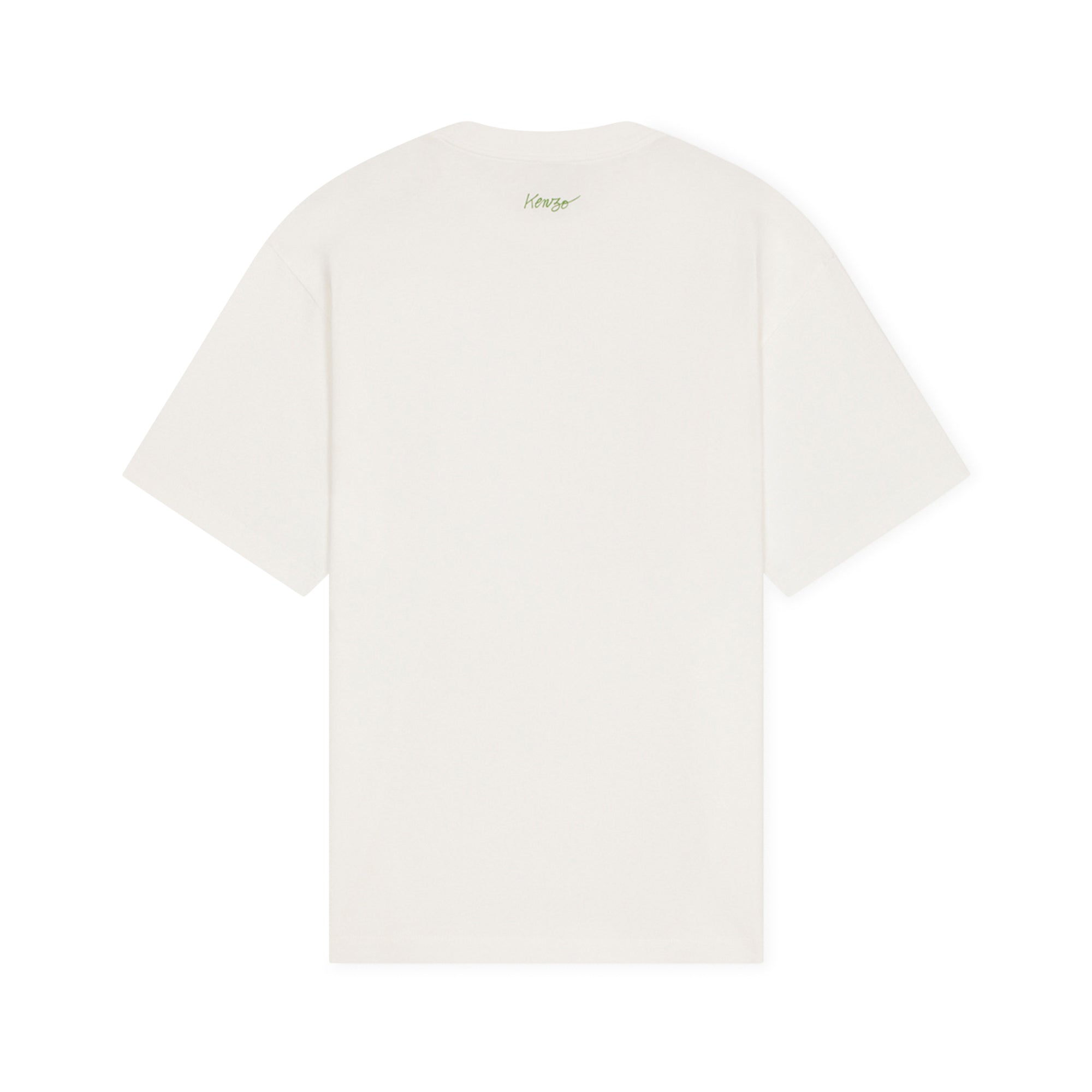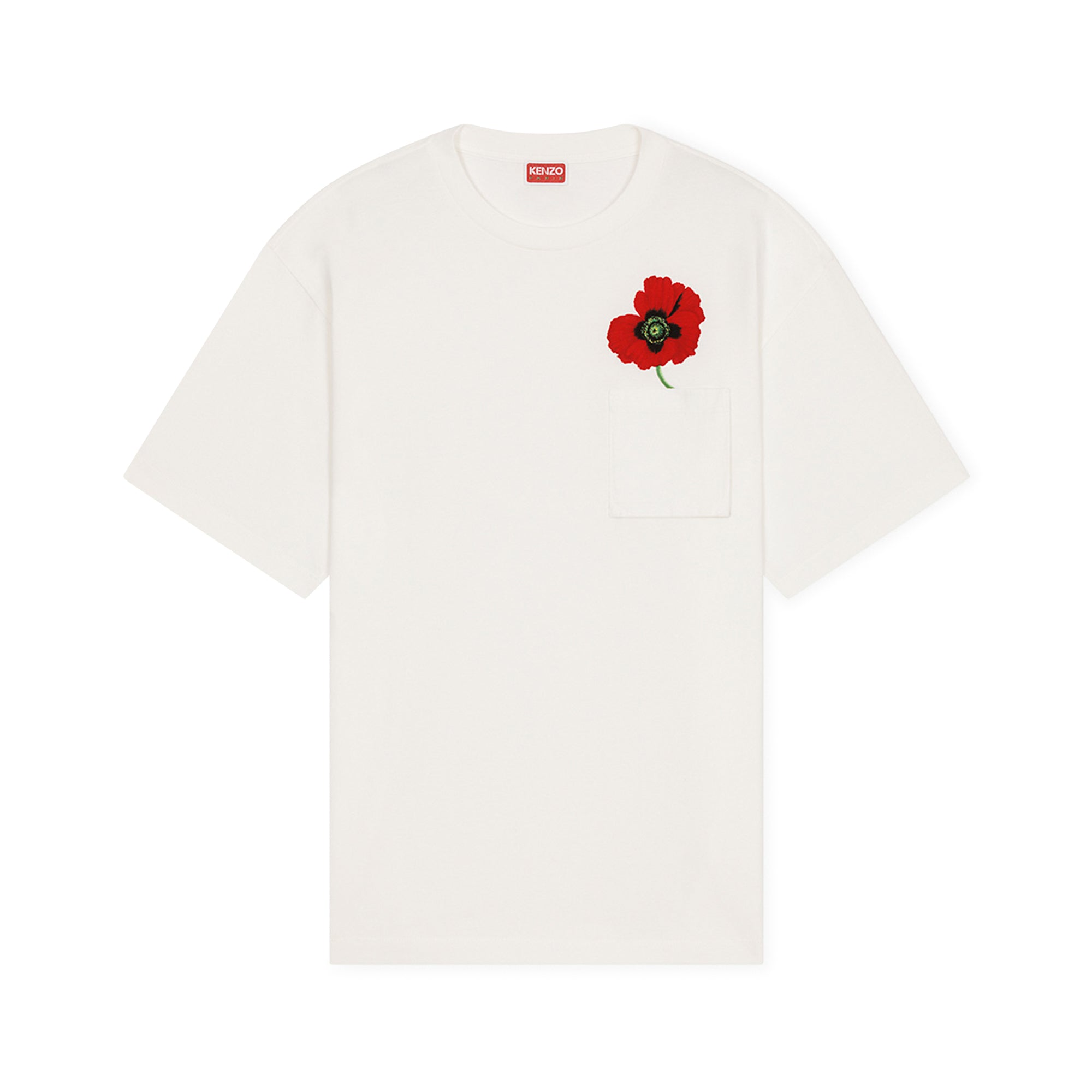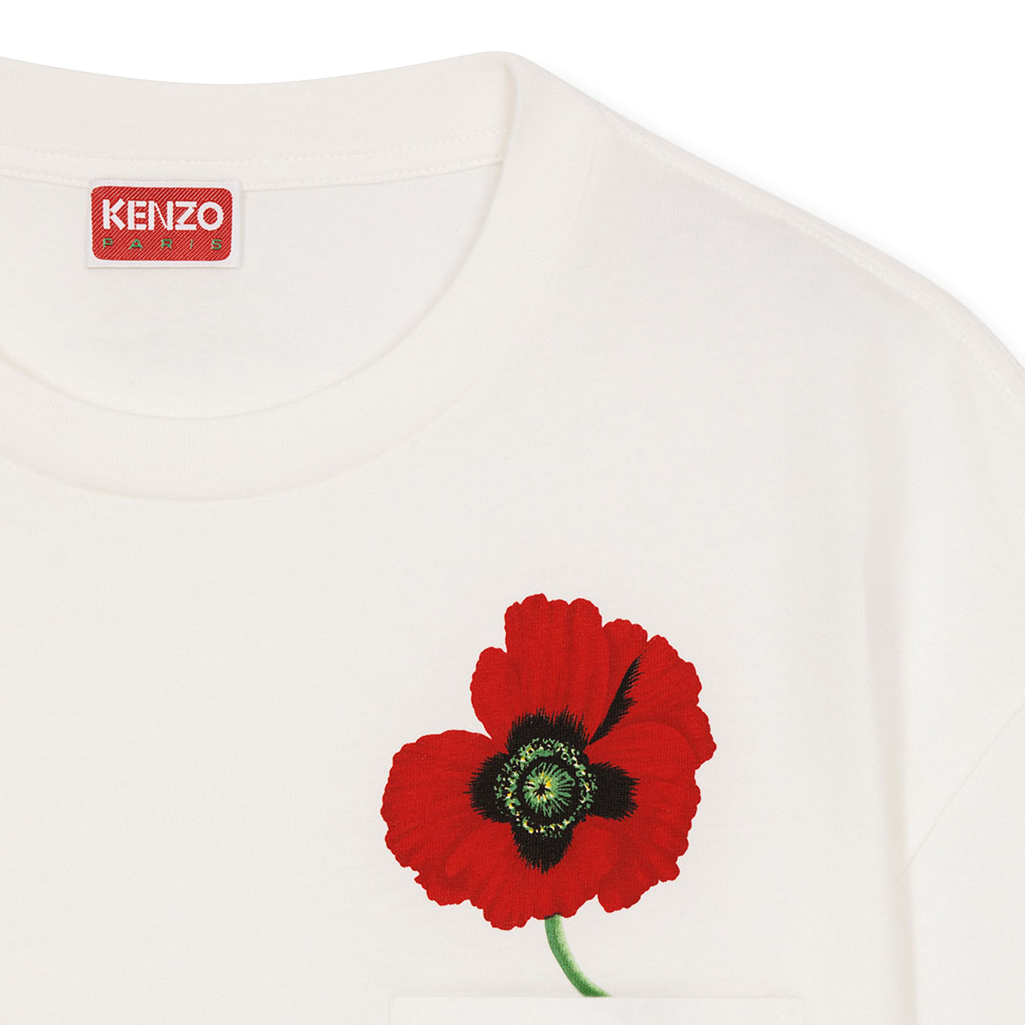 Off-white oversized t-shirt with crew neck, relaxed short sleeves, single patch pocket featuring  red/green 'Kenzo Poppy' graphic at chest and green Kenzo brand logo graphic at back.