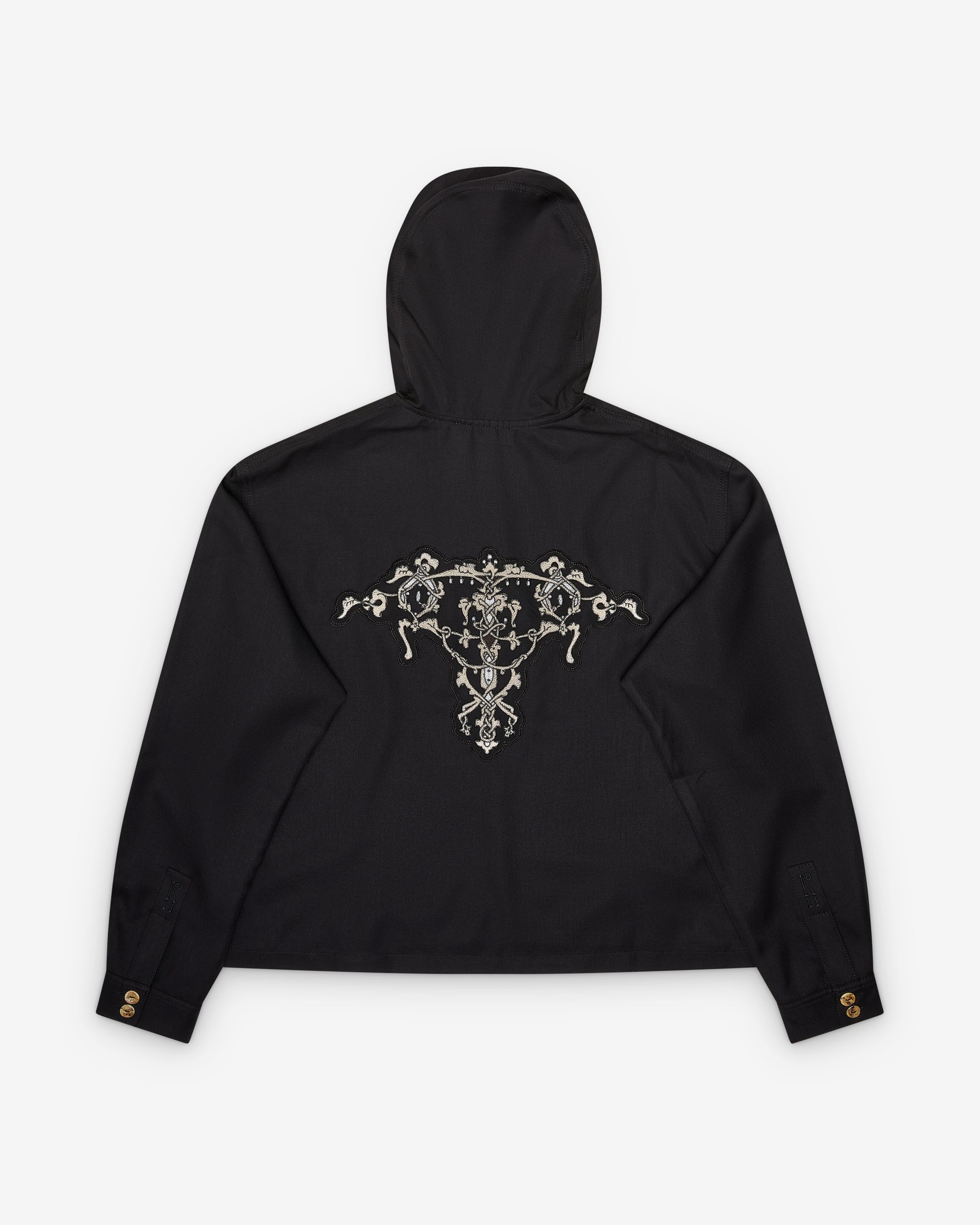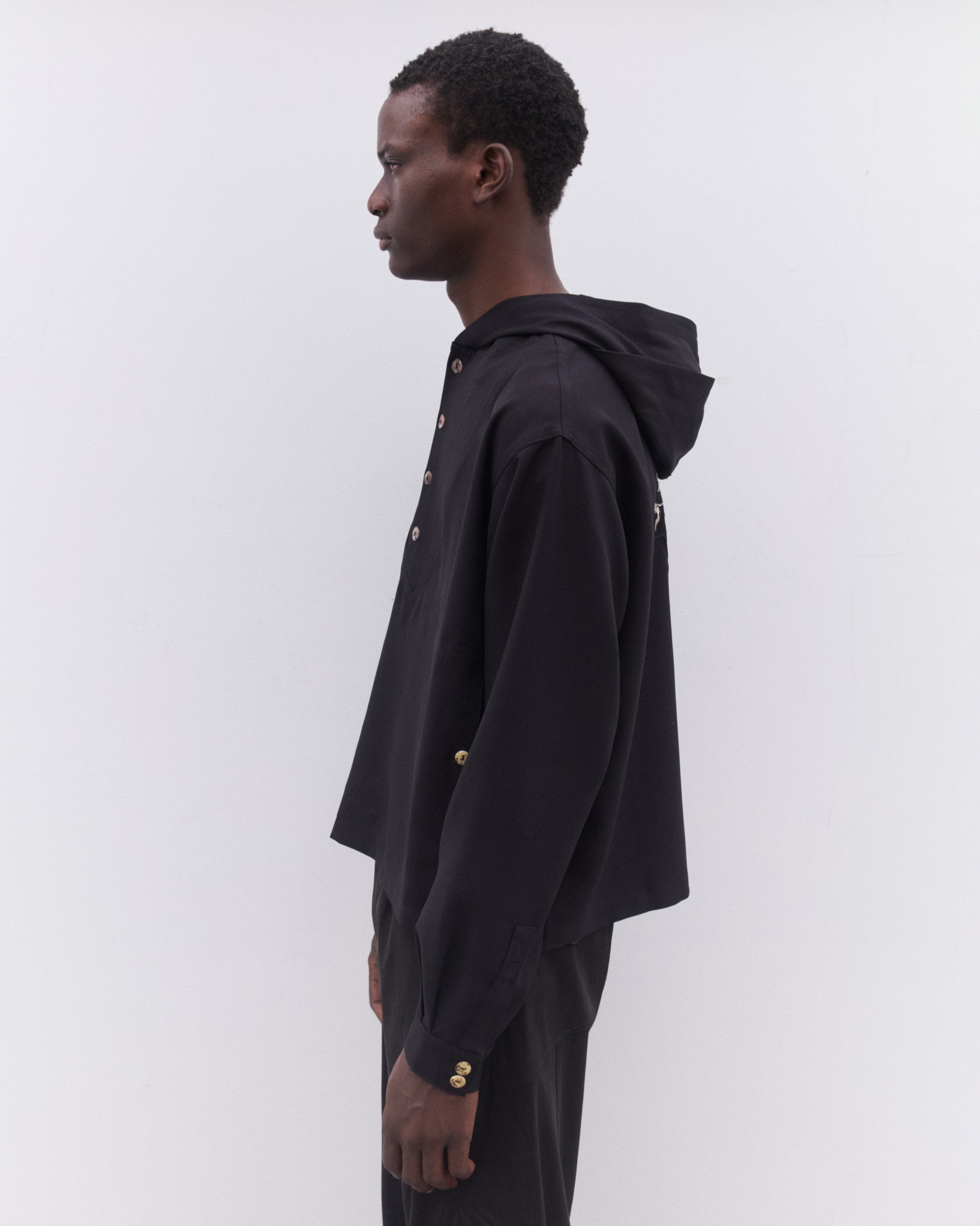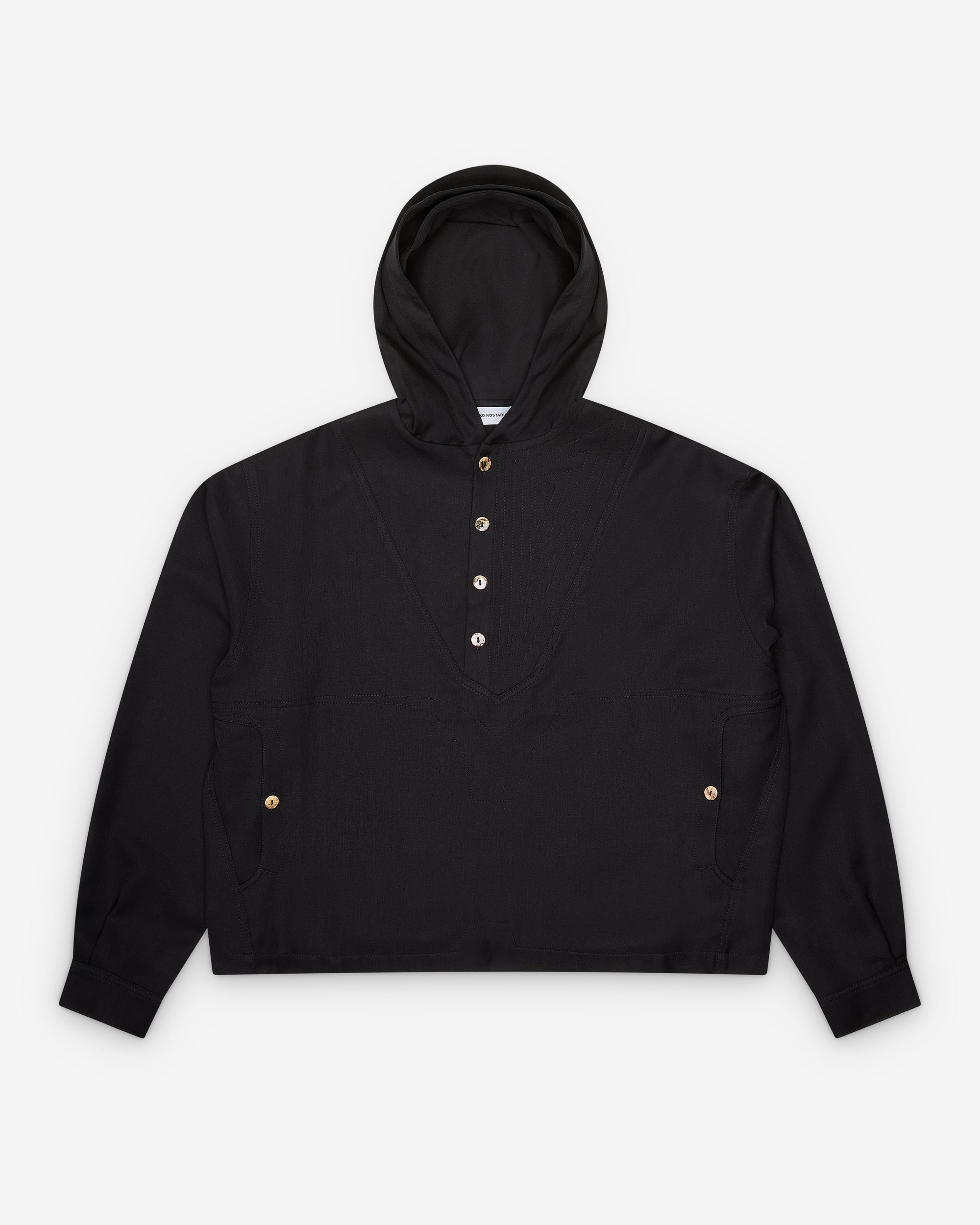 Pullover styleHalf placket button closureHoodedTwo side pocketsEmbroidered graphic at back