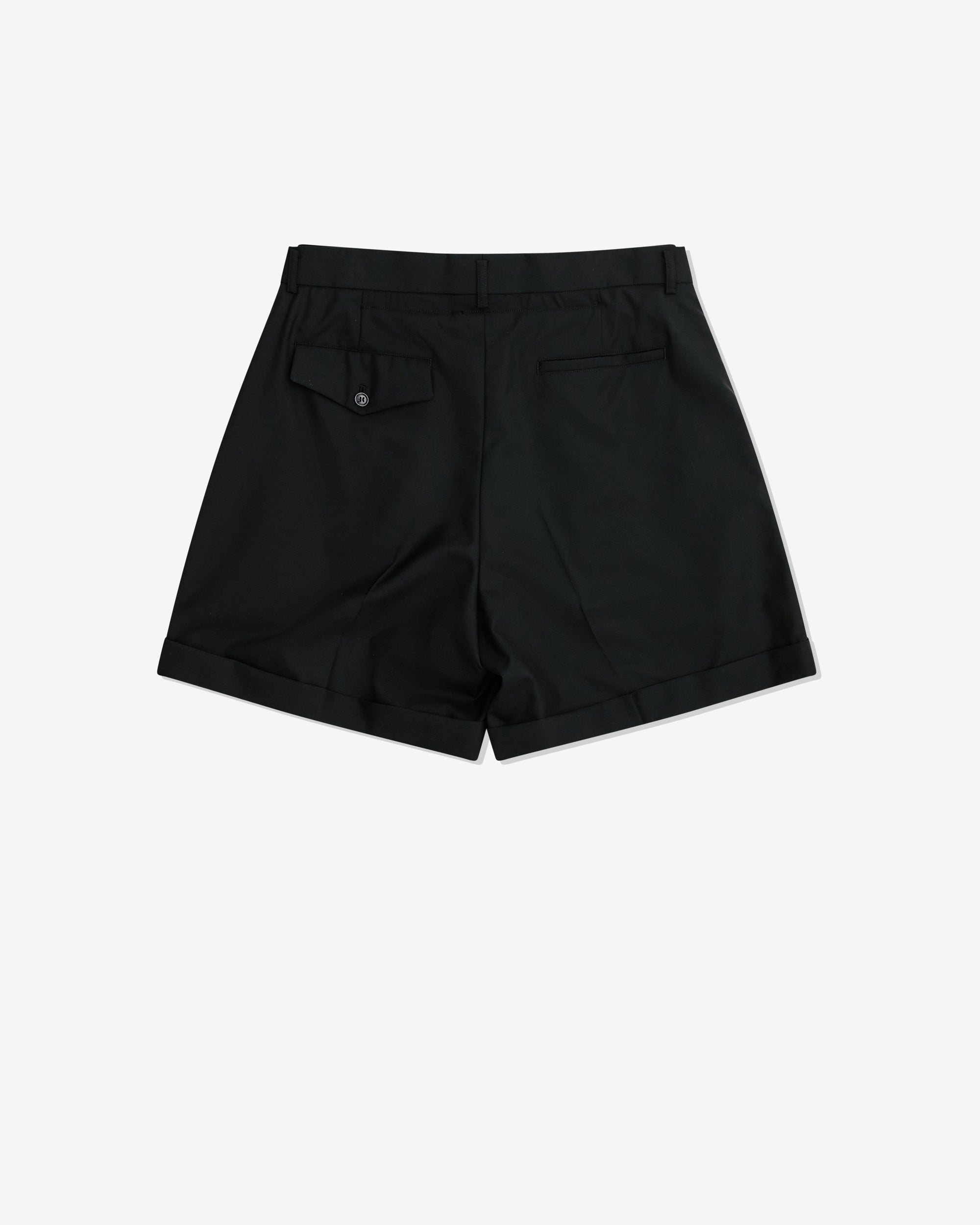 Double waistband Button and fly closurePleatedTurn up at hemSide pocketsBelt loopsRear flap and welt pockets100% WoolMade in Japan