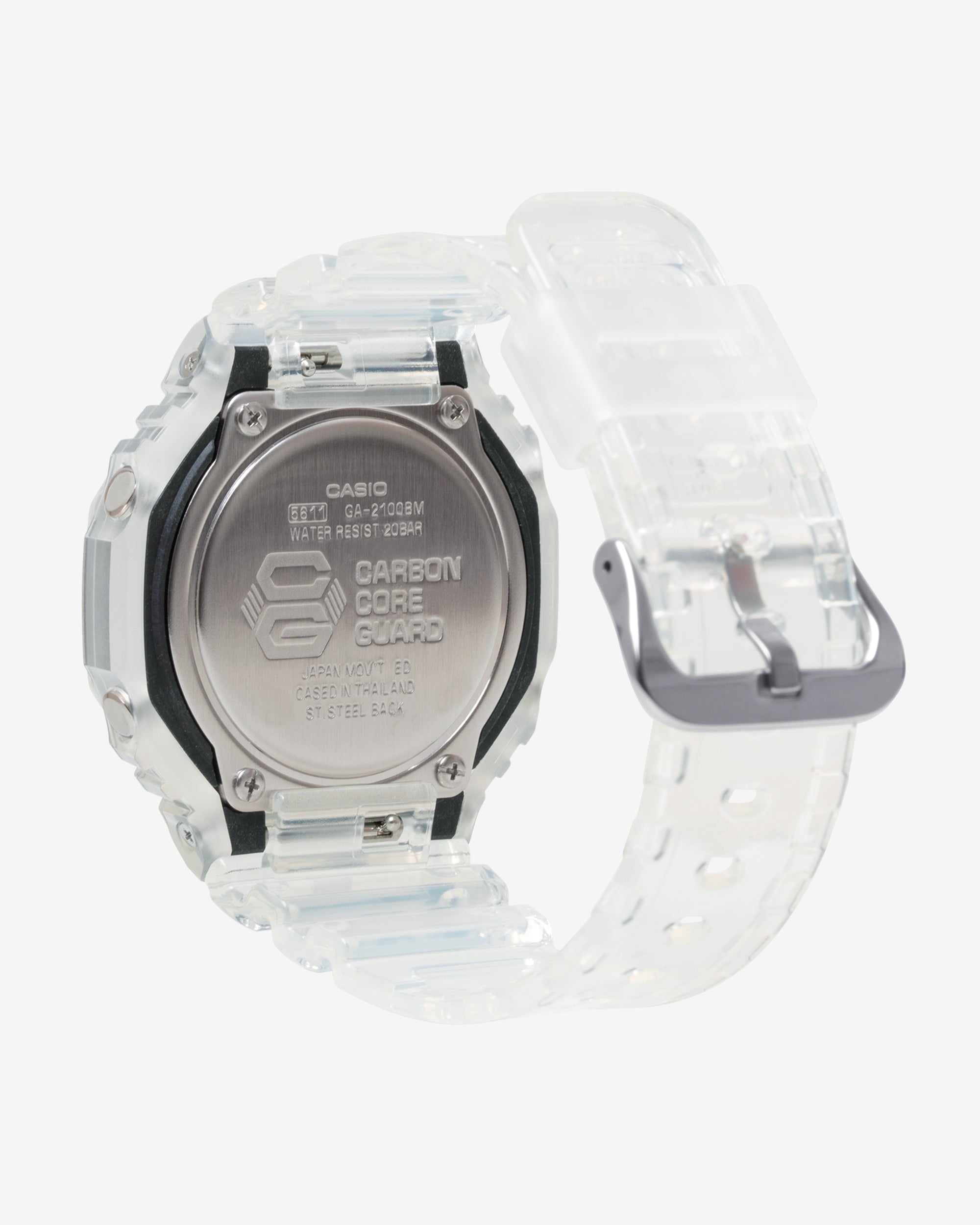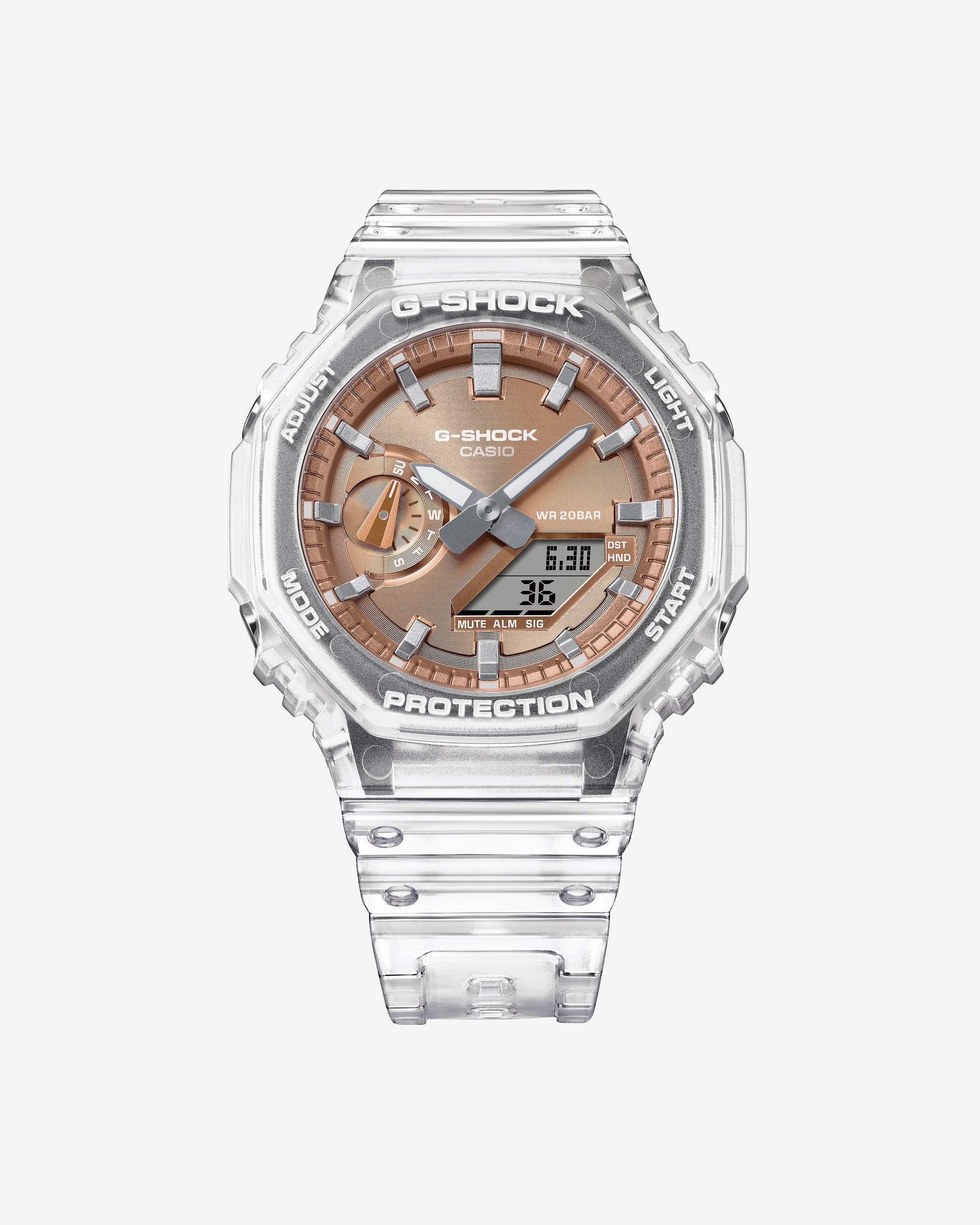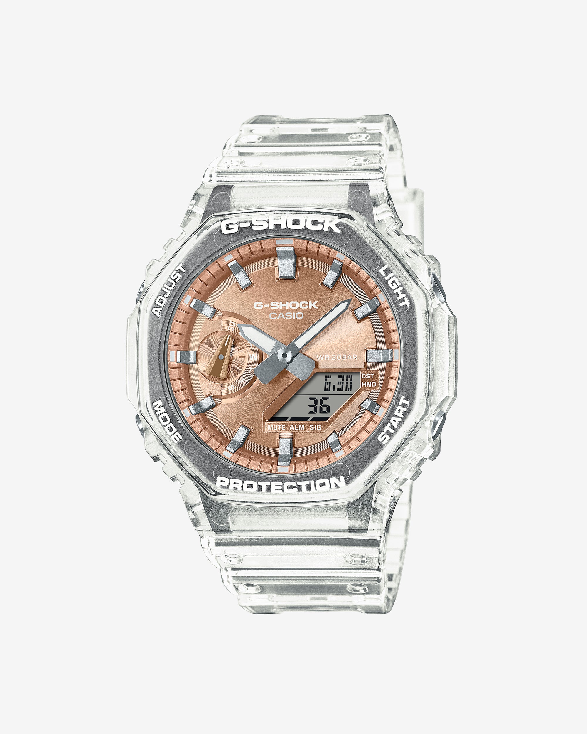 The GA2100 with octagonal bezel is paired with a dial finished in metallic vapor deposition in popular color — rose gold — offset by a translucent band for a confidently cool look.