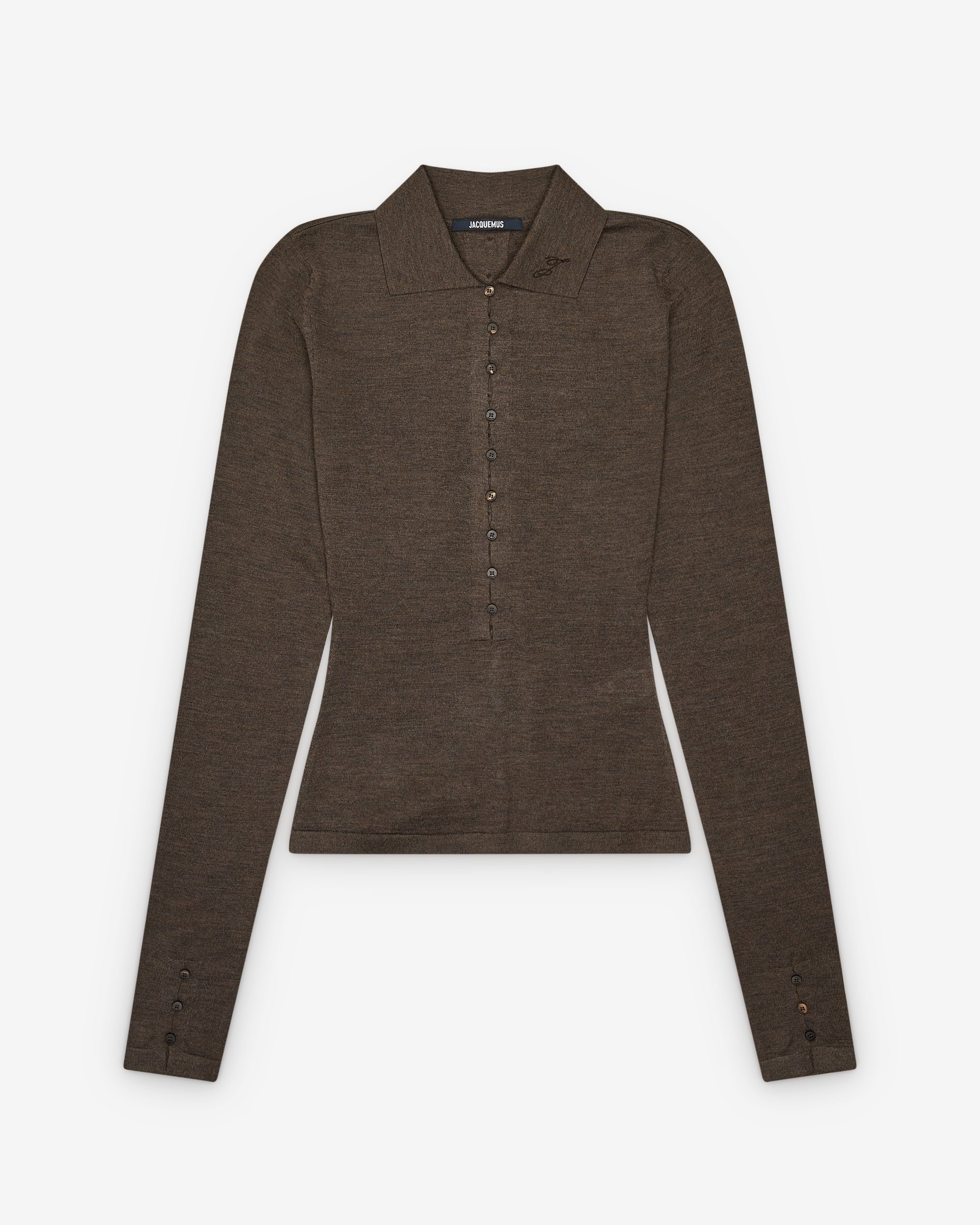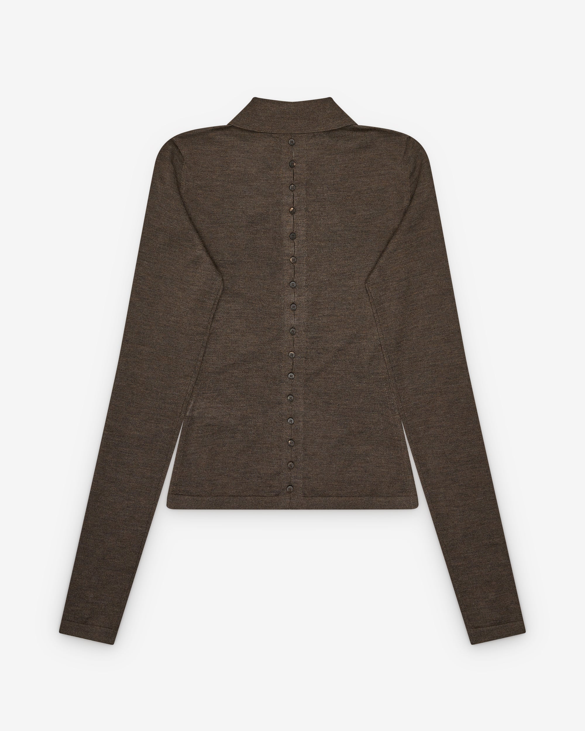 Sheer knit polo Fitted shape Light merino blend knit Ribbed hem Embroidered “J” on the collar Long polo placket Stretched open buttonholes Fitted buttoned sleeves Fully buttoned back Small horn buttons