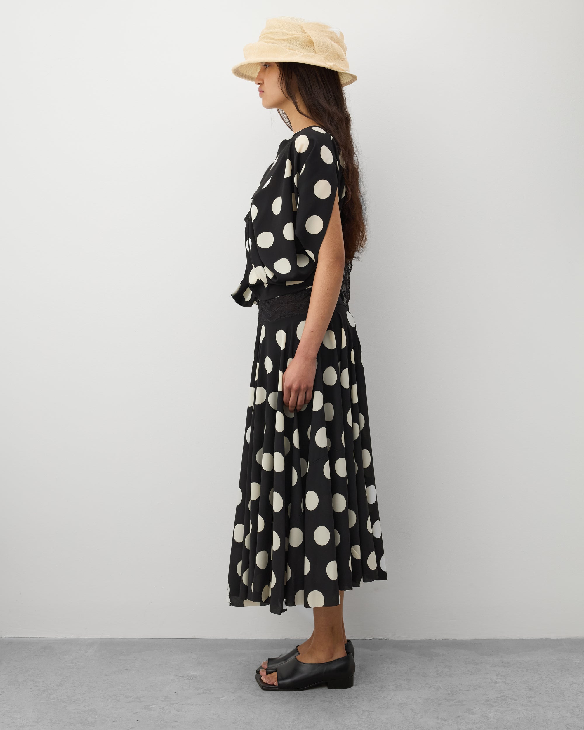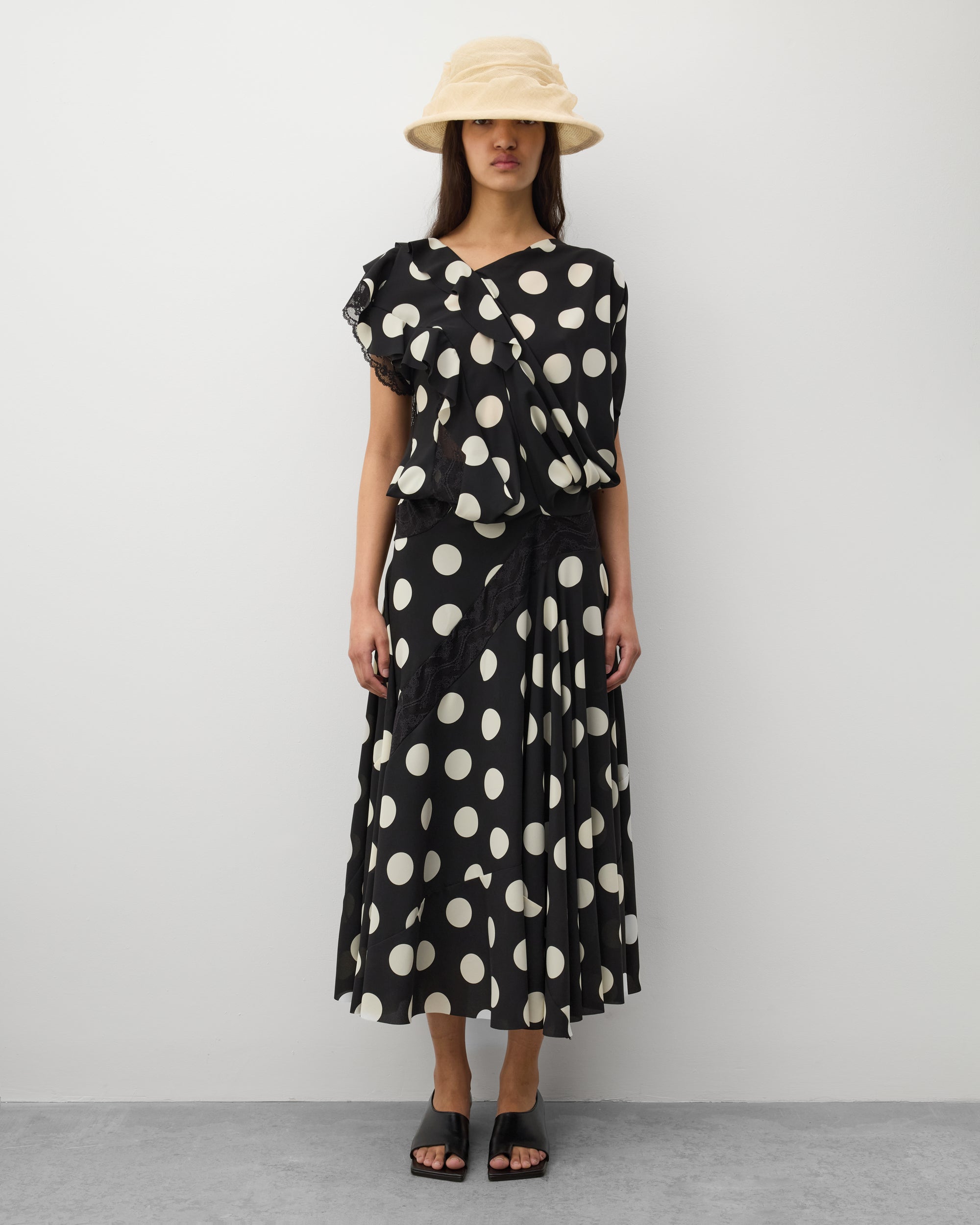Asymmetric V-necklineShort sleevesLace details at waist and sleeveMaxi skirt folder