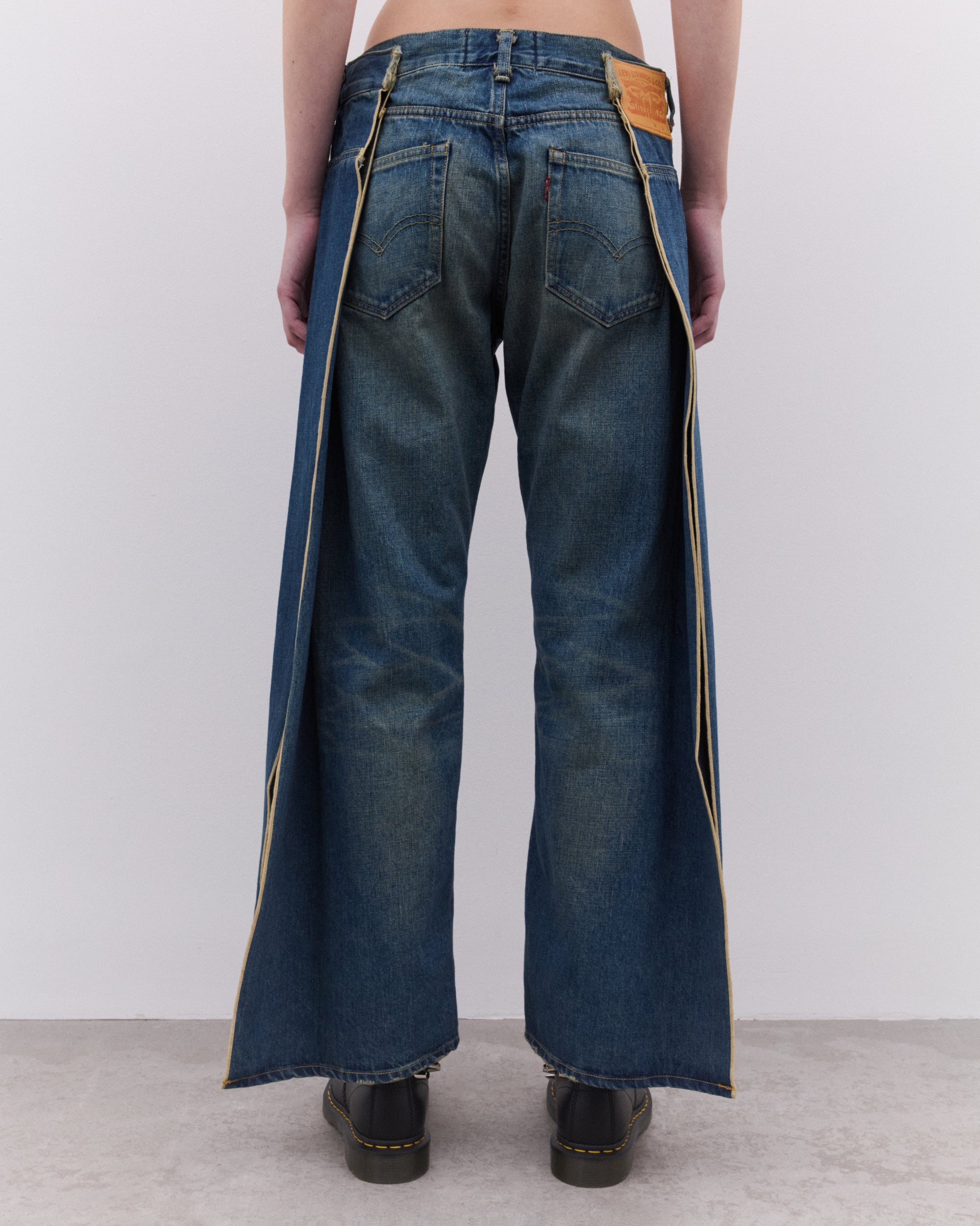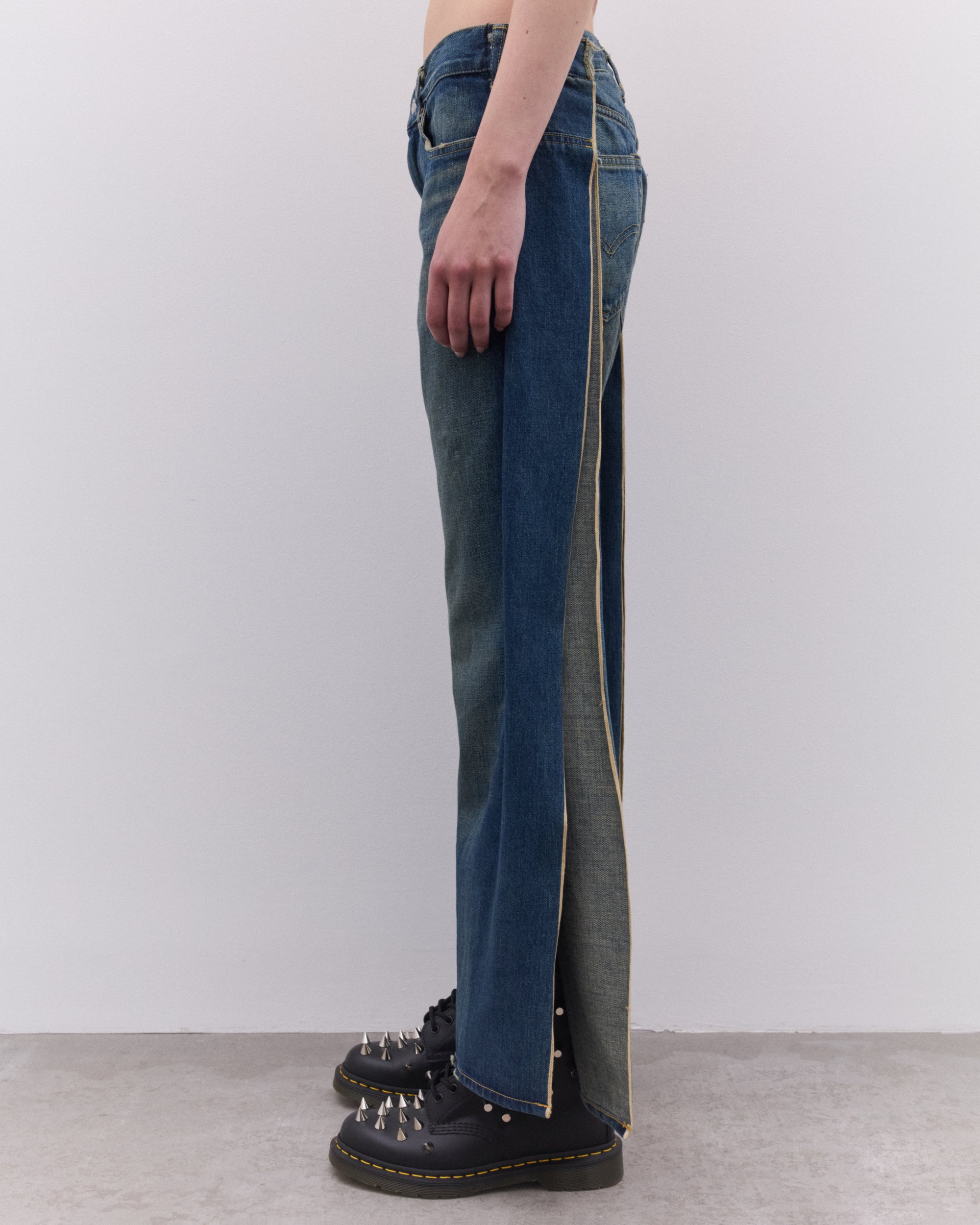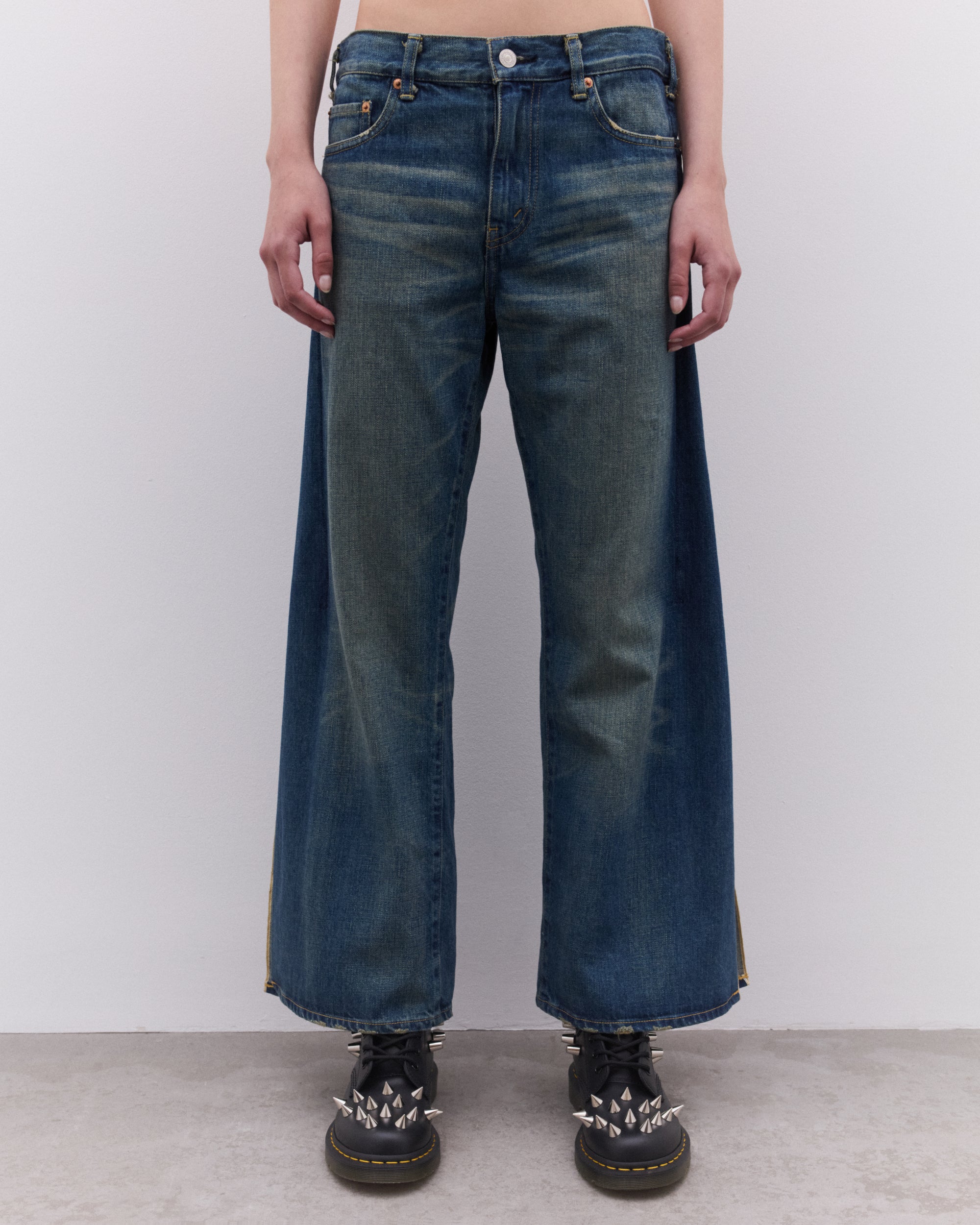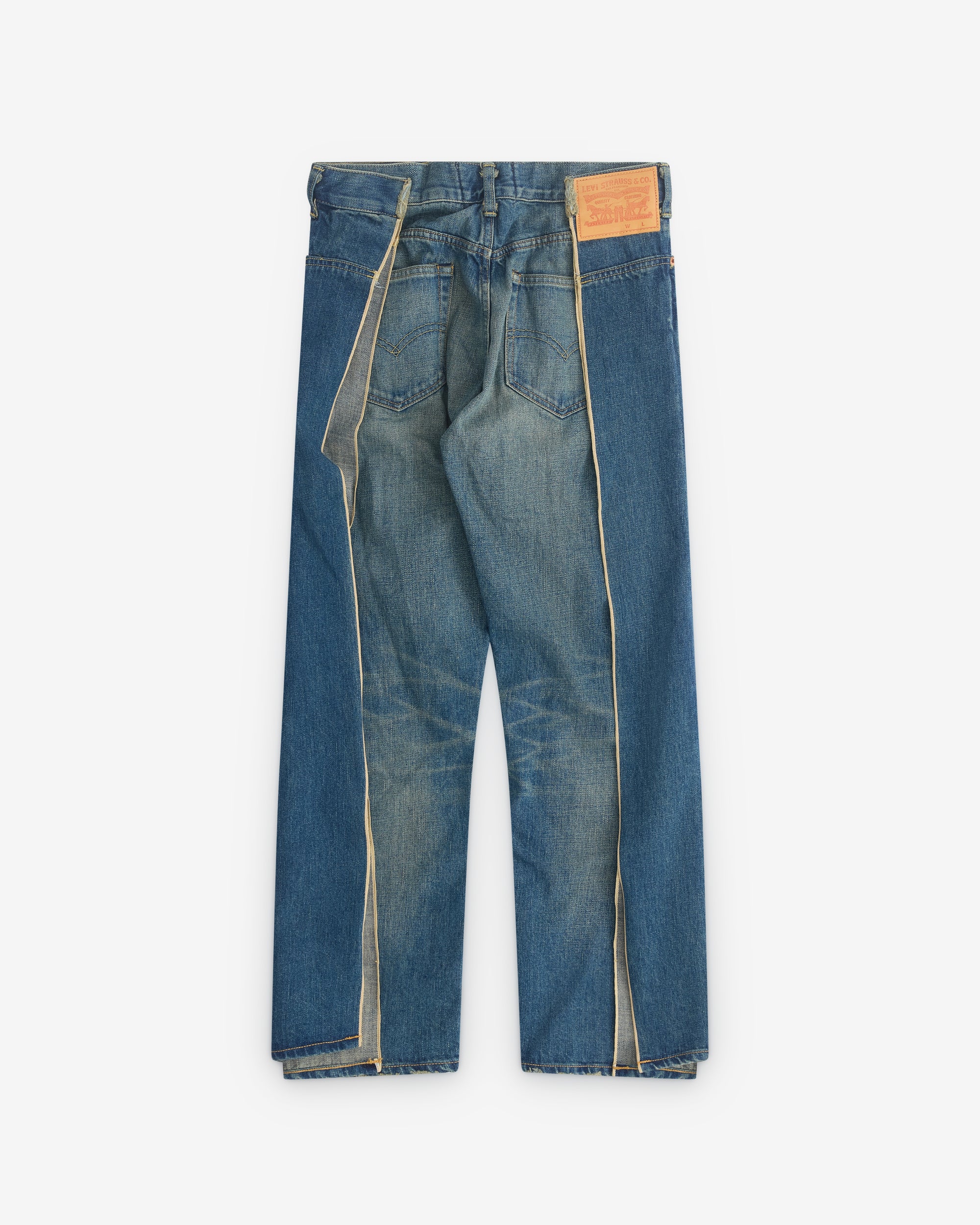Straight legWashed finishRear folded open seam5 pocket constructionButton and zip fly fastening