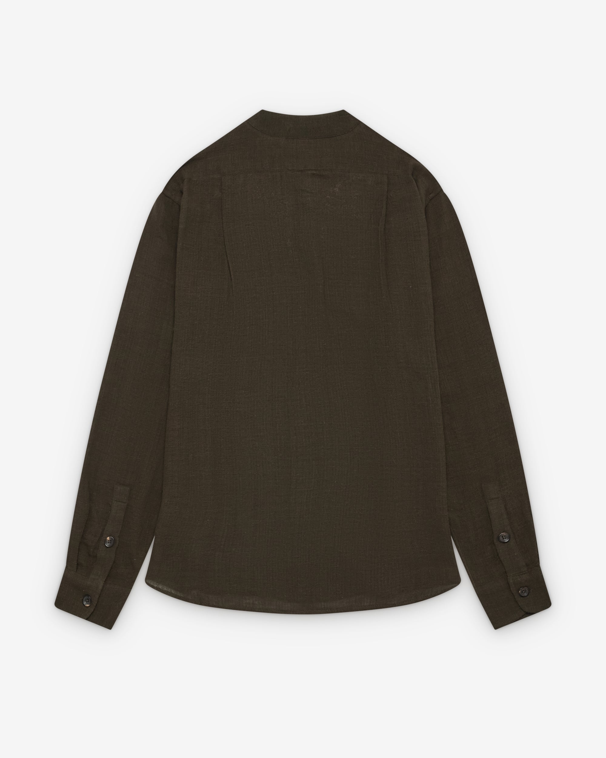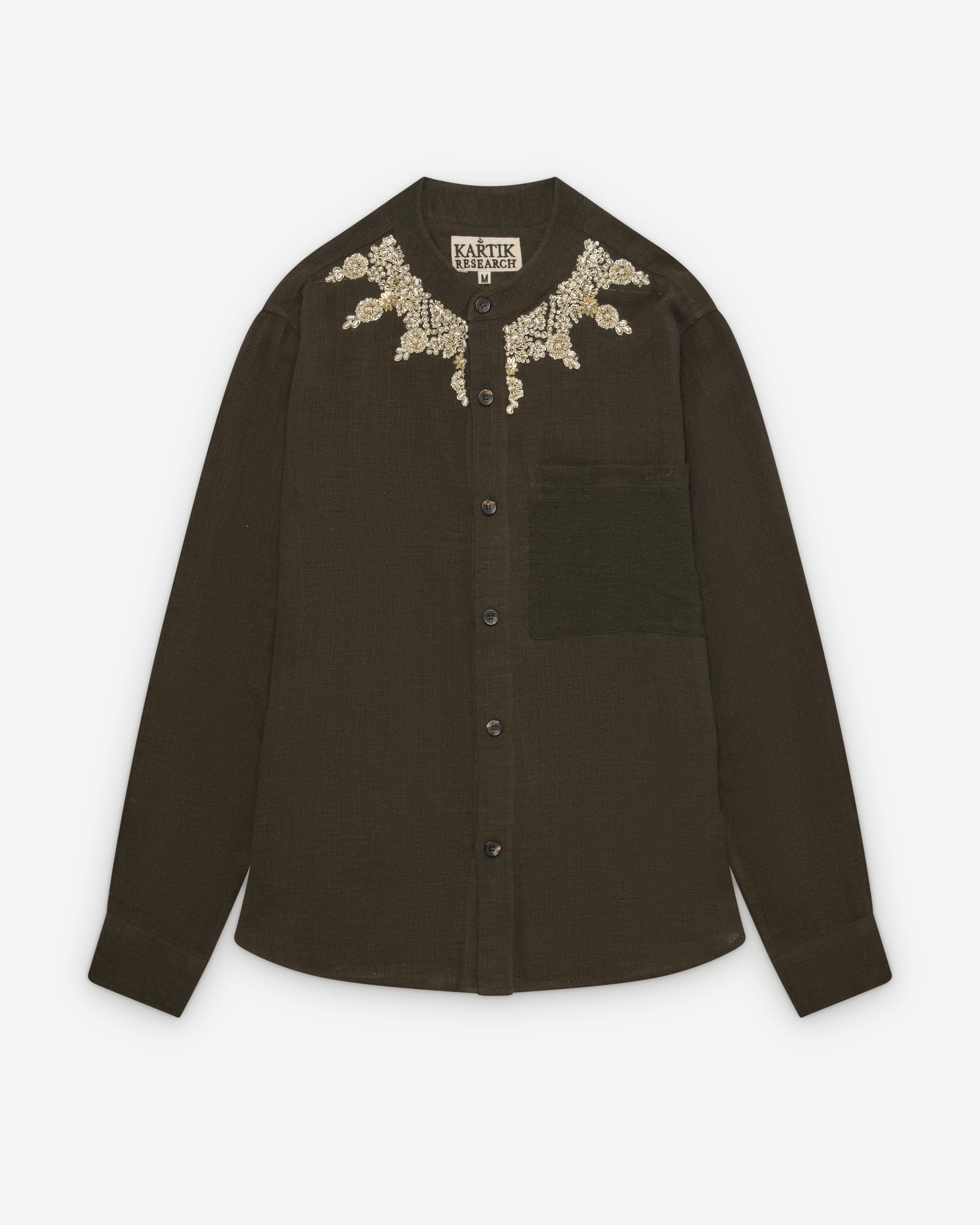 Band collarFront button closureFloral pearl embellishment at neckSingle chest pocketButton close cuffsRear box pleat