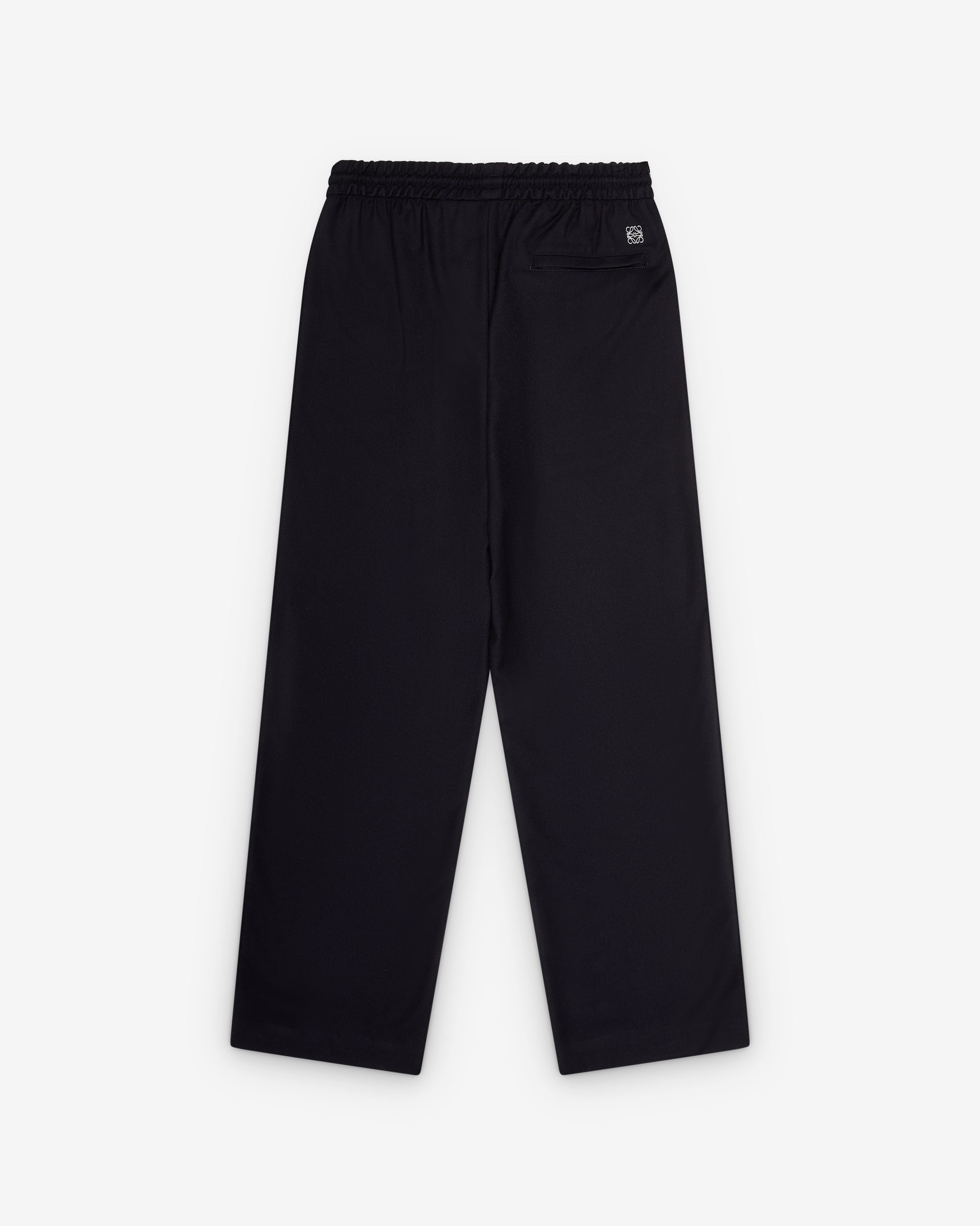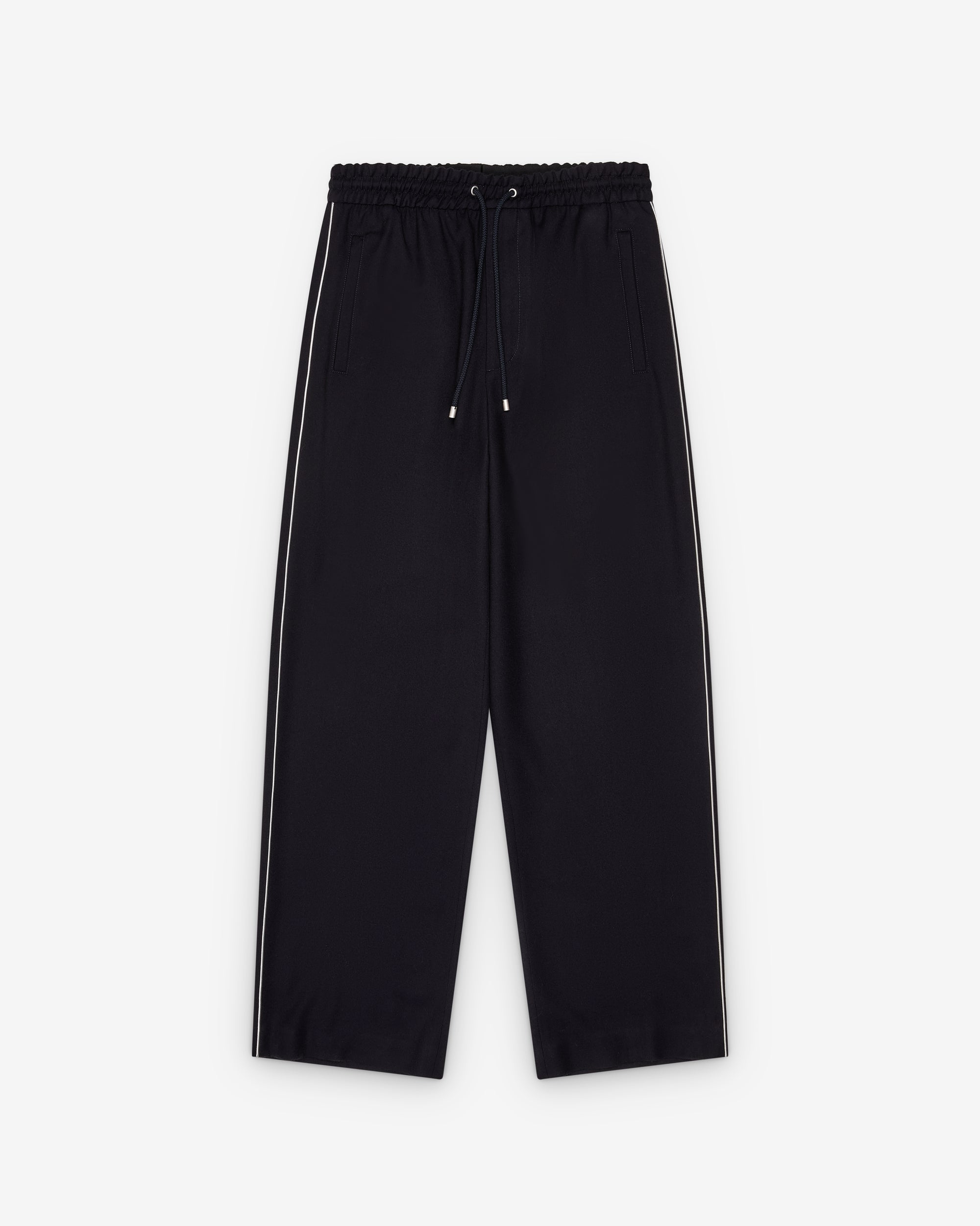 Regular fit, regular lengthMid waist, straight legElasticated drawstring waistConcealed zip flyVertical welt pockets, zipped rear welt pocketAnagram embroidery placed at the backWoolMade in Italy