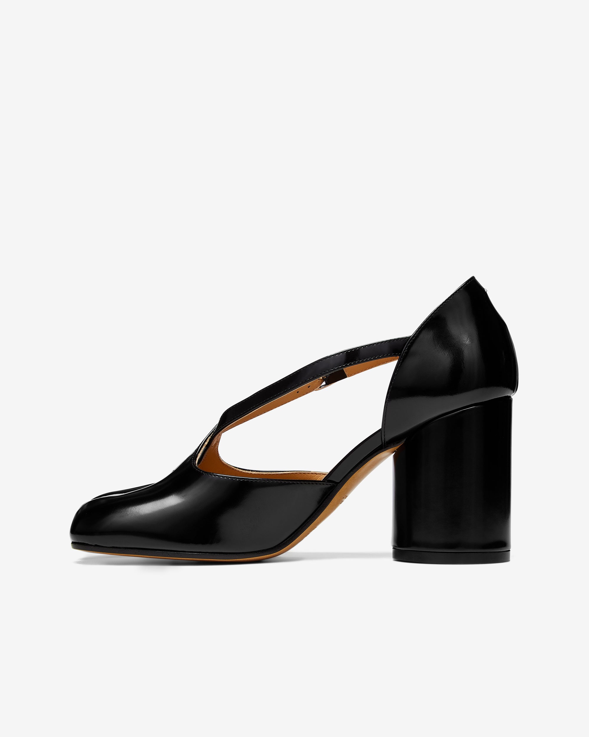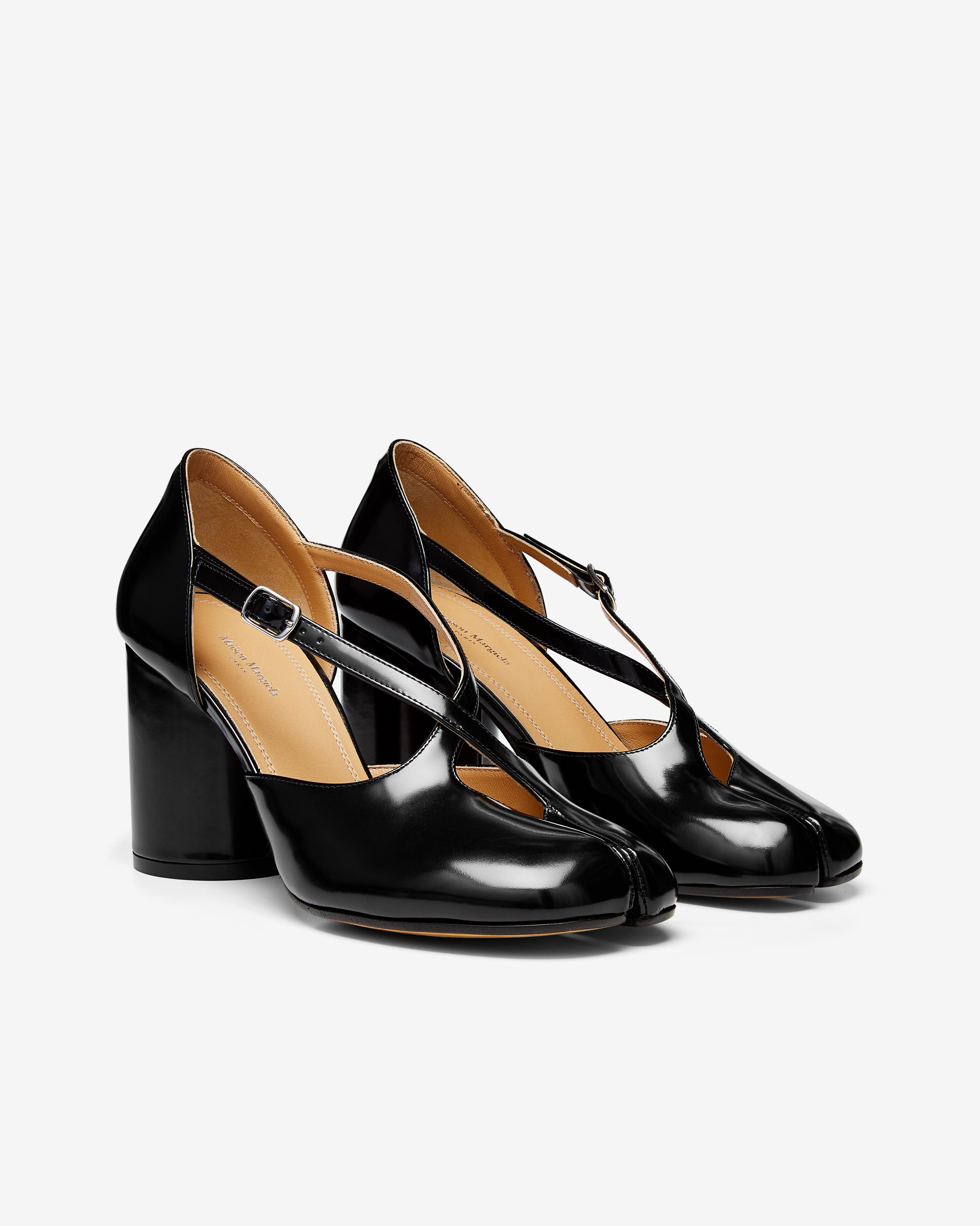 Sandal in brushed leatherTabi split-toeThin ankle strap with buckleSmall cutout near the topWhite stitching at the back