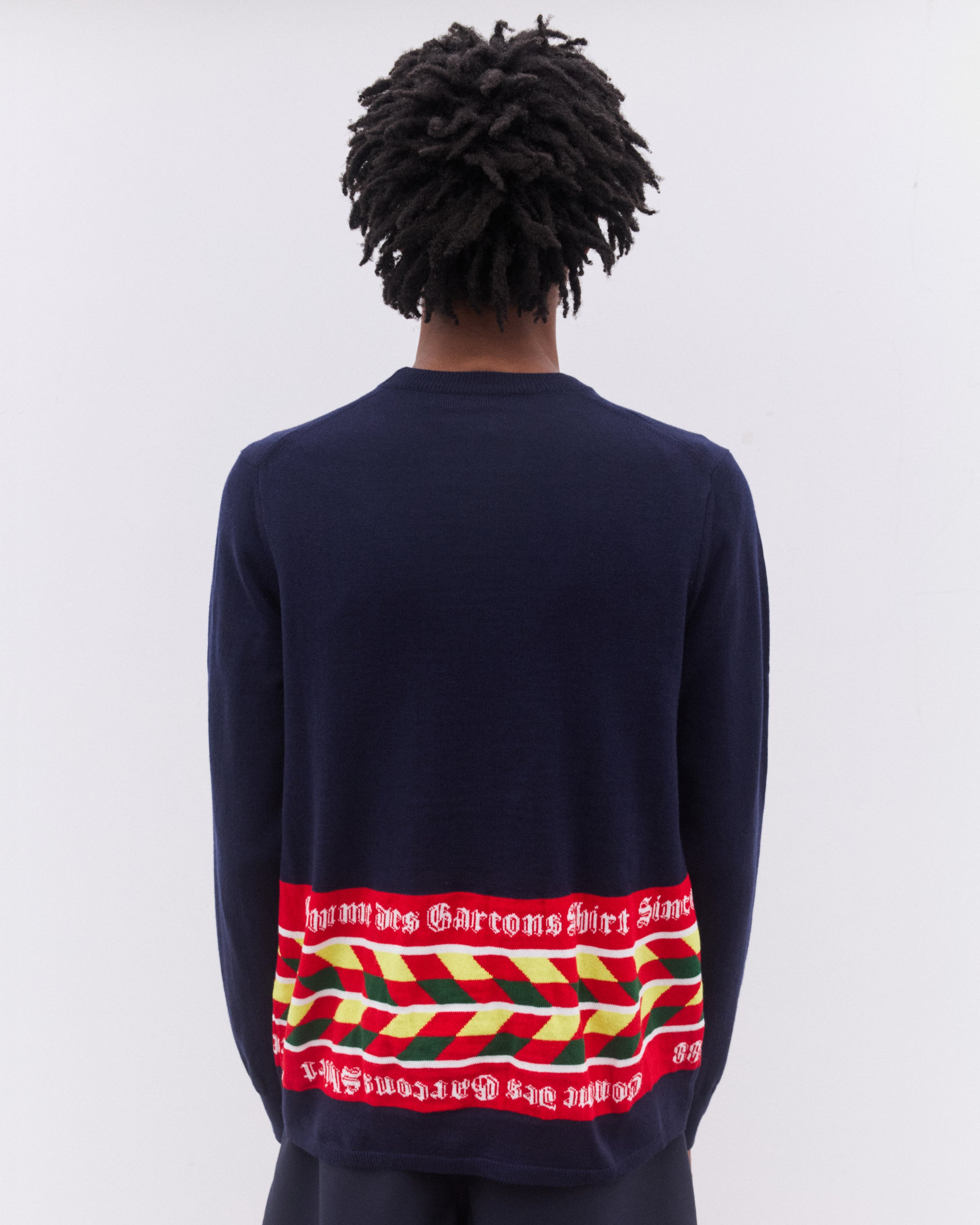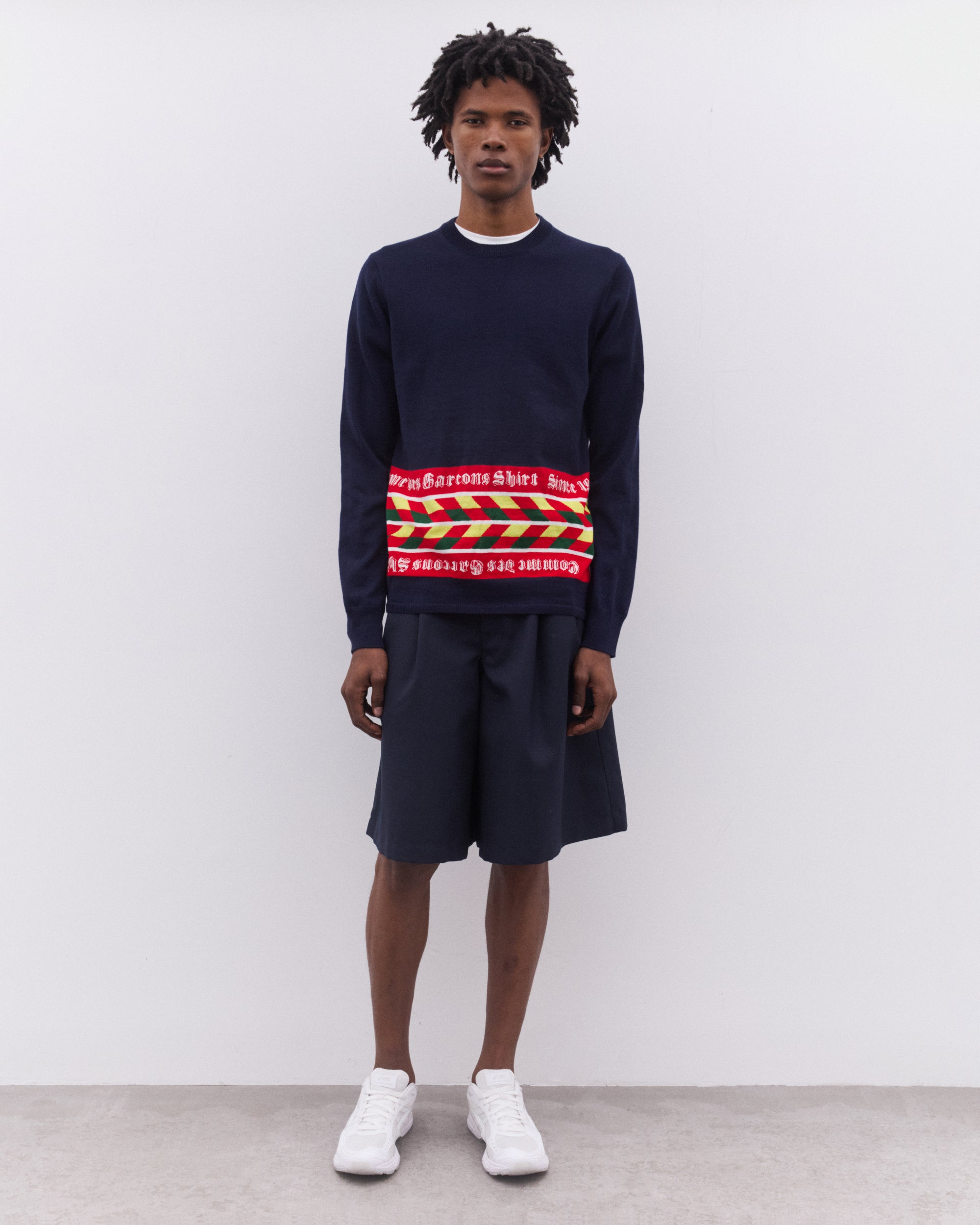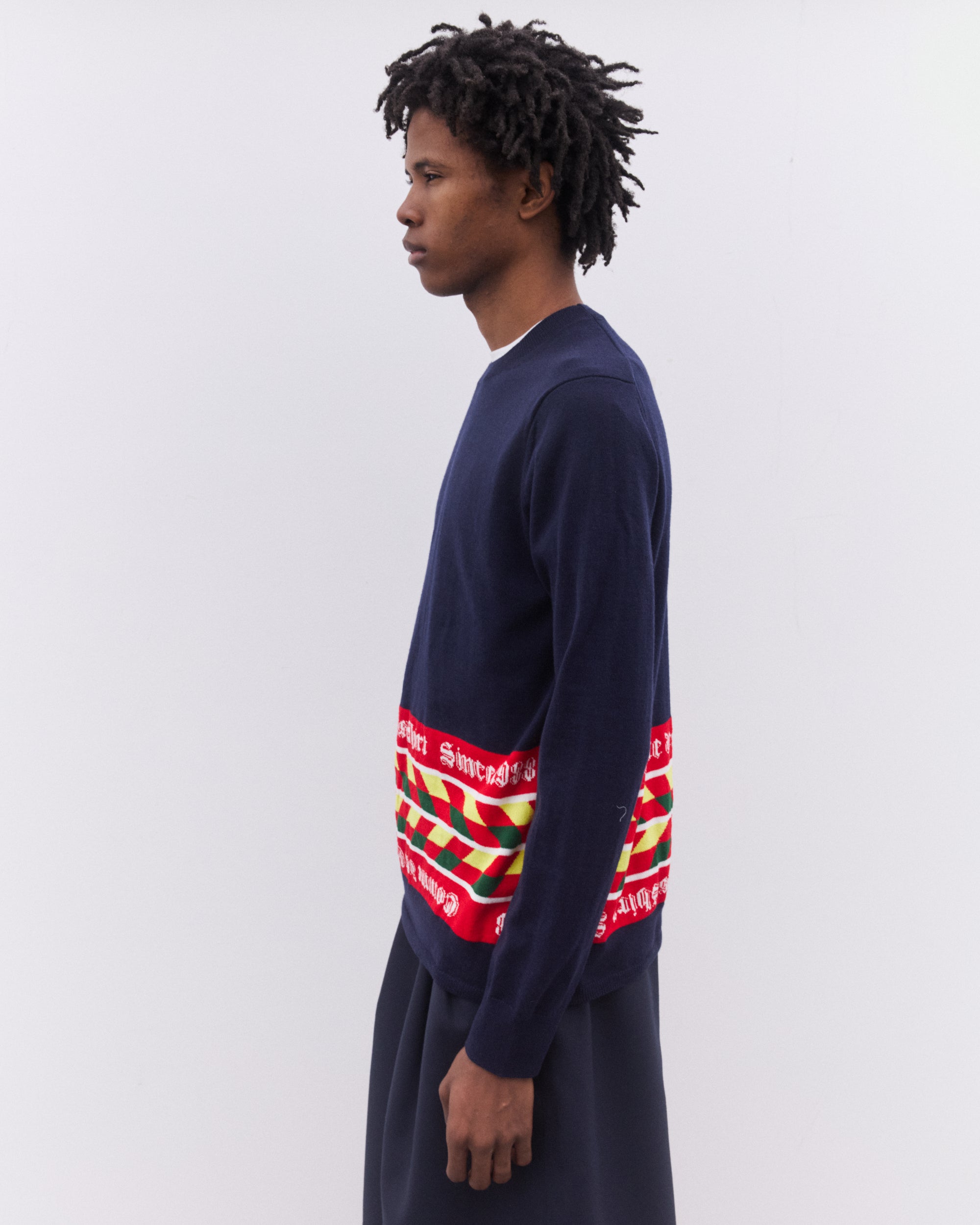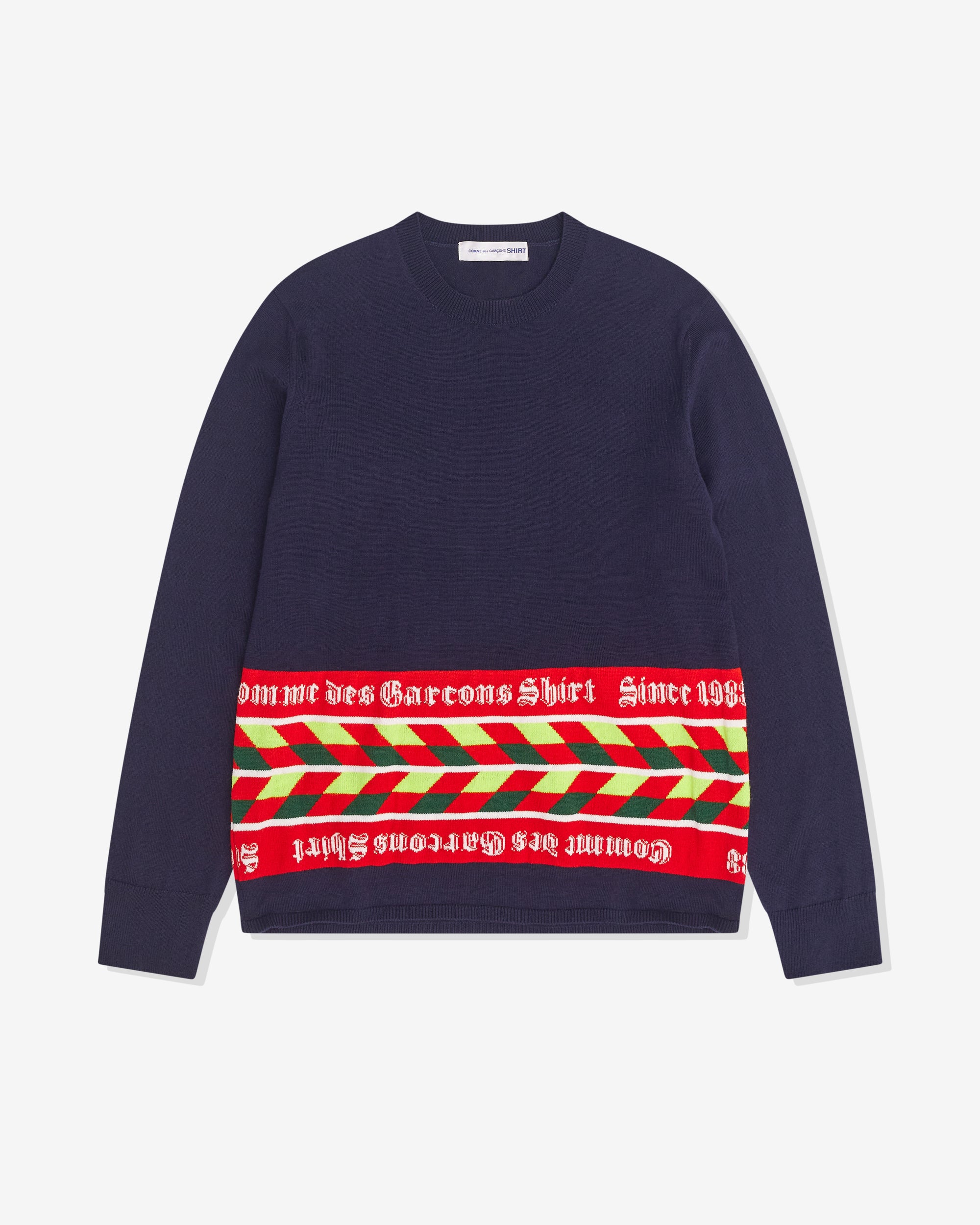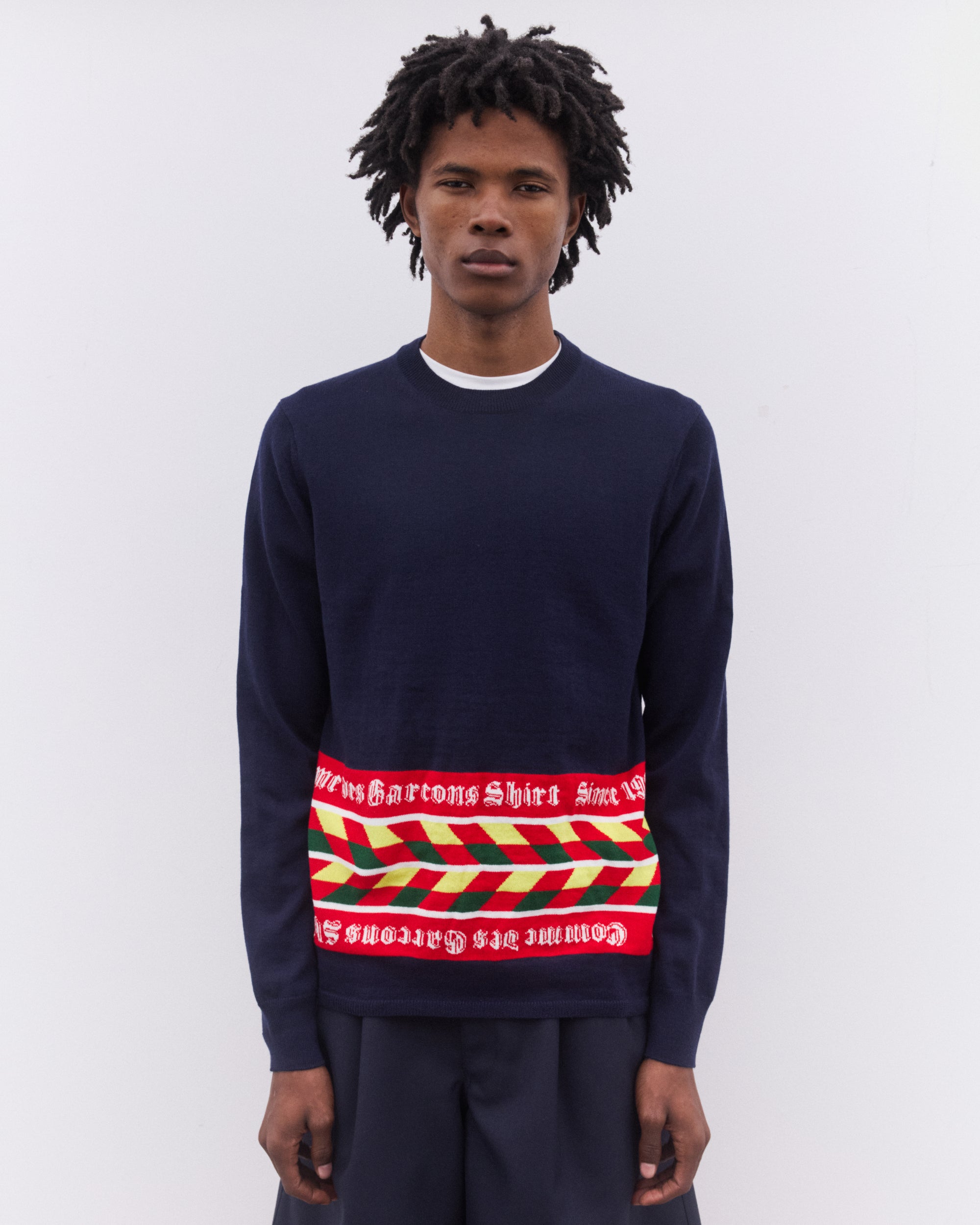 Round neckLong sleevesRib knit trimsIntarsia knit football scarf inspired design at hem