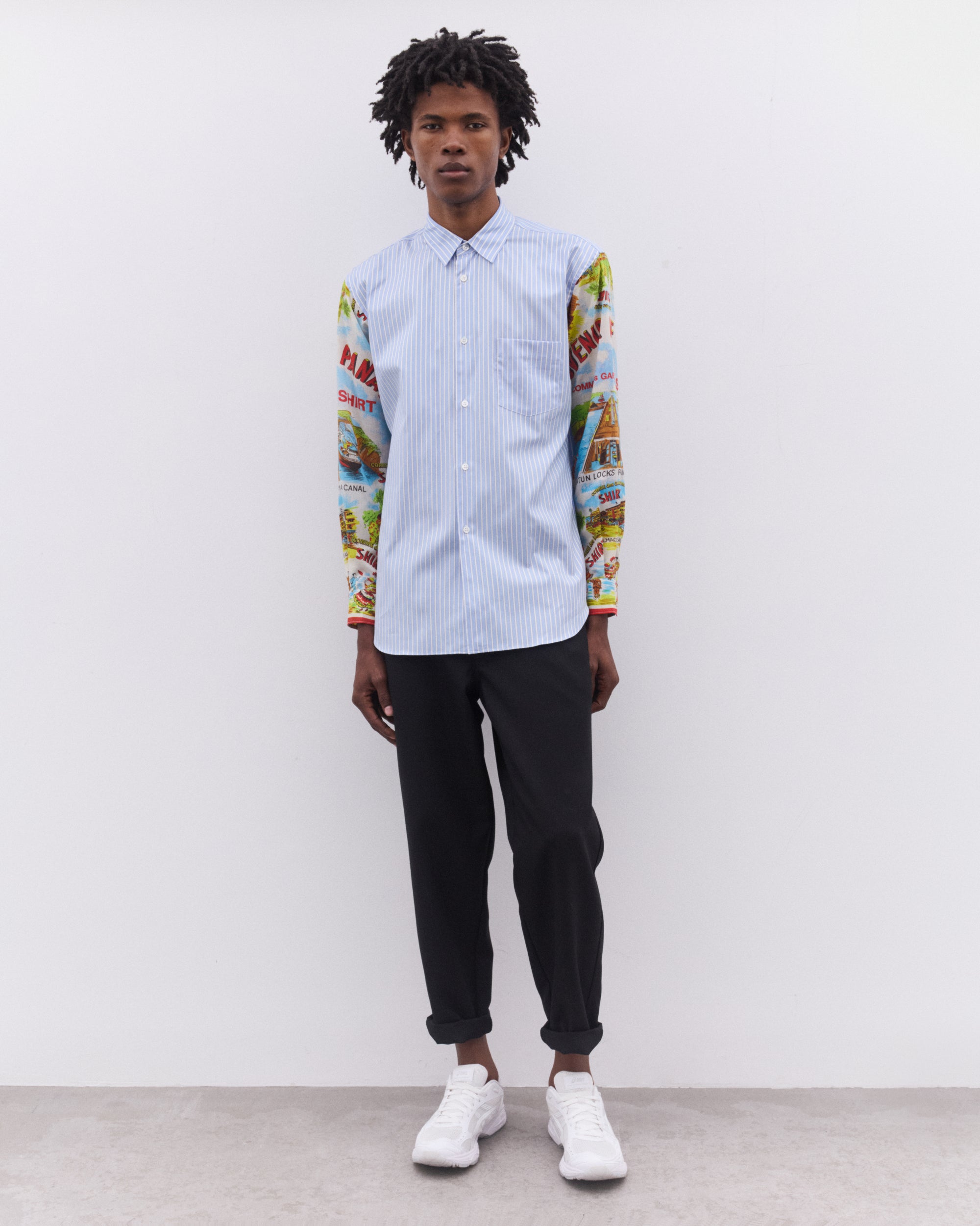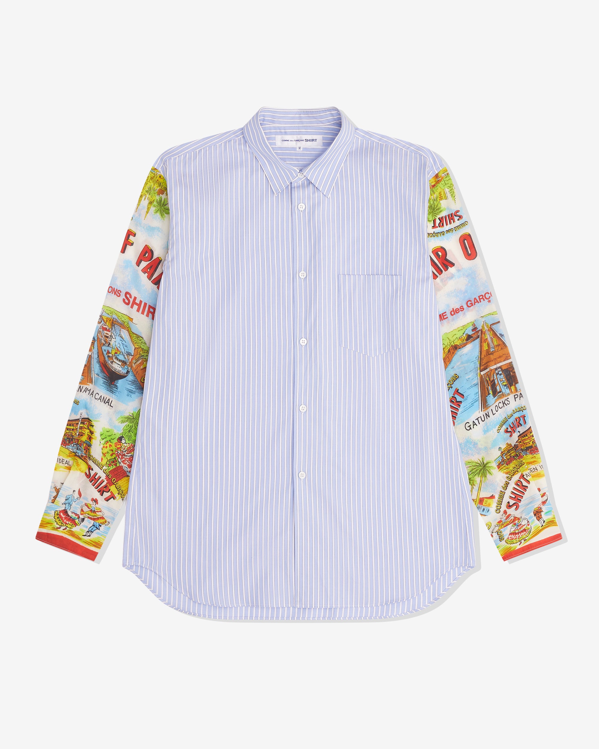 Point collarCurved hemPatch chest pocketButton placketButton cuffsRetro holiday print at sleeves
