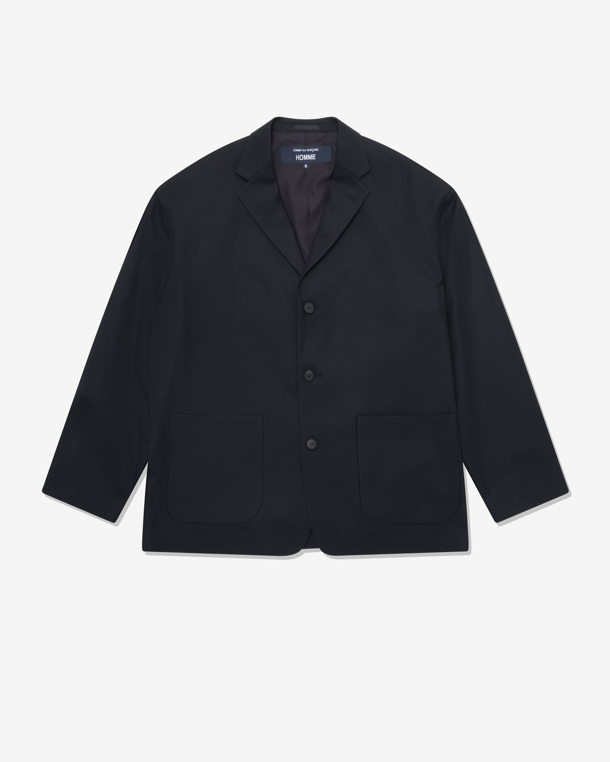 Single breast collarNotched lapelThree button closure Boxy fitFront patch pocketsInternal lining