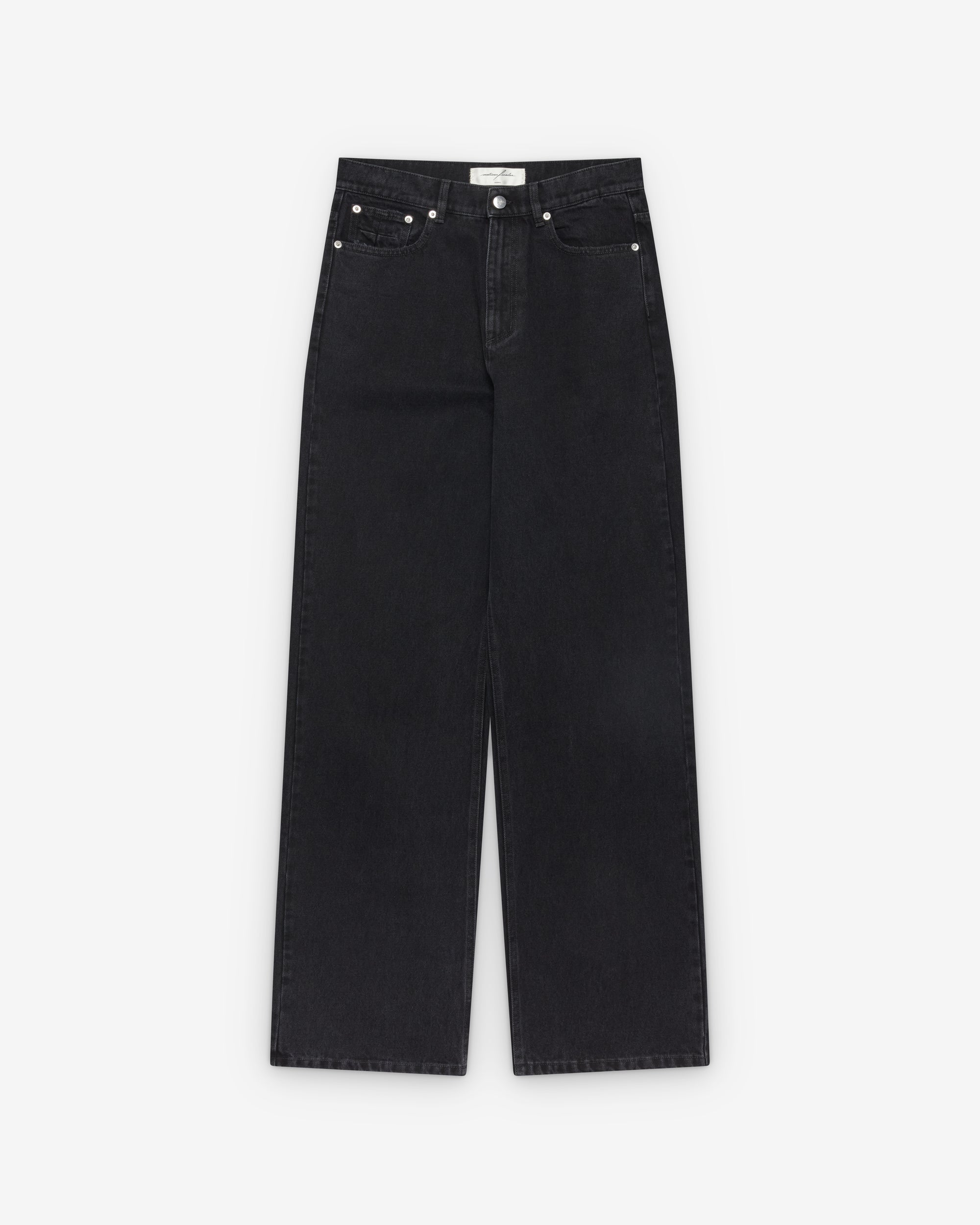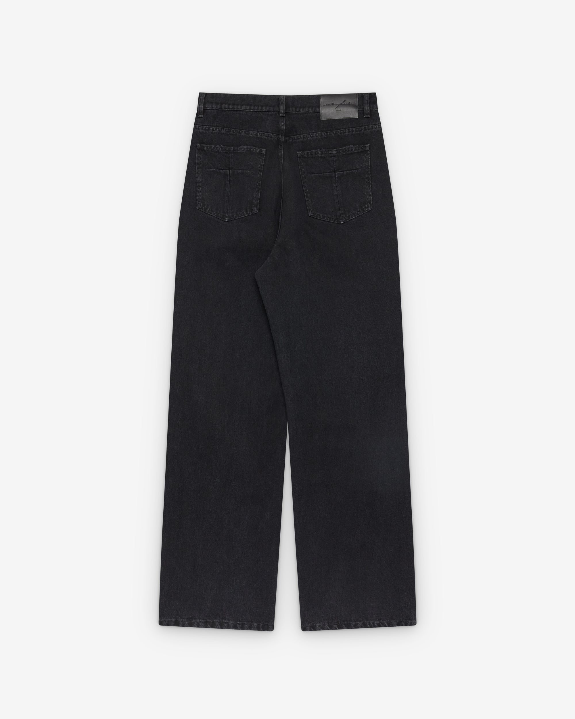 Button waist, zip flyFive pocket construction Metal rivet detailsLeather batch at waist band