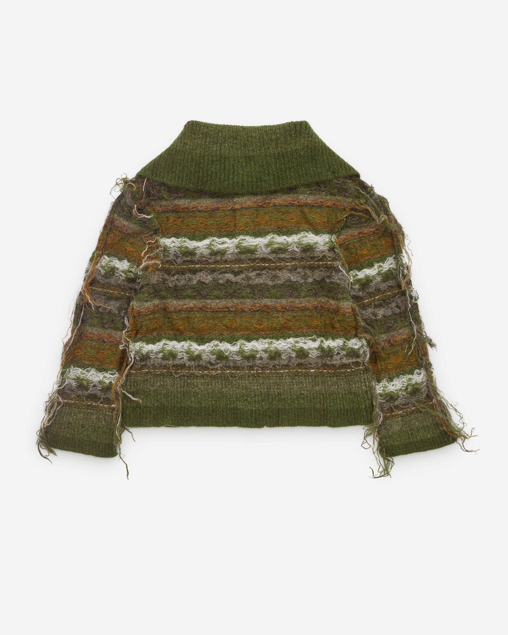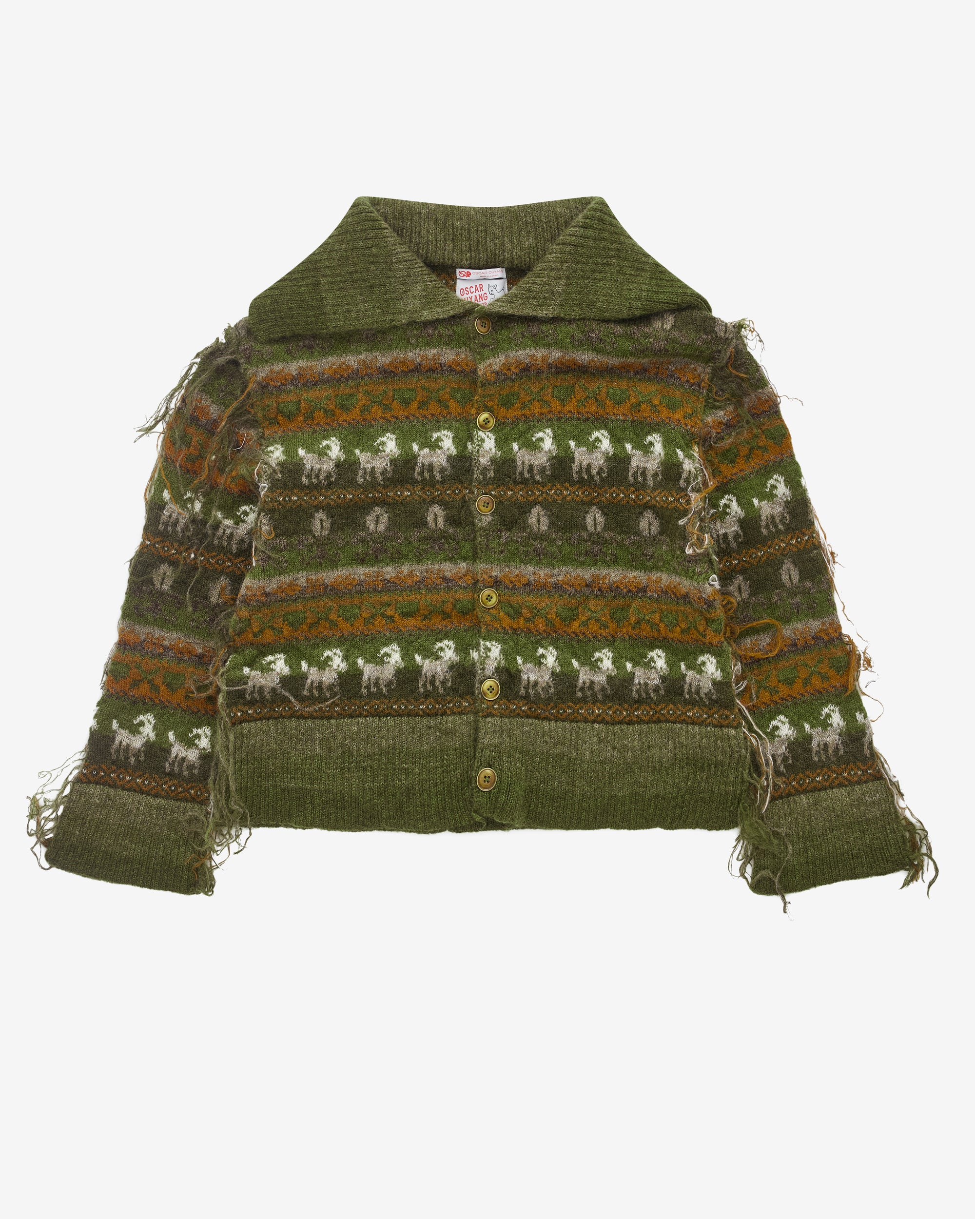 Distressed, frayed edgesButton front closureOversized fold down collarRibbed cuffs and hemBoxy fit