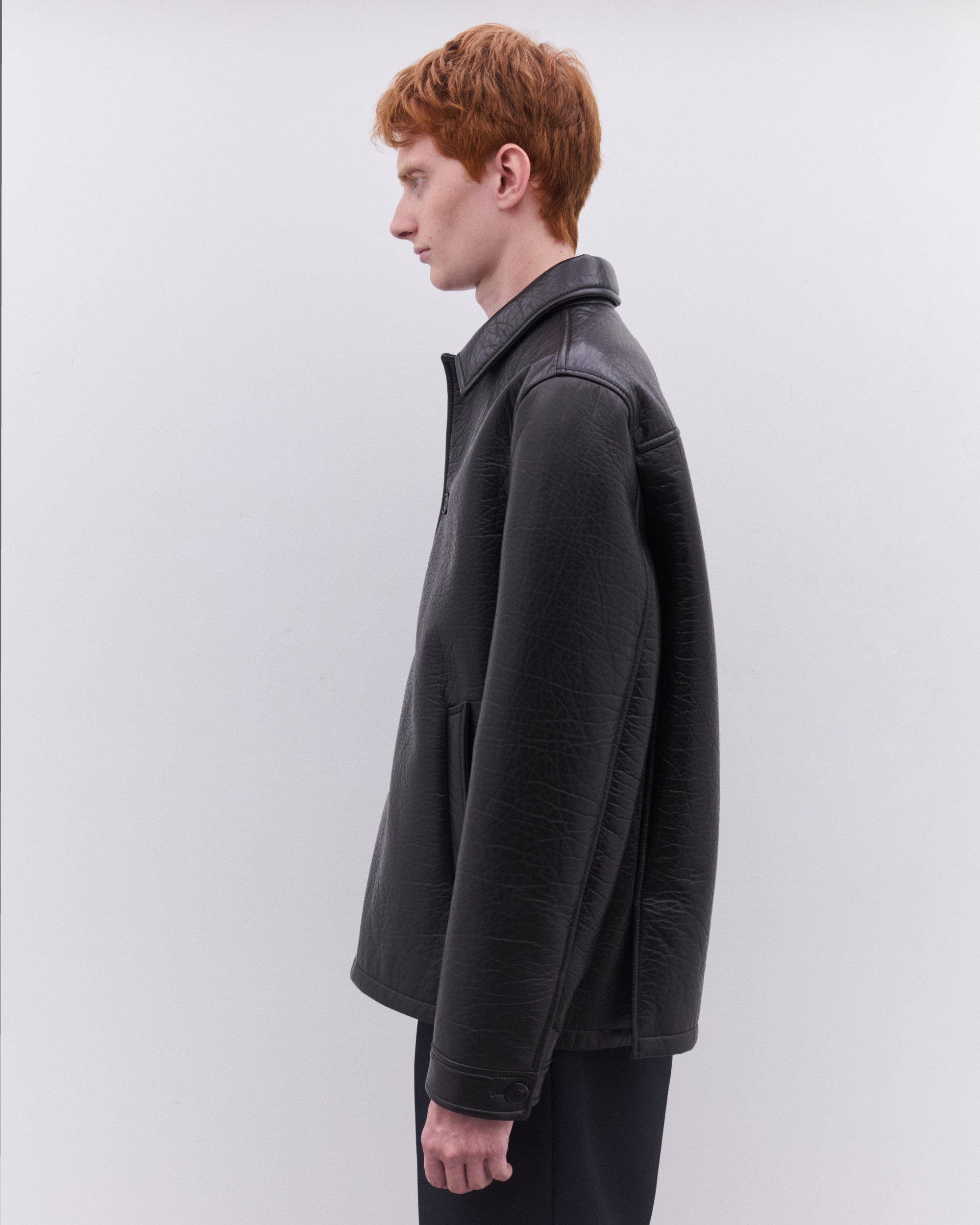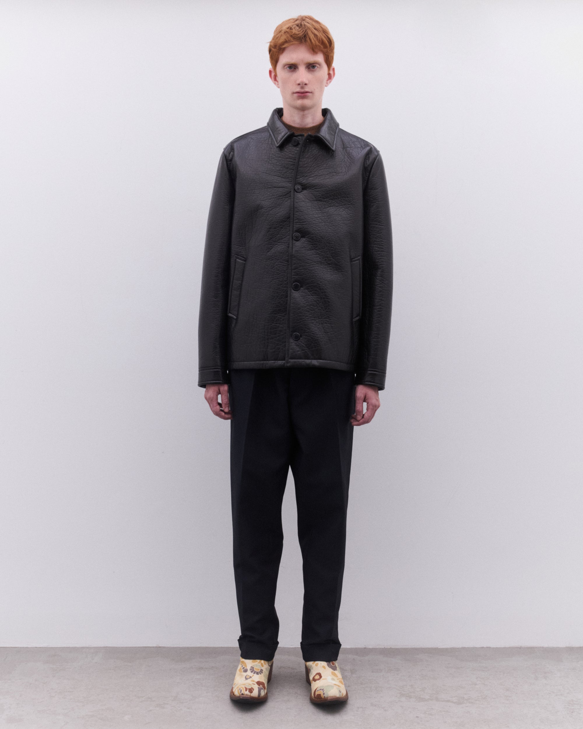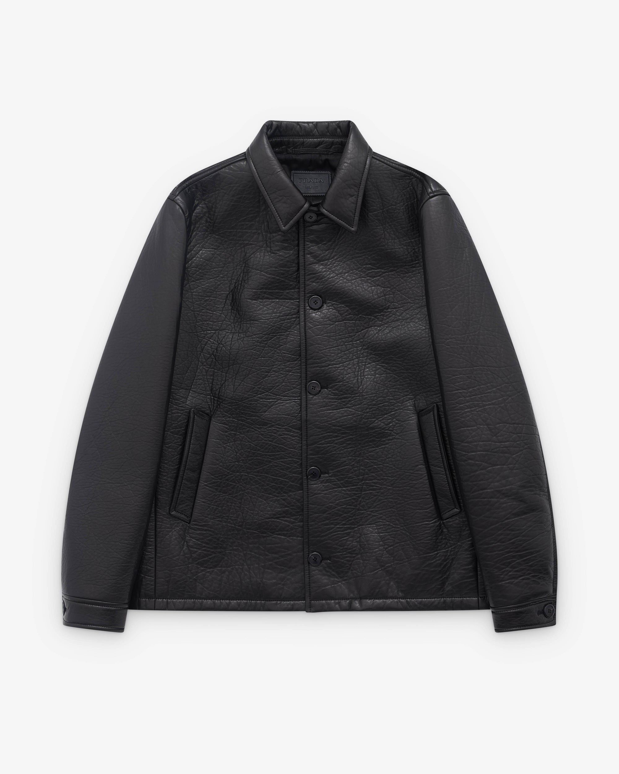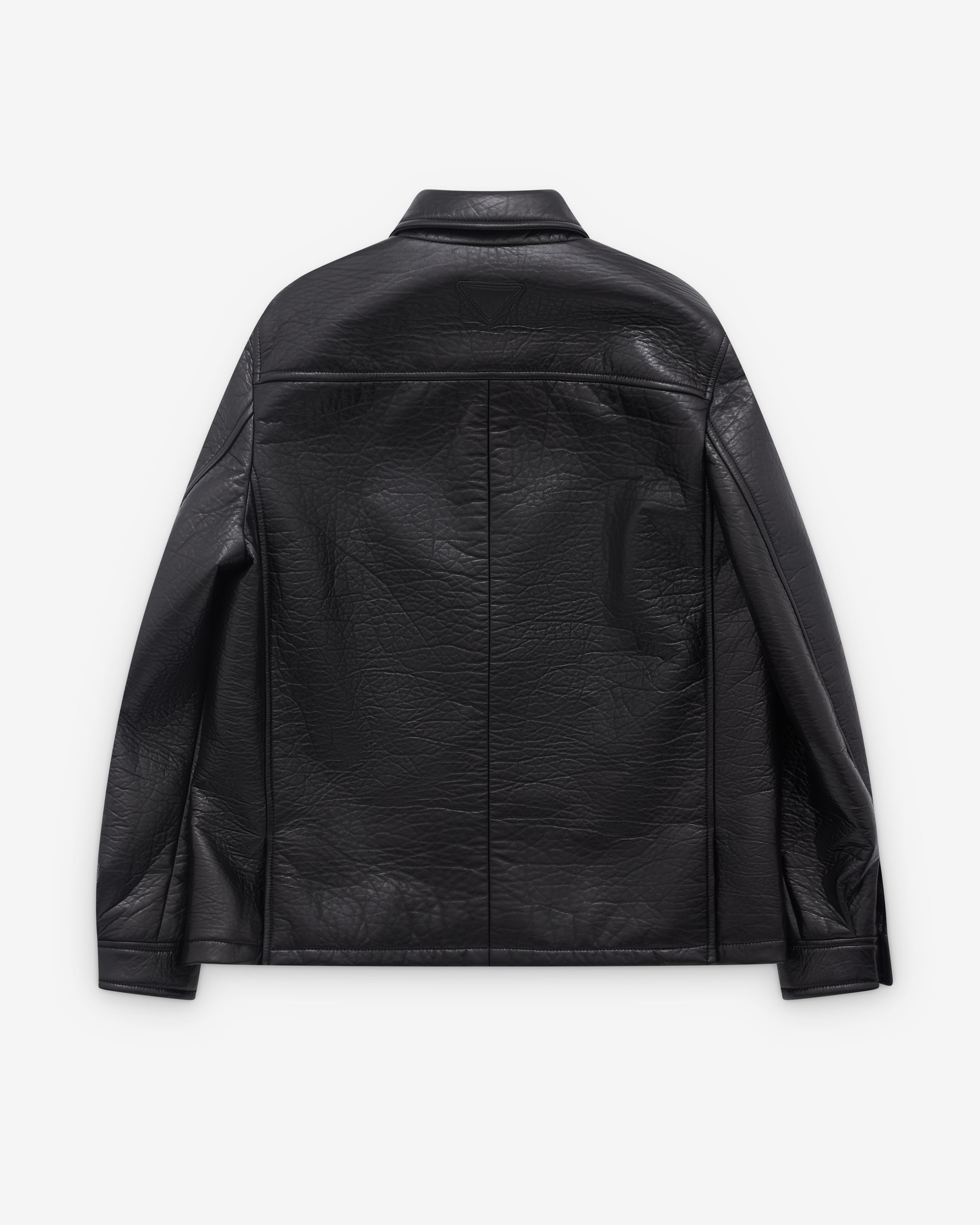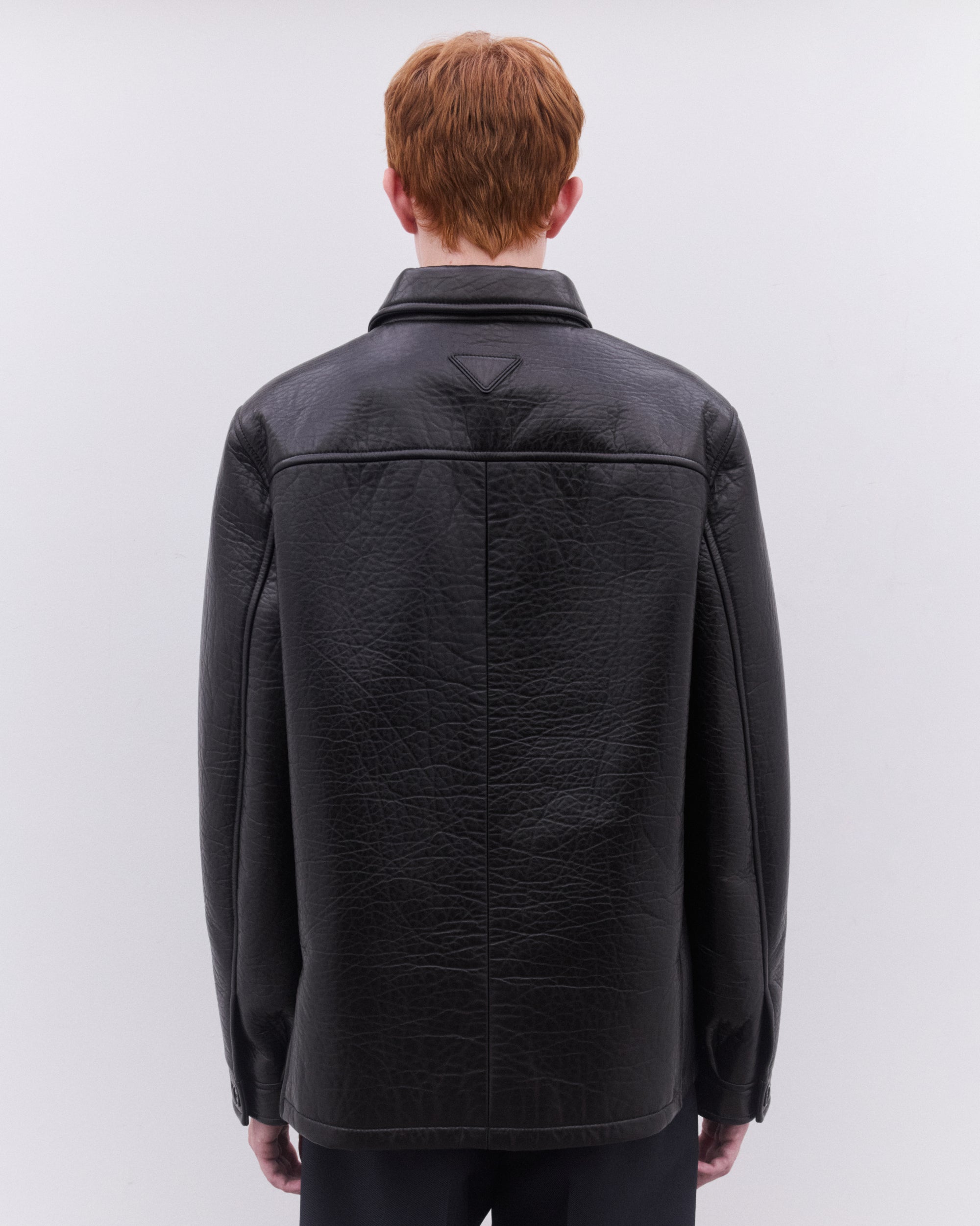 Lined garmentRegular fitCenter button closureShirt-style collarStraight sleeve with shirt-style cuffWide welt pocketsLeather triangle logo on the back