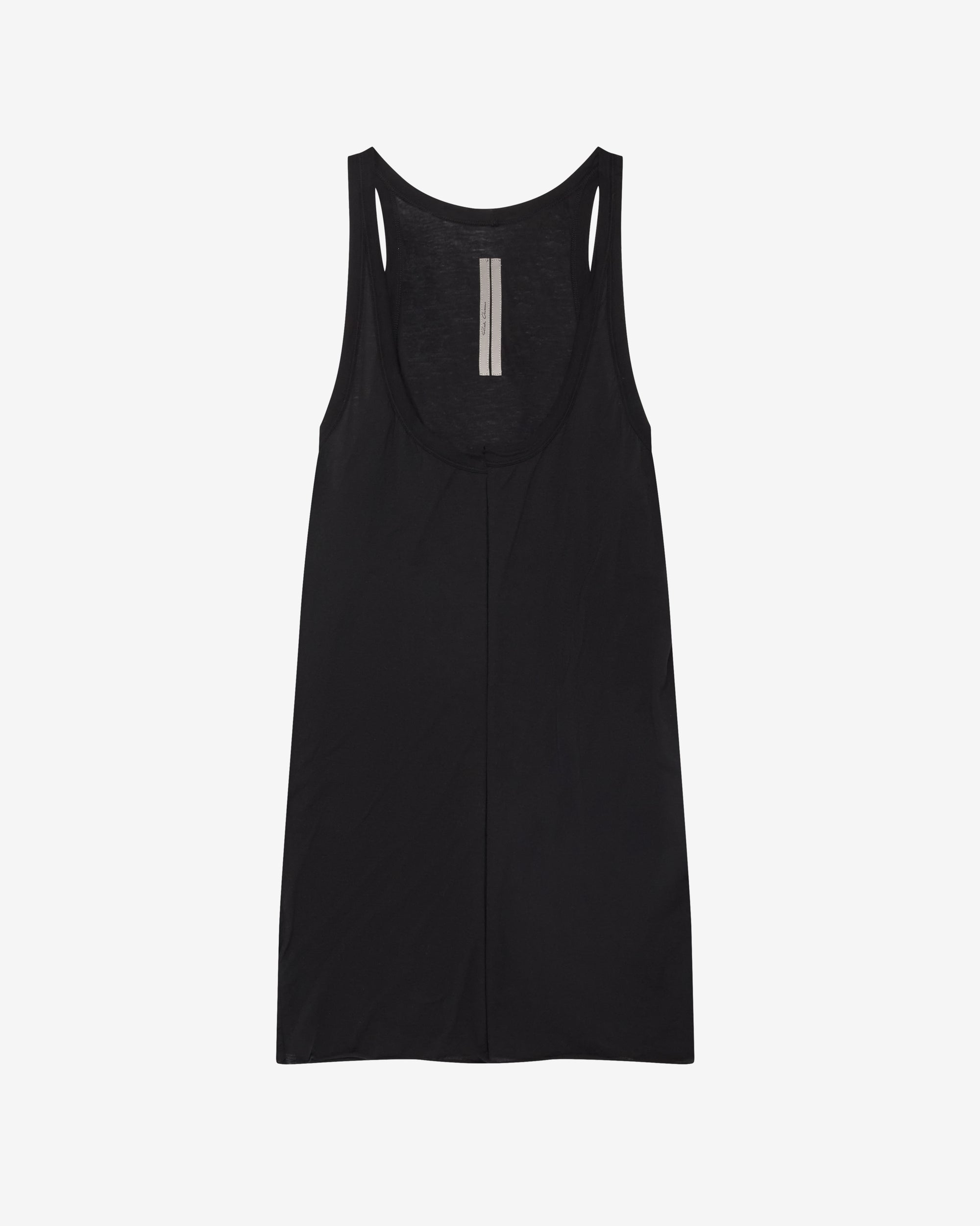 Below hip lengthLow scoop frontSlight racer backRounded raw cut hem thatHand cut up the front revealing the body