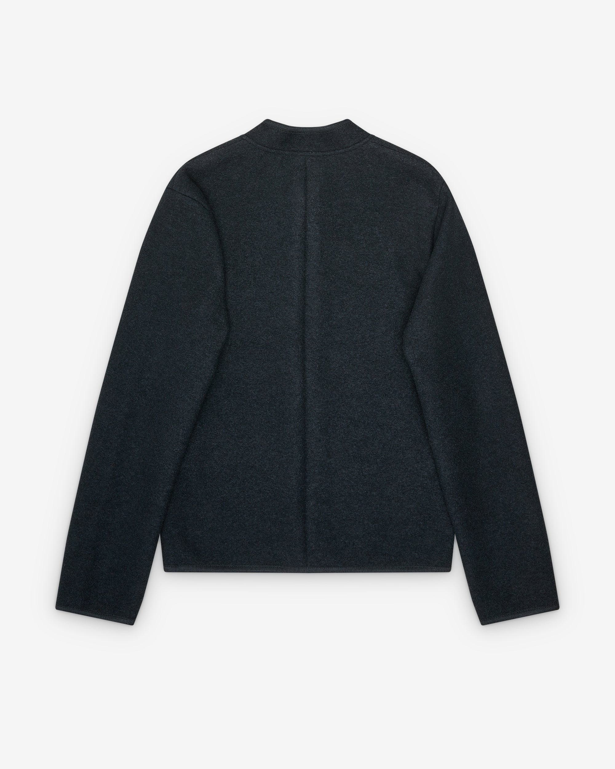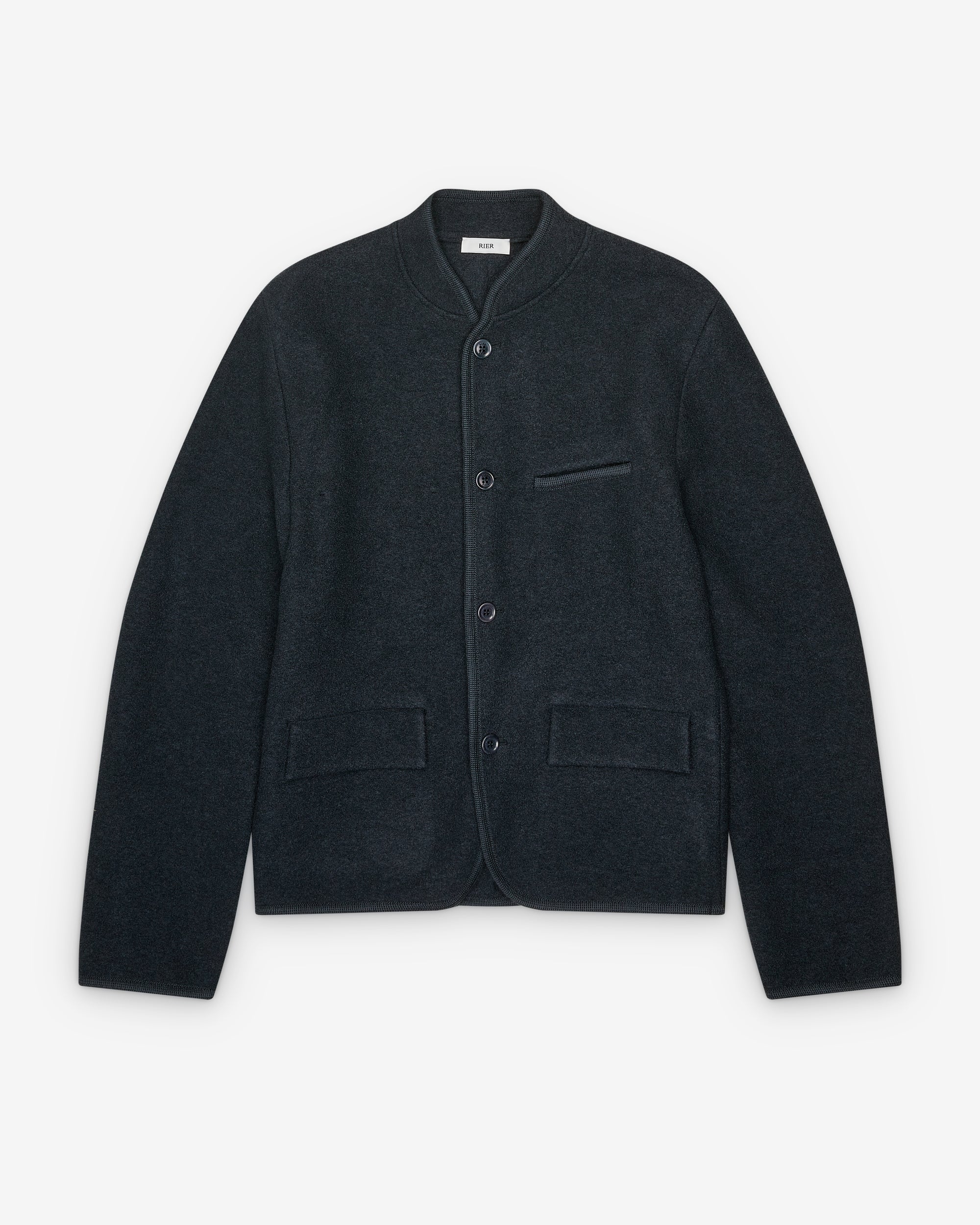 CollarlessButton front closureFront flap pocketsChest pocketSeam down center backMade in Austria