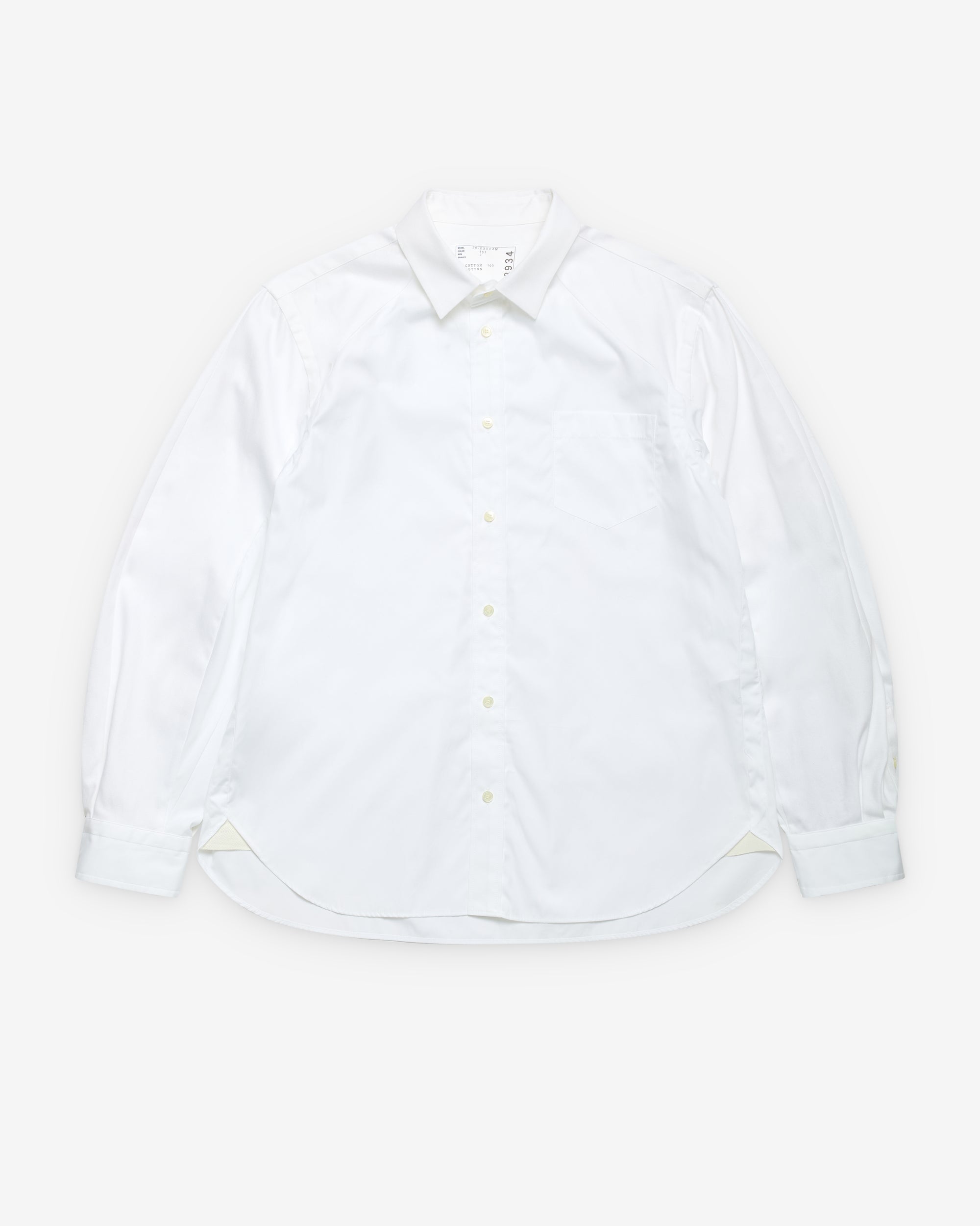 Point collarVoluminous sleevesCurved hemButton fasteningCentral rear pleat