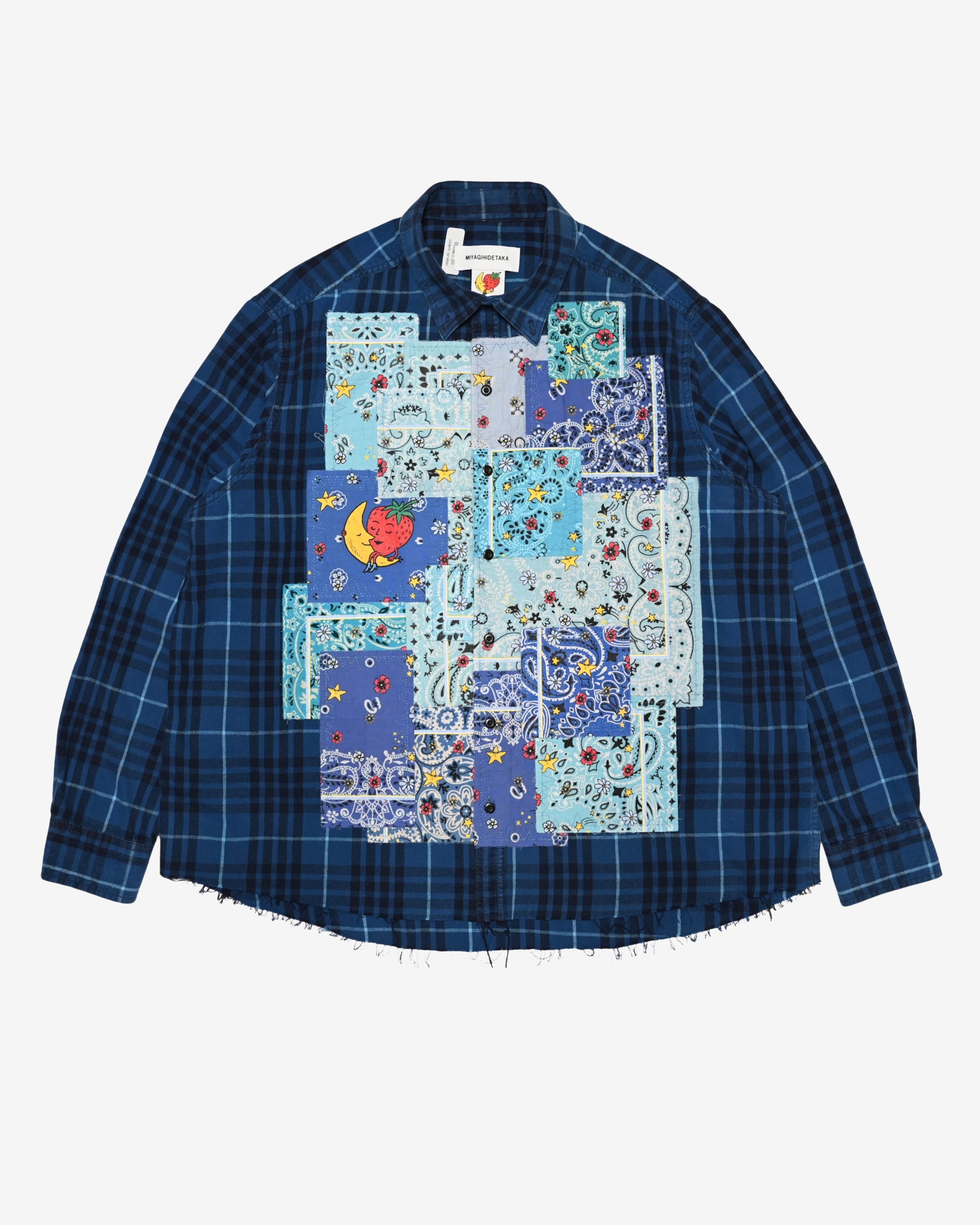 One-of-one vintage flannel shirts sourced and reworked by Miyagi Hidetaka. Each features a unique paneled patchwork customization made from vintage, made-in-US bandanas updated with Sky High Farm Goods' classic bandana print.