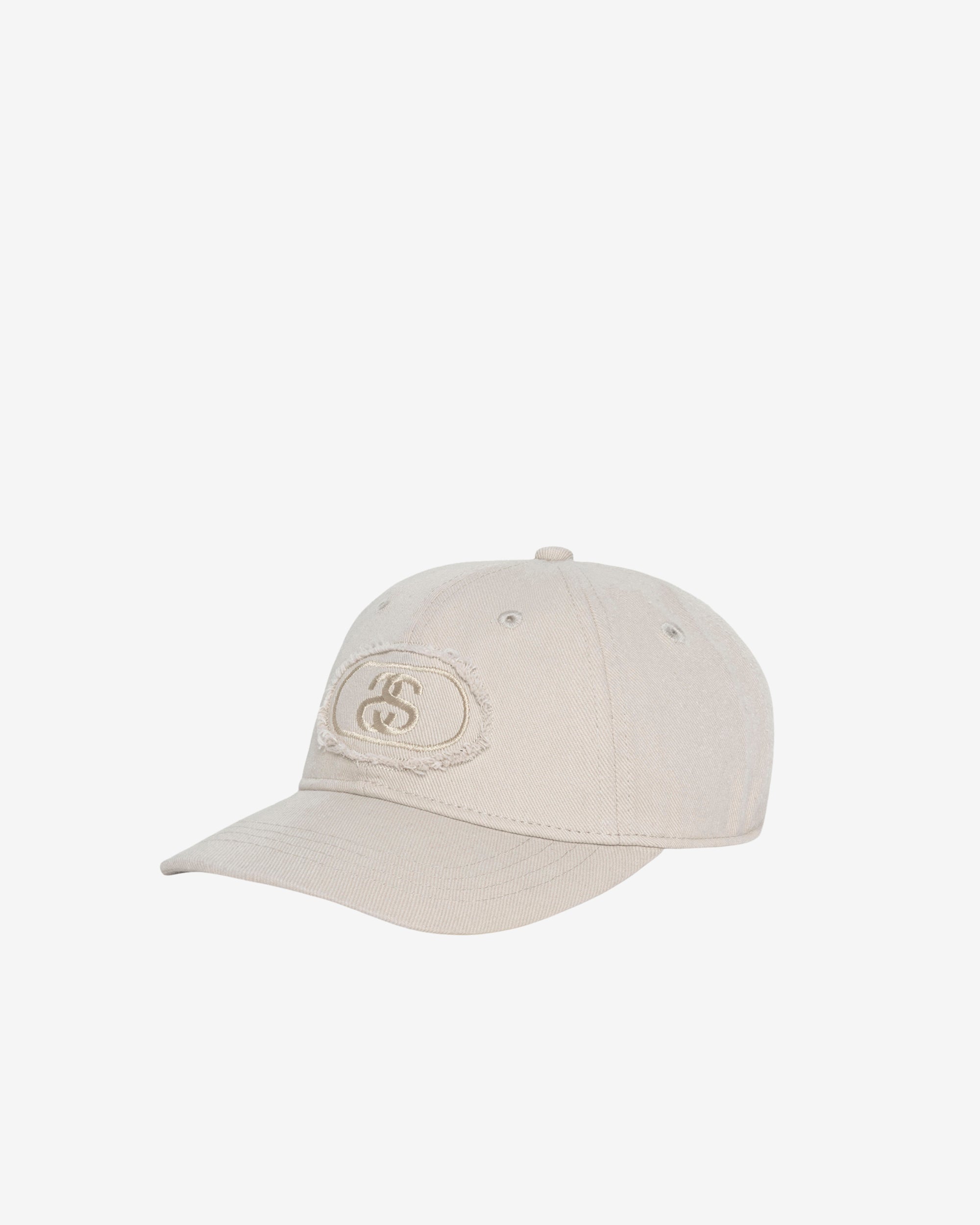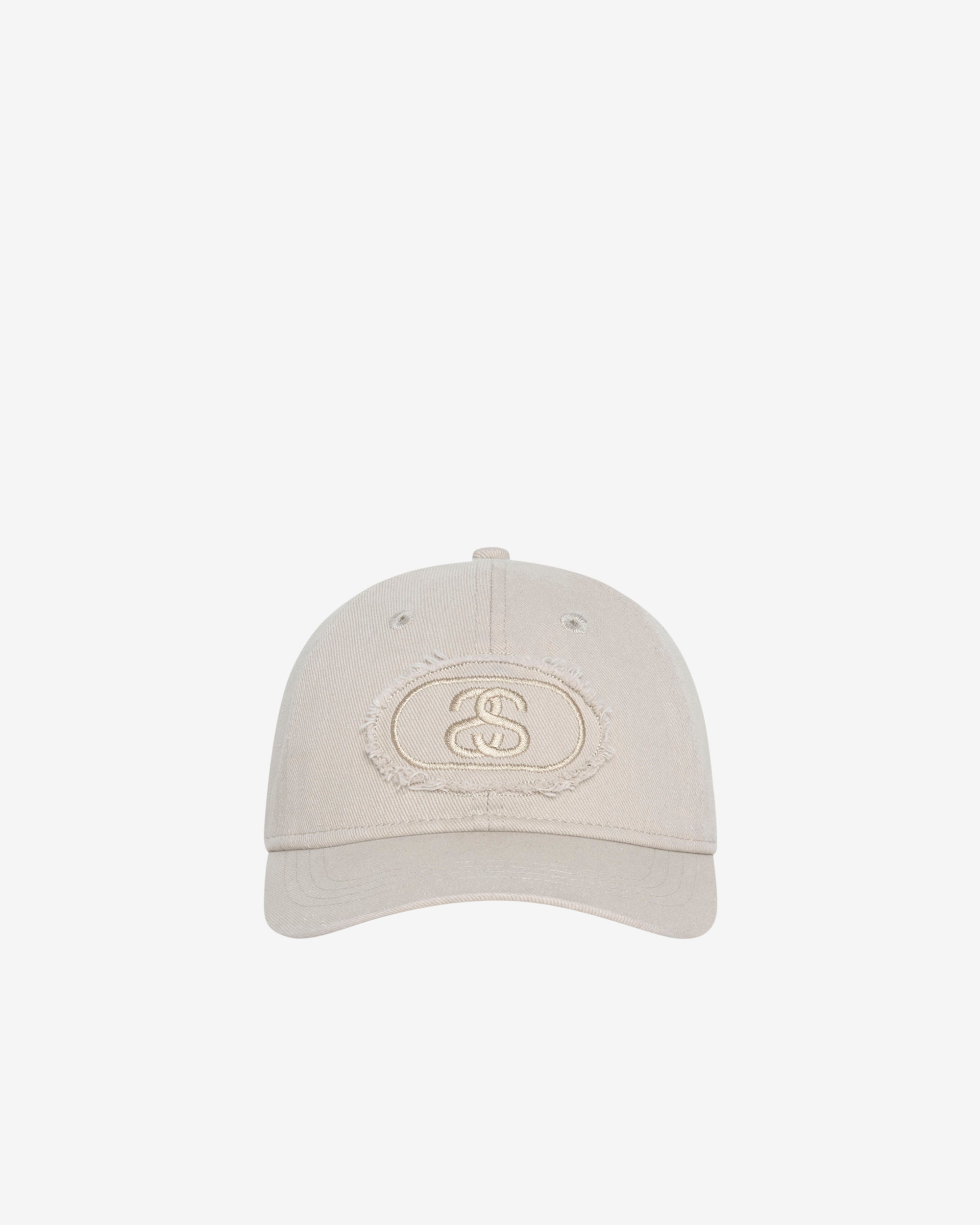 Mid-depth five panel cotton twill cap. Stüssy stock logo in raised embroidery across the front.