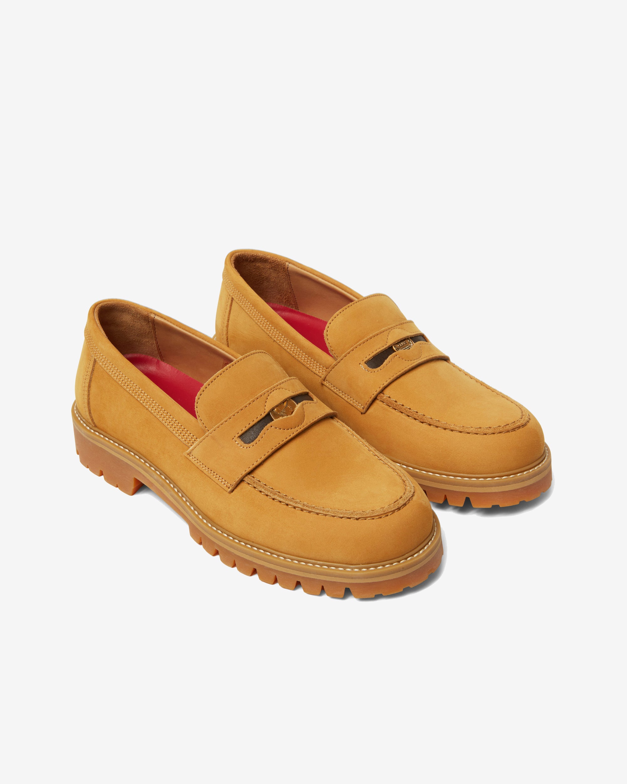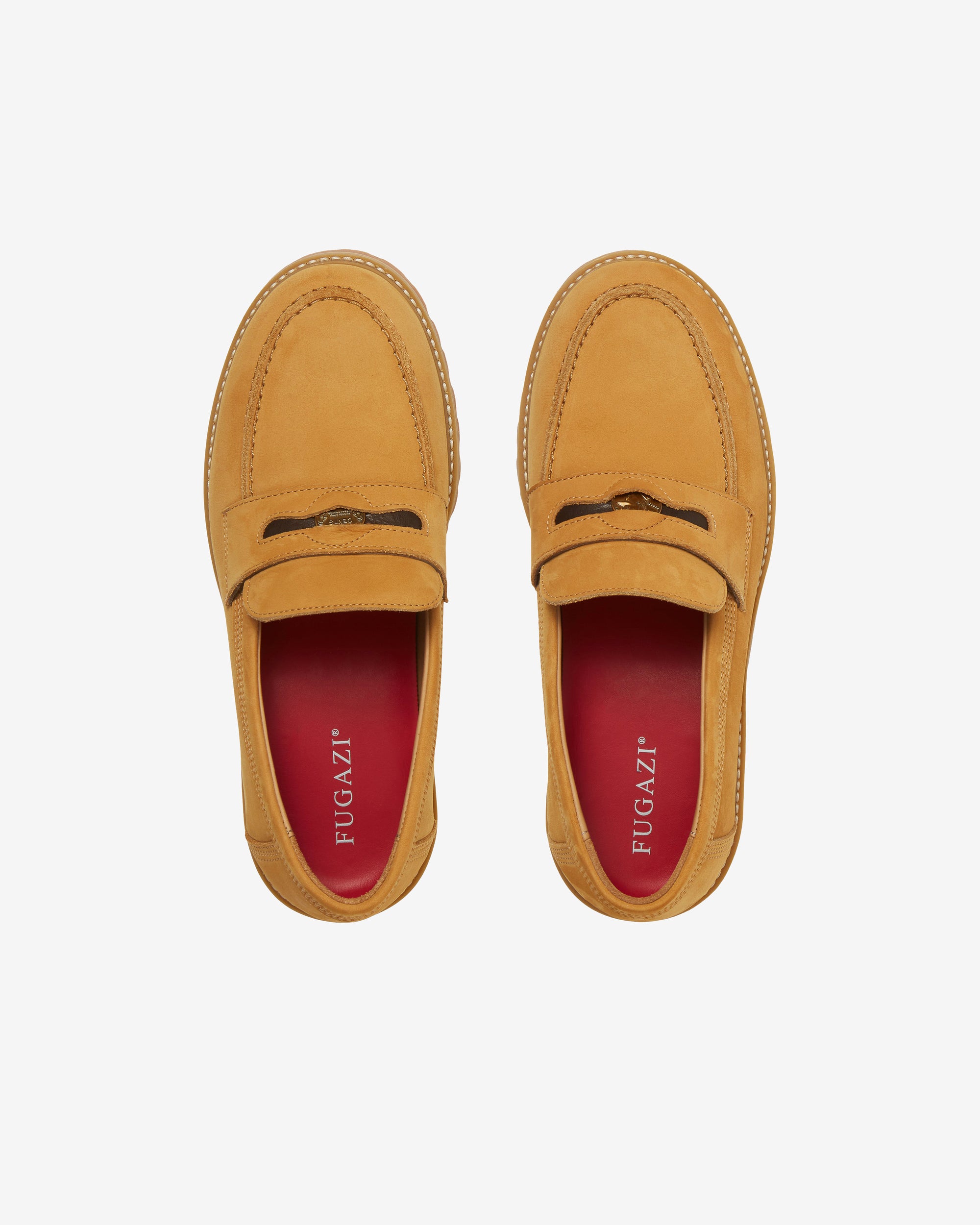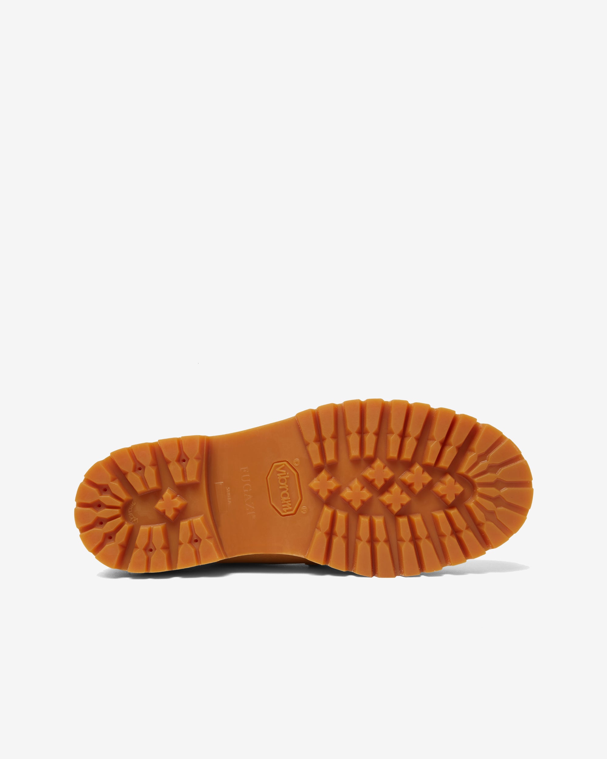 Leather nubuck upperVibram® rubber lug soleRemovable two cent coinRed leather interior lining