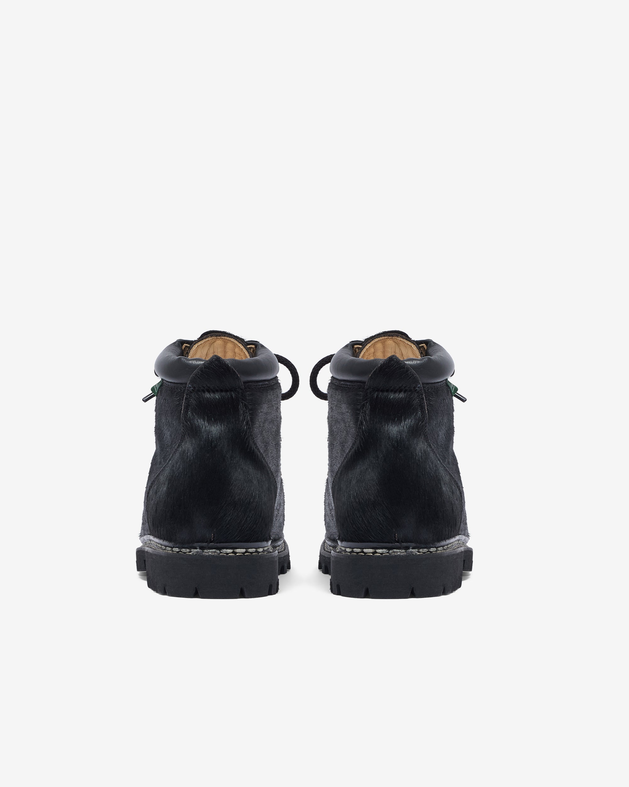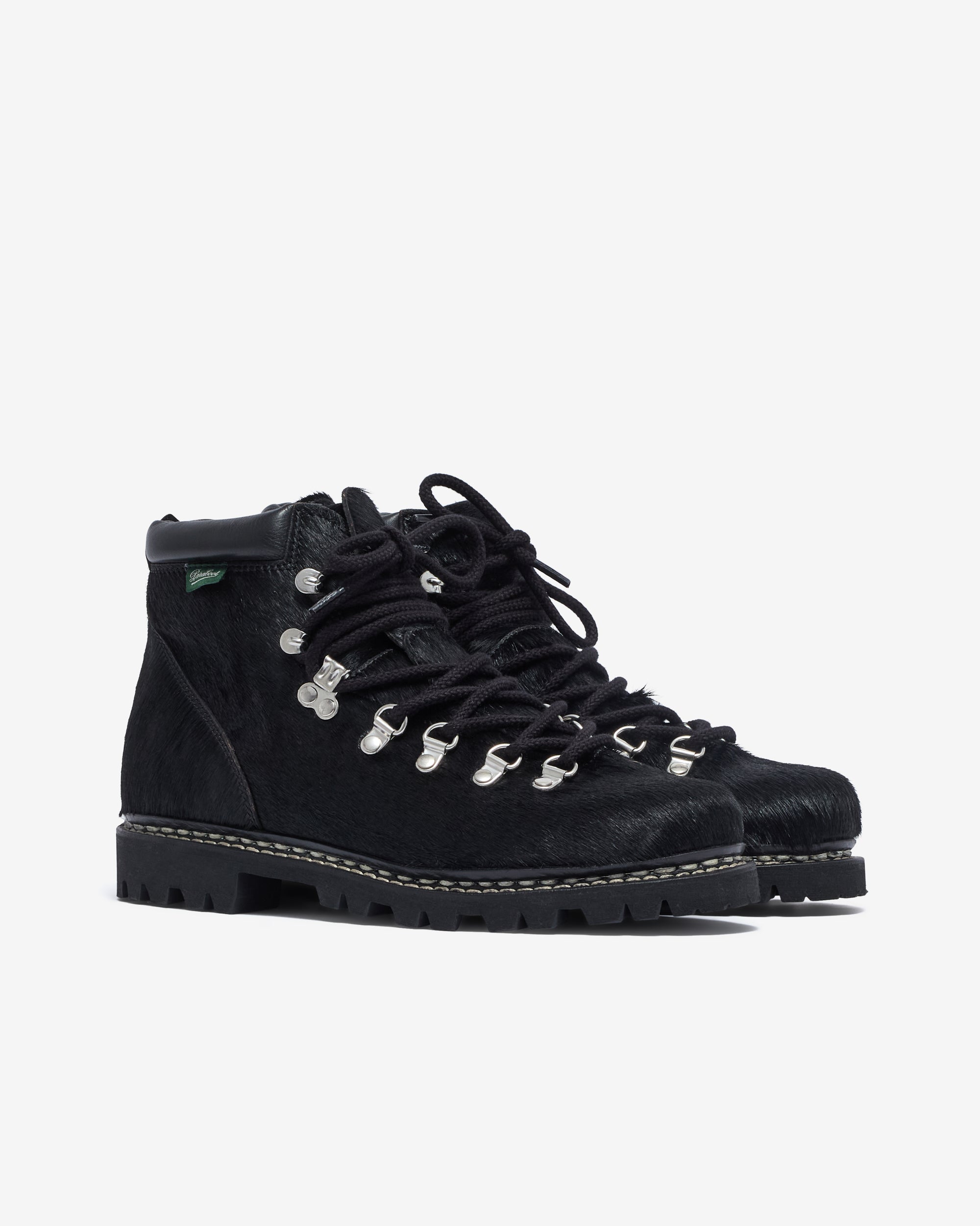 Ankle boot hight Cowhide pony hair upperHiker boot lacing systemRounded toe boxInternal leather lining Norwegian storm welt constructionRubber lug outsoleParaboot tab label