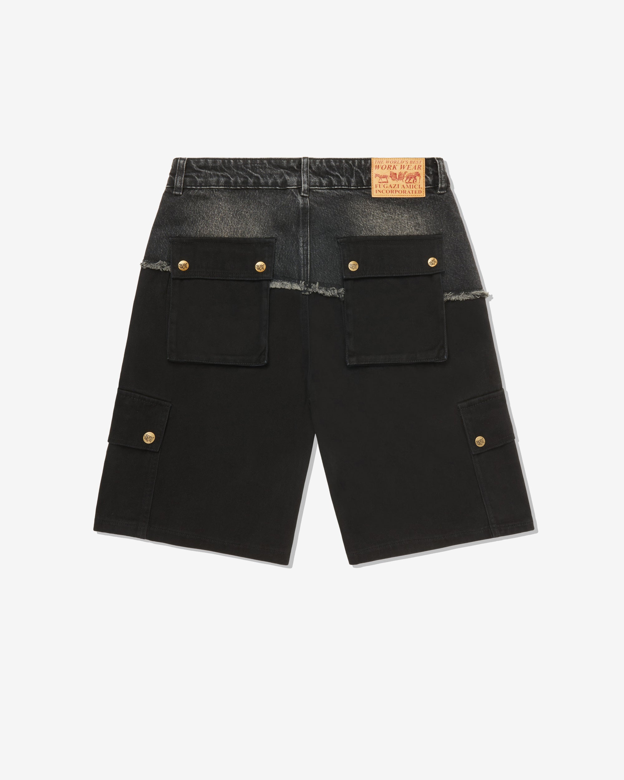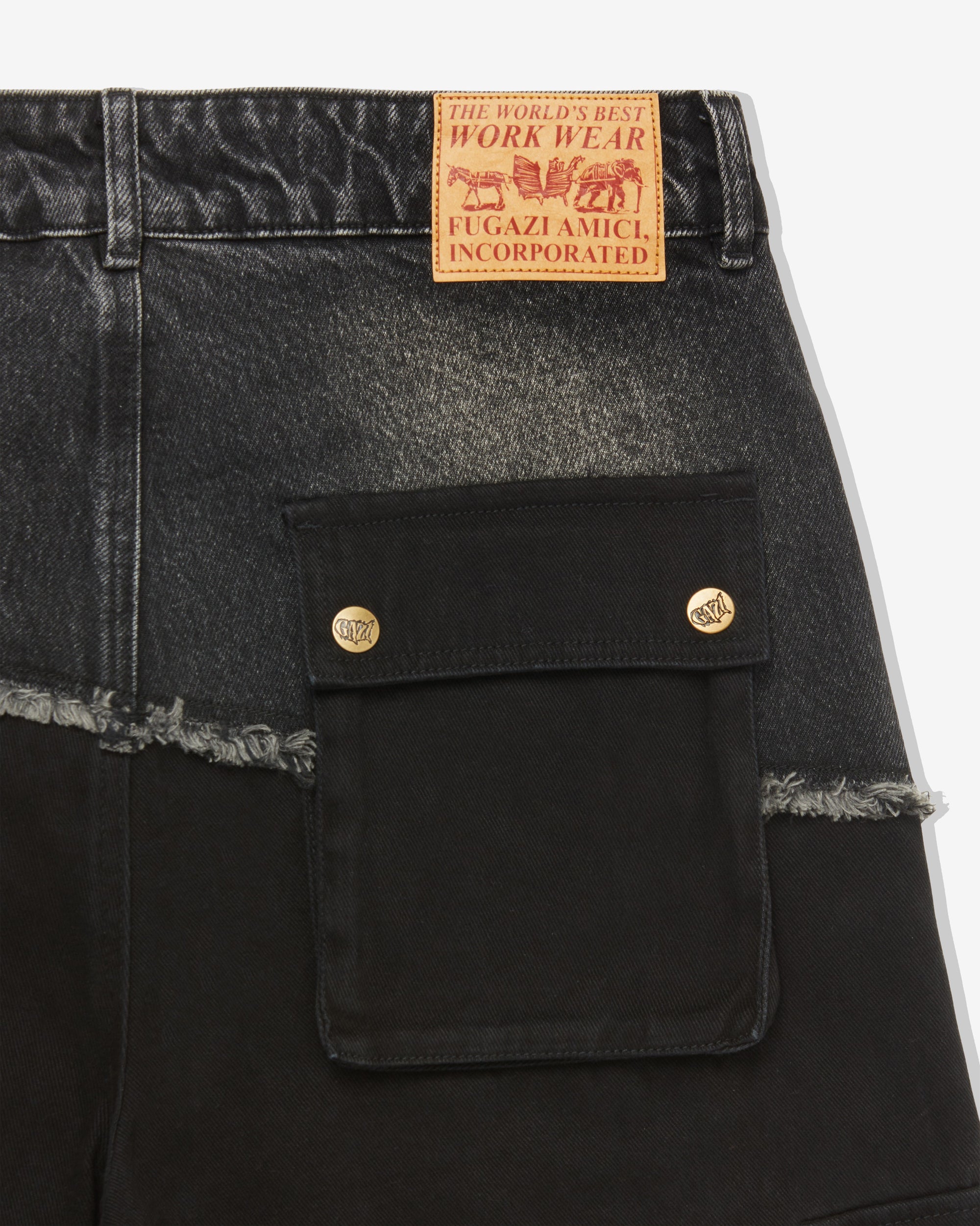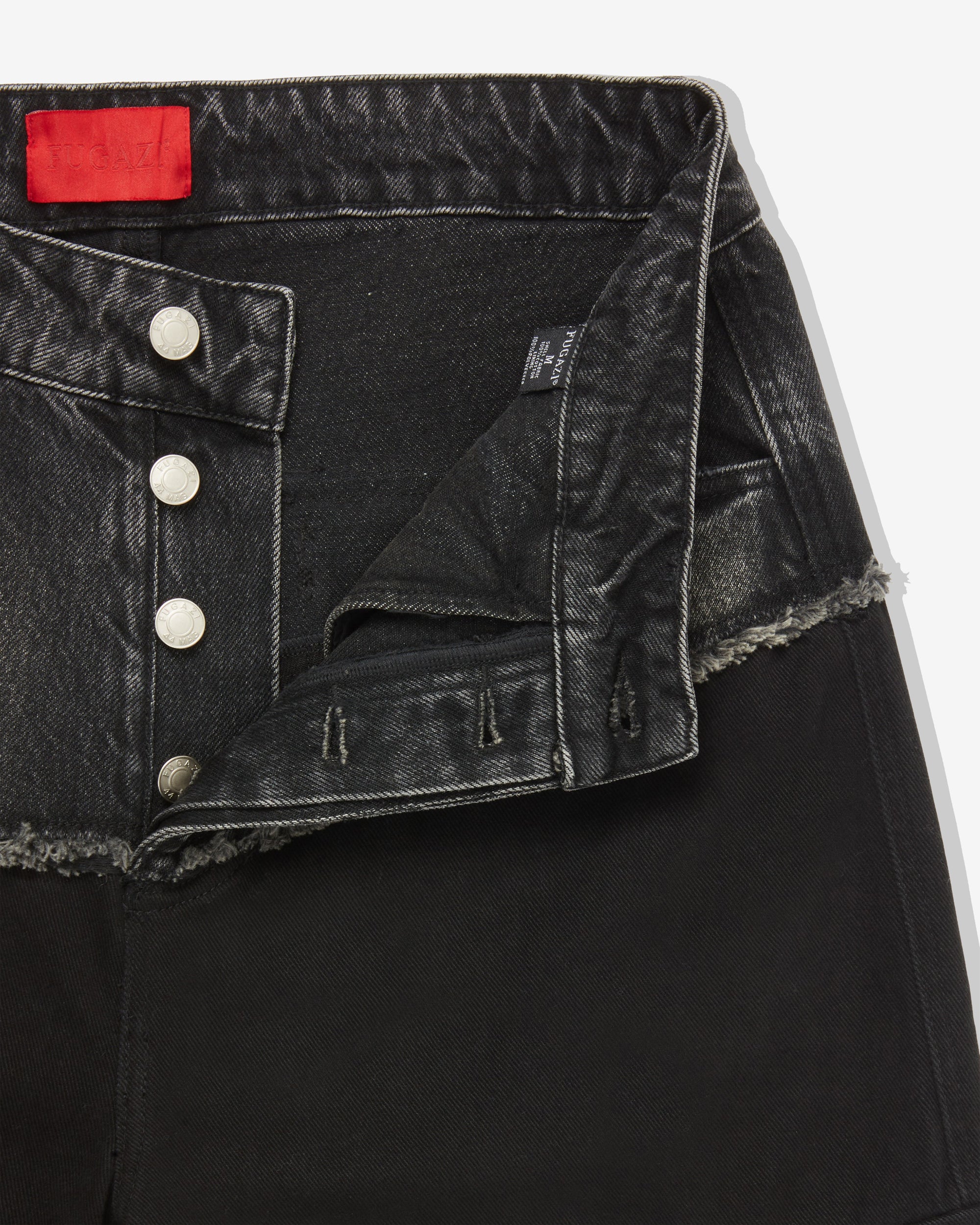 Button fly closureWide legBelt loopsContrast topstitchingPrinted detail at leg