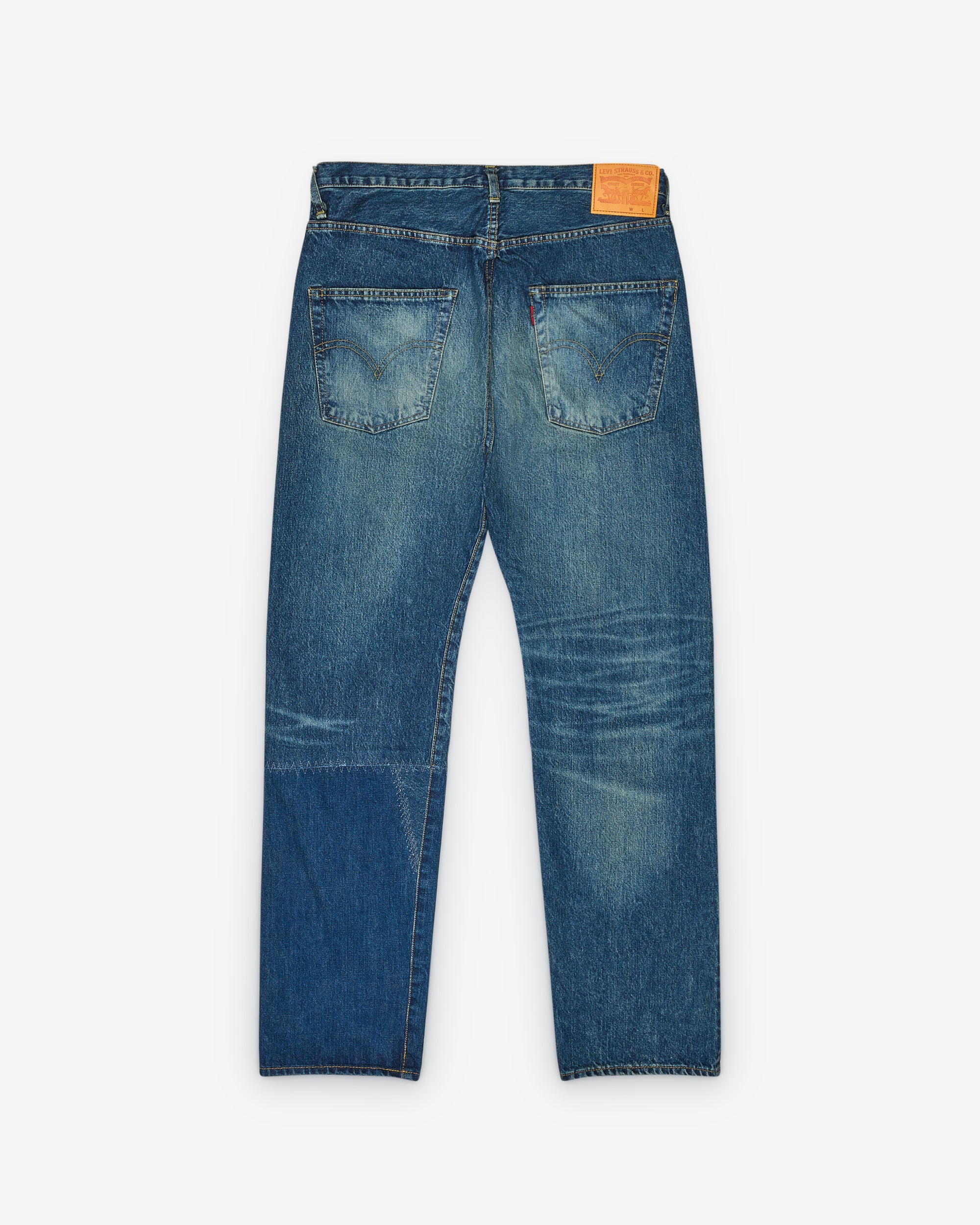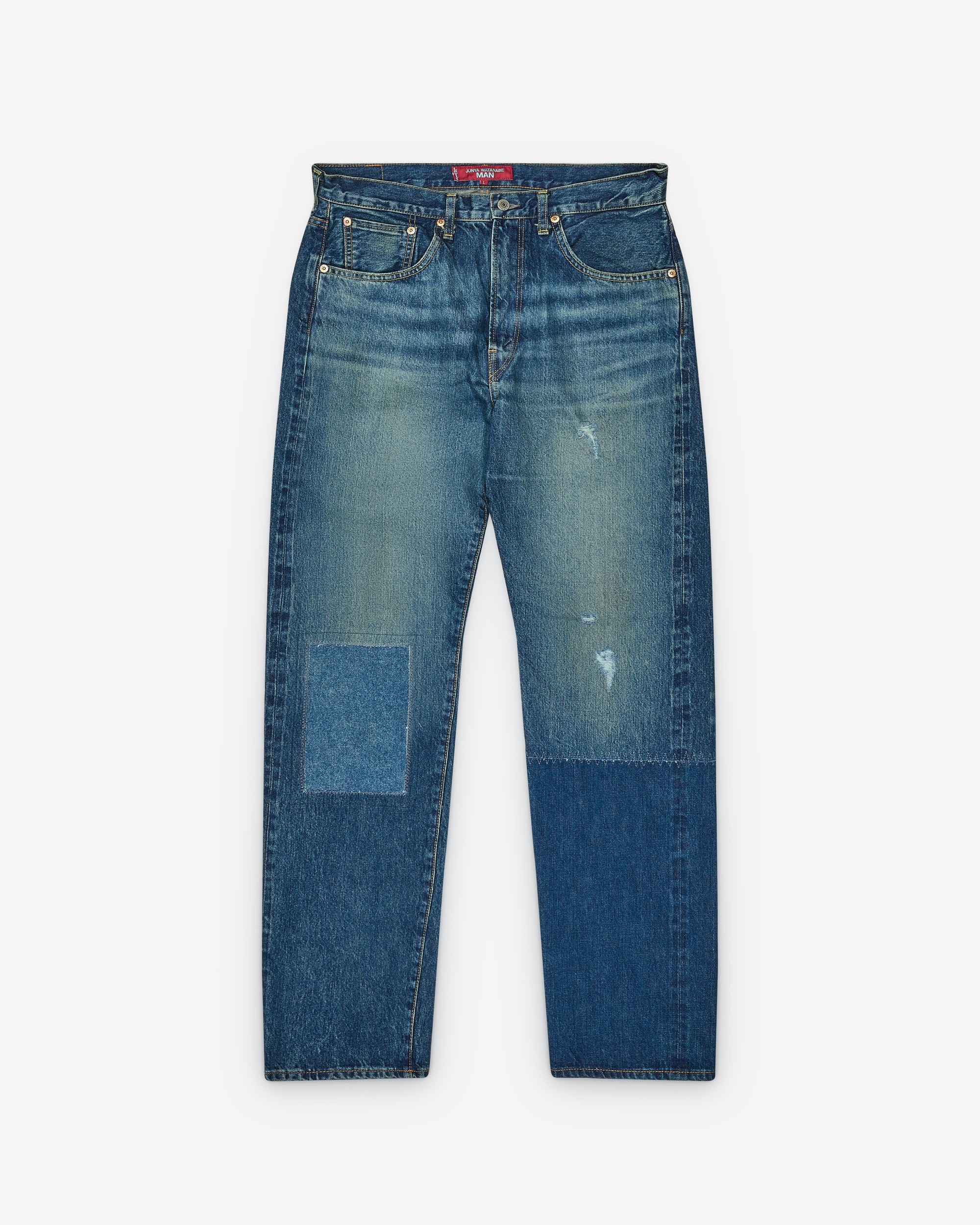 Distressed and patch detailingTwo-toned washStraight leg100% CottonMade in Japan