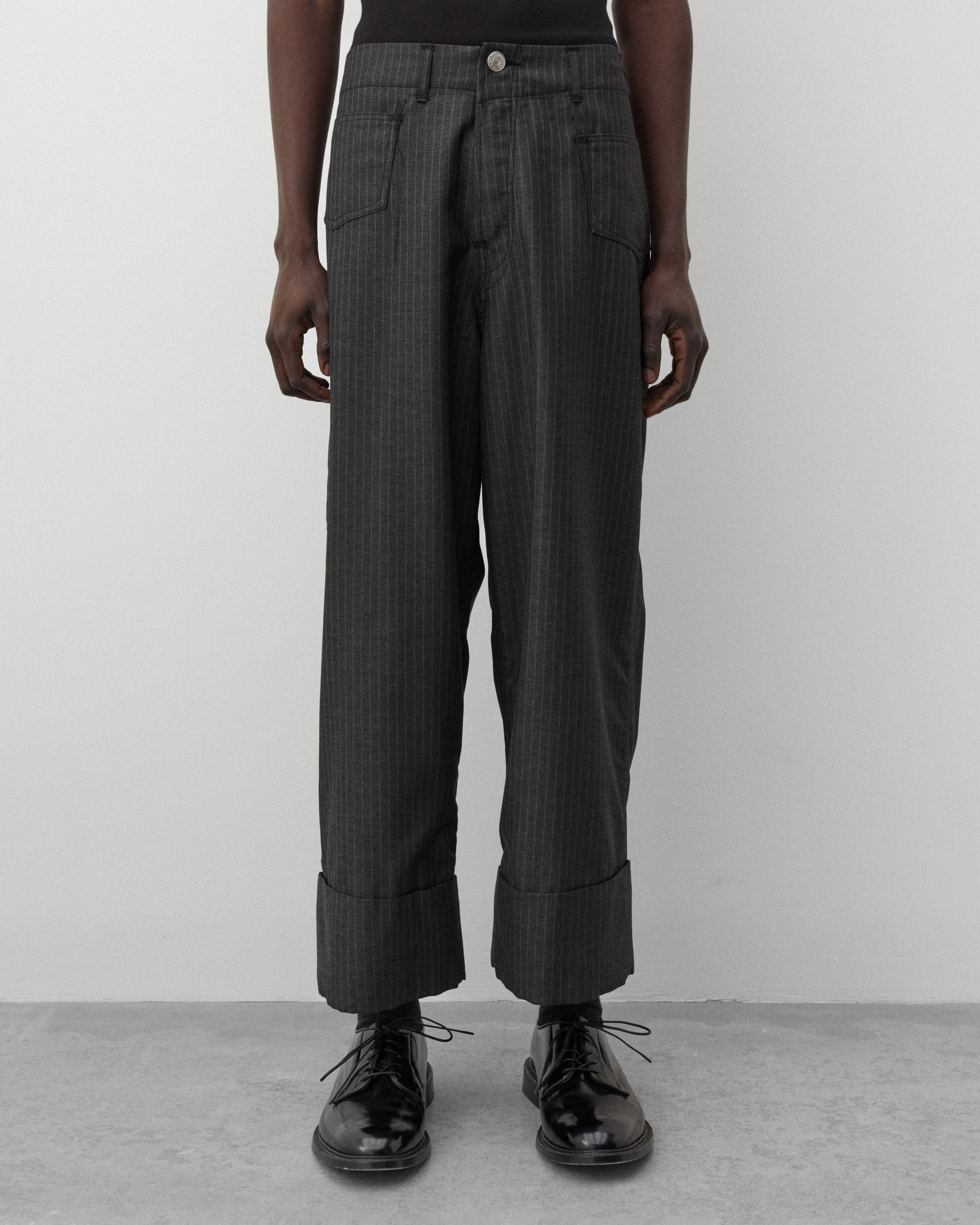 Front button waist closureTwo front pocketsWide legCuffed ankles Pin stripe fabric Levi's tab label at rear pocketLeather patch at waist