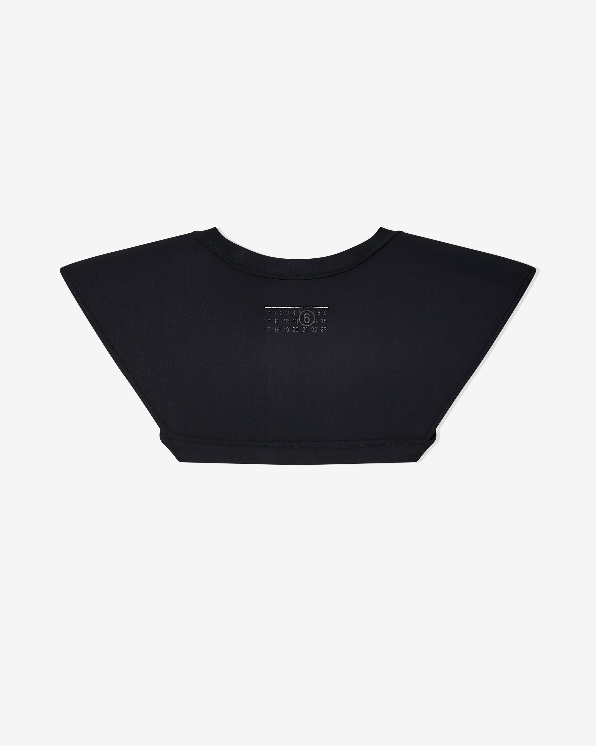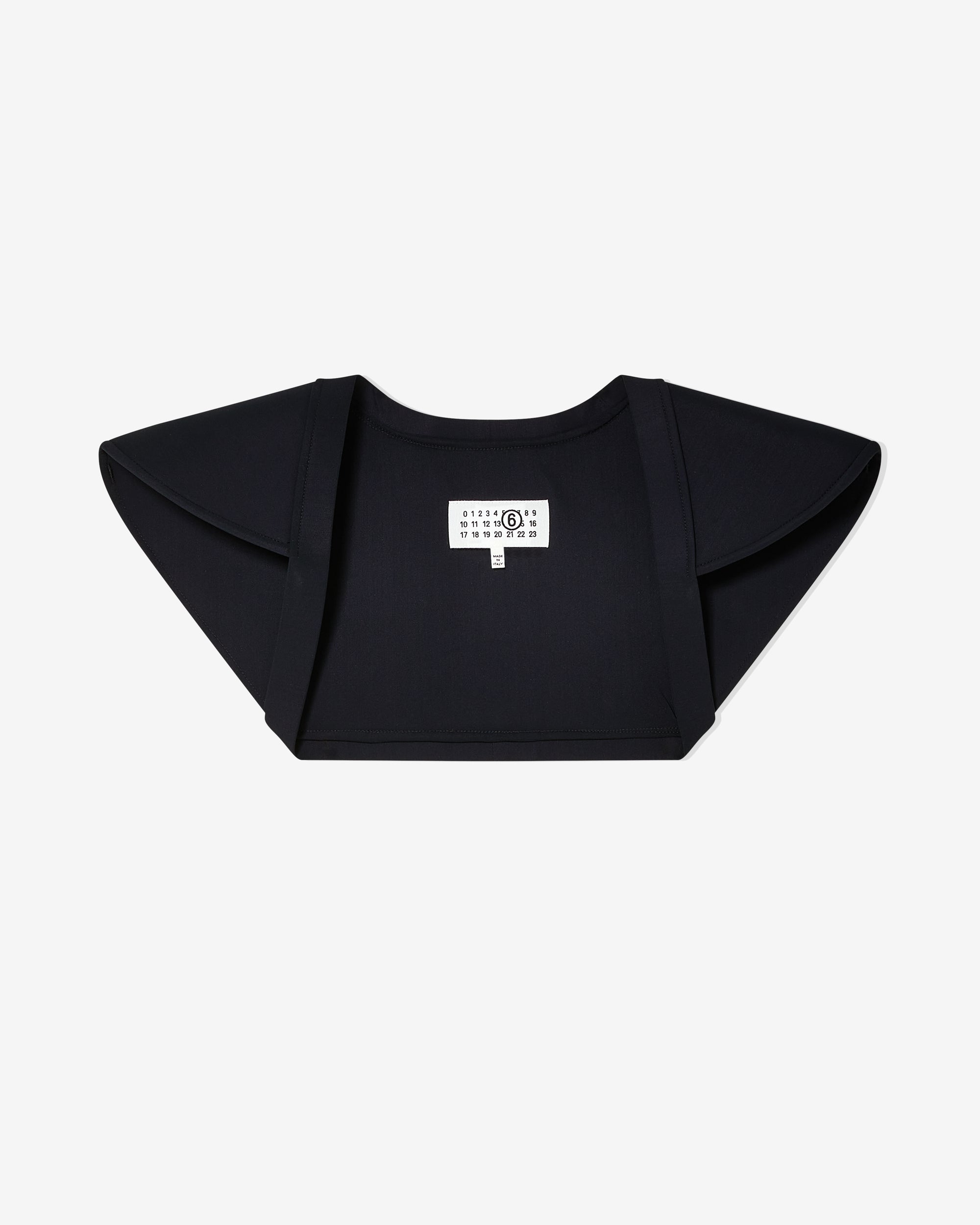 Winged shoulders Square neckline Cropped hem White stitch line at the back