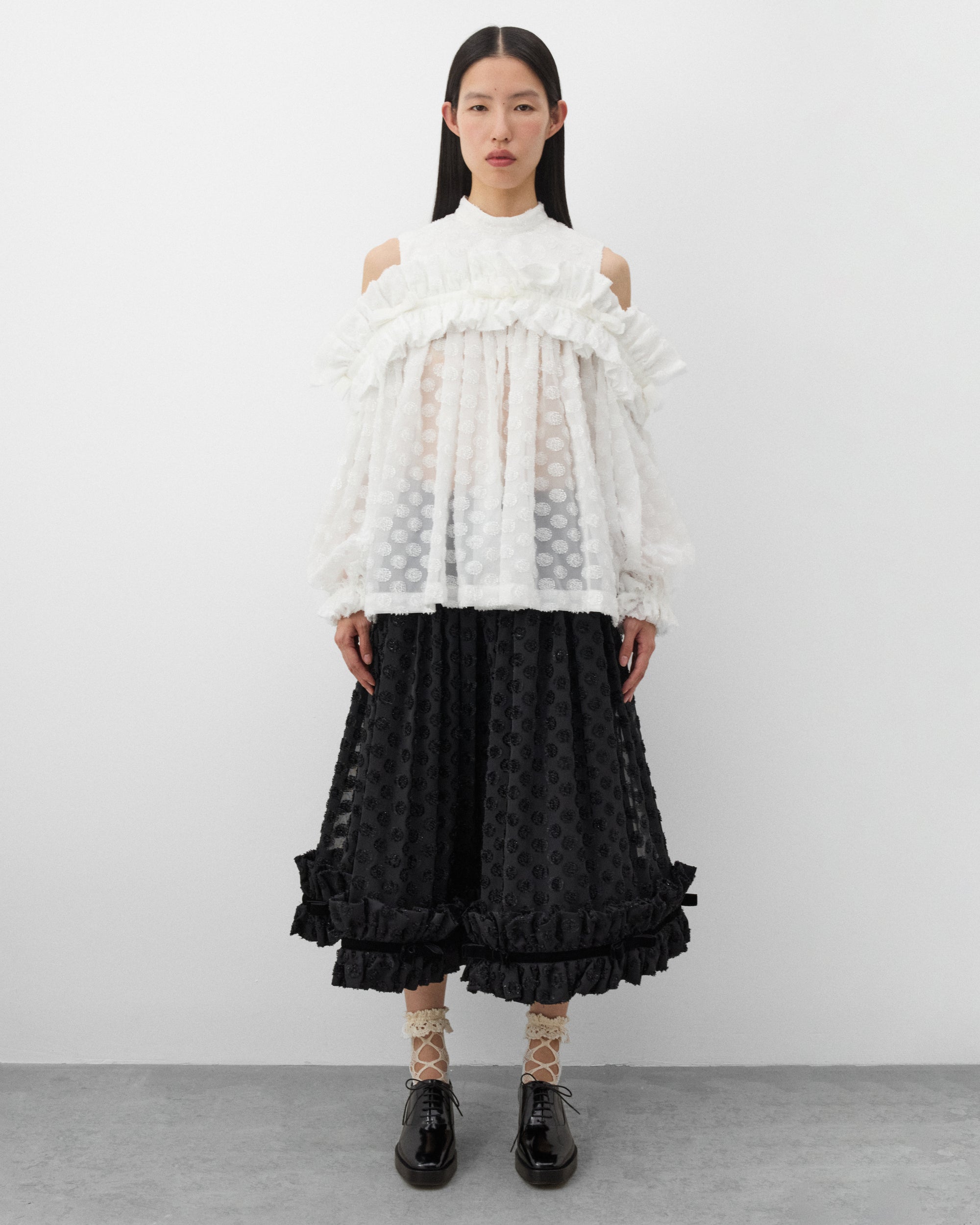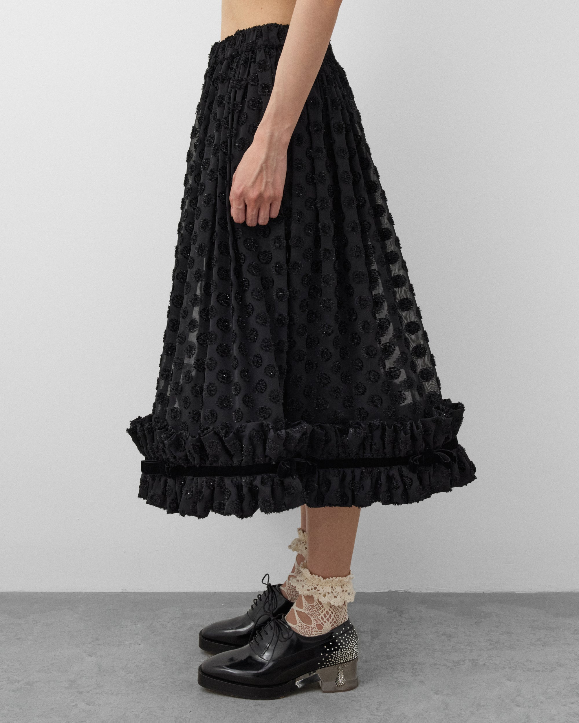 Polka dots pattern cut jacquard georgetteElasticated waist bandPleated skirtMidi length