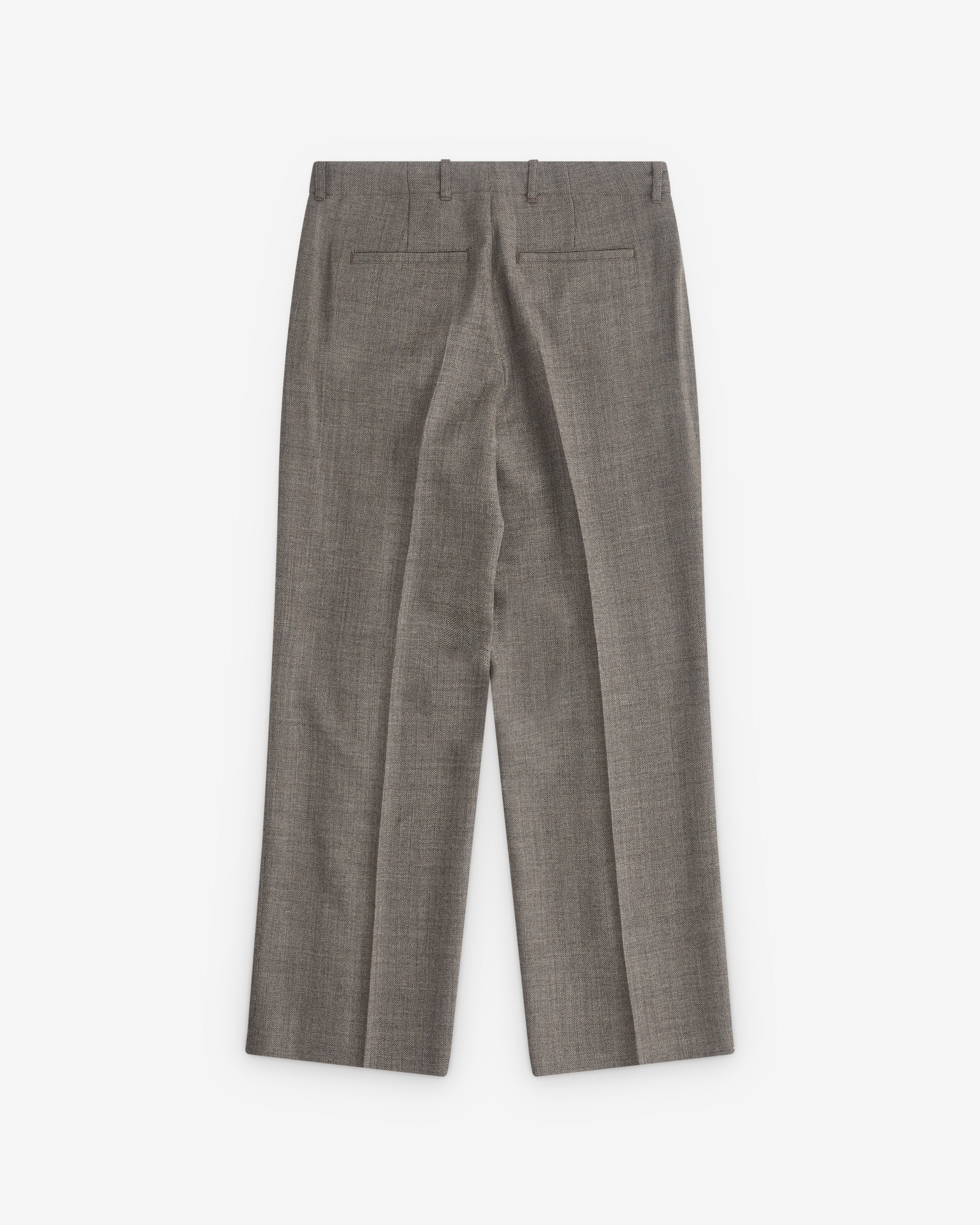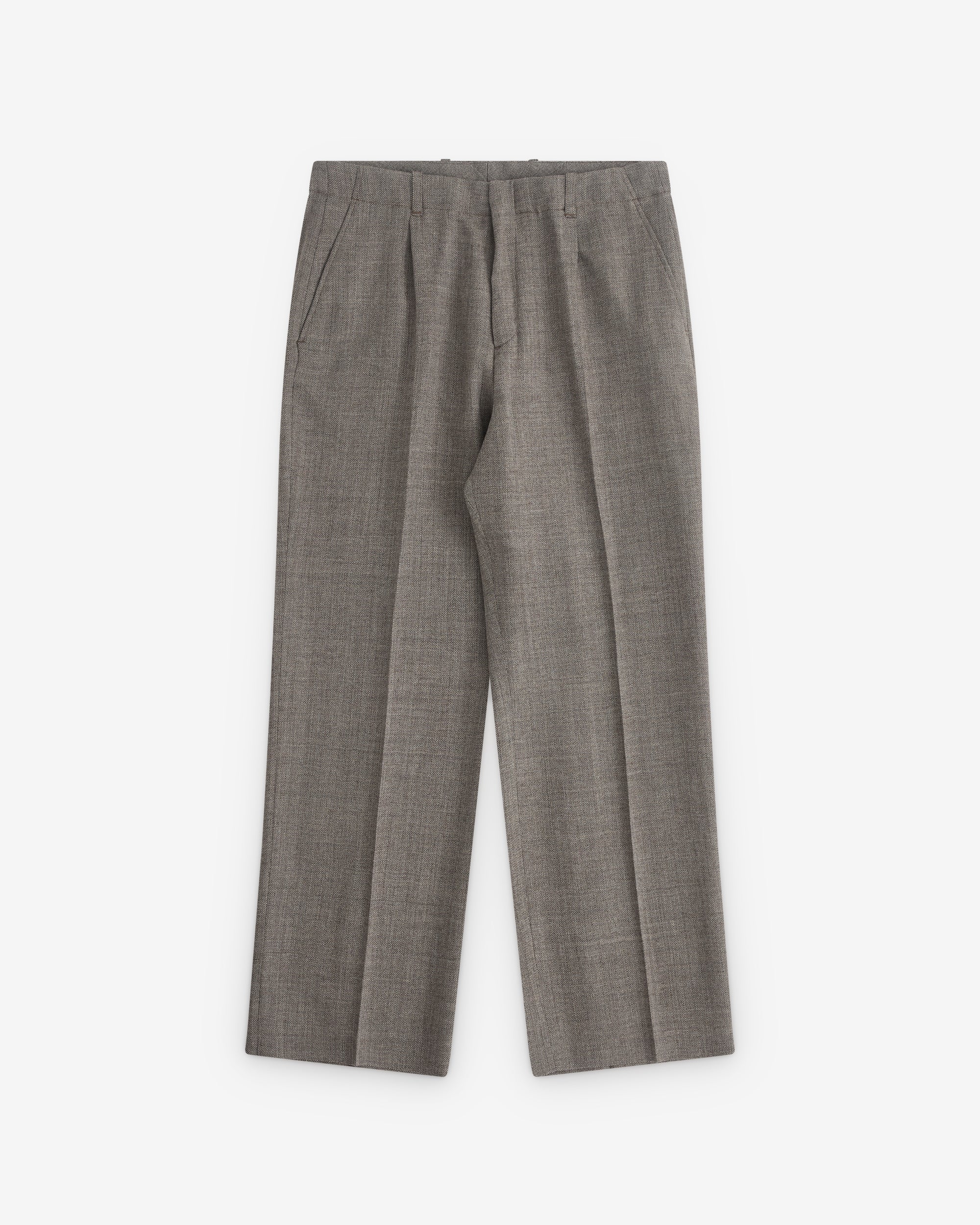 Pleated frontTwo side pocketsTwo back welt pocketsHorn buttonsYKK zip flyCovered hook-and-eye waistband fasteningWide legged relaxed fit