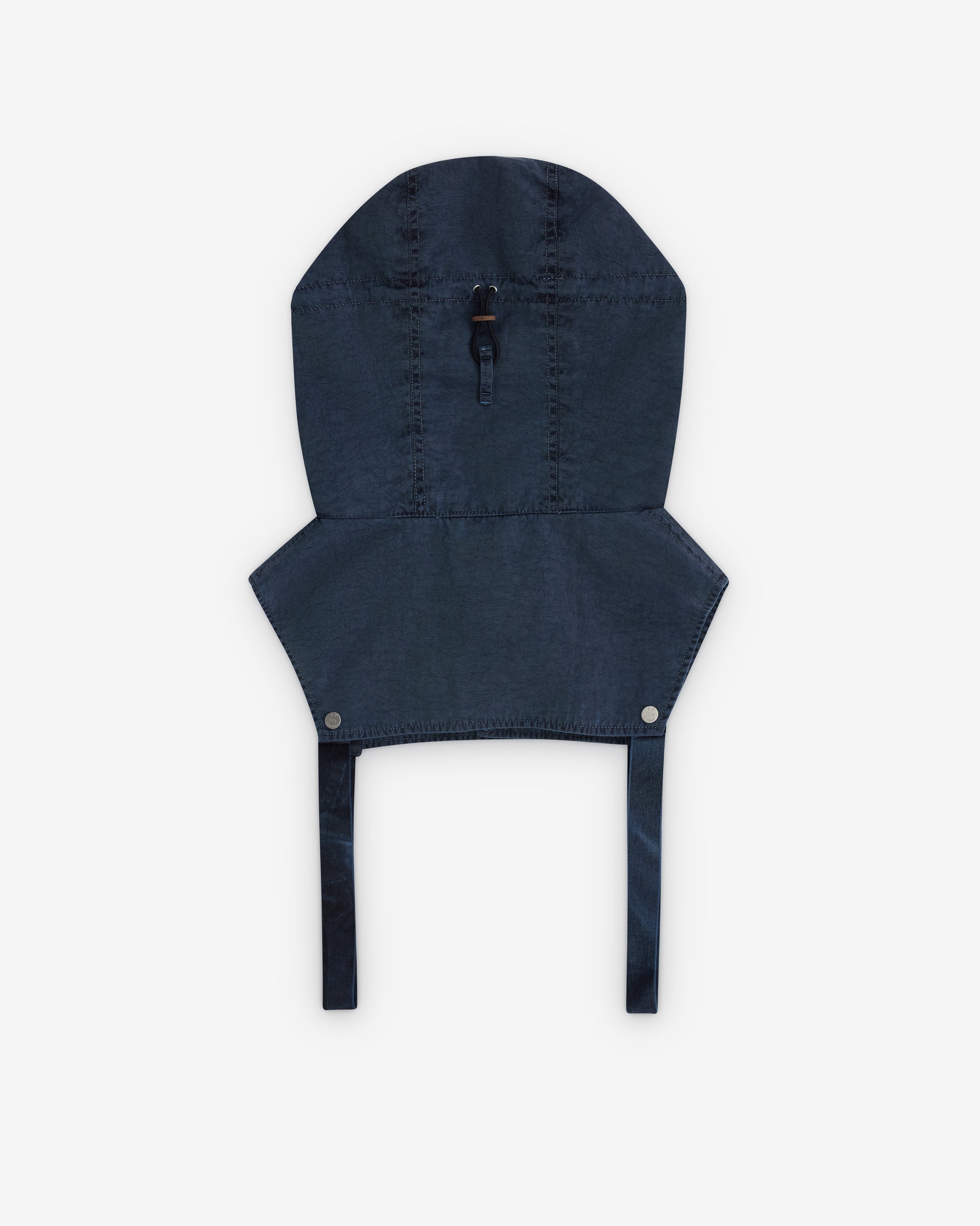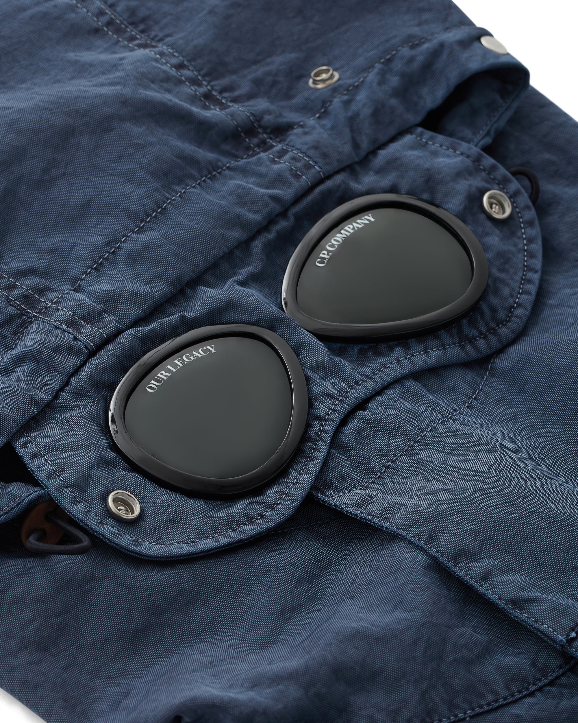 Garment dyed nylon fabricAttachable by press stud buttons to jacketAdjustable Goggle hoodPull cord details