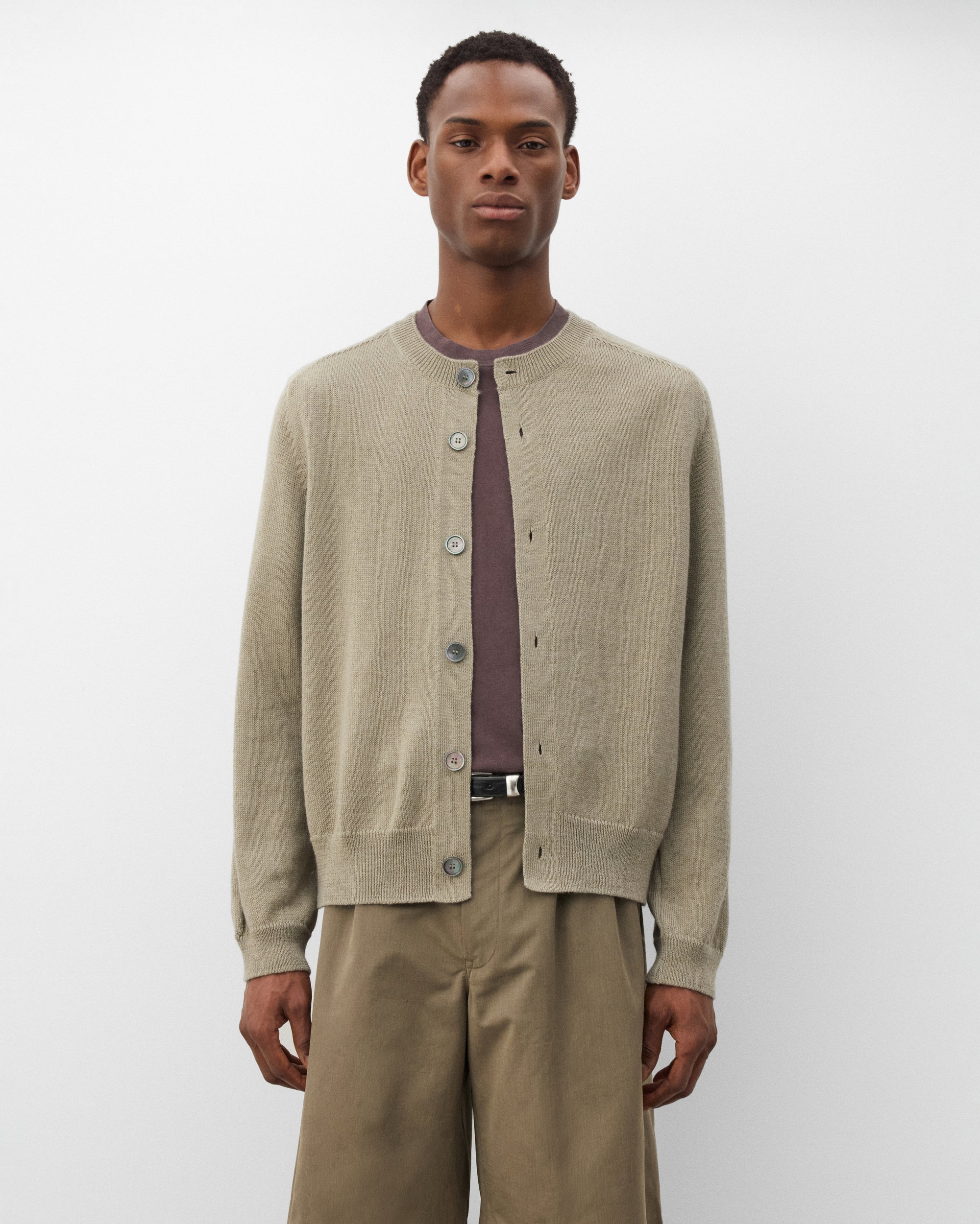 Rounded neckline Grown-on placket Integrally knitted buttonholesRaglan sleeve Reverse stitch detailRelaxed fit Rib knit finishes